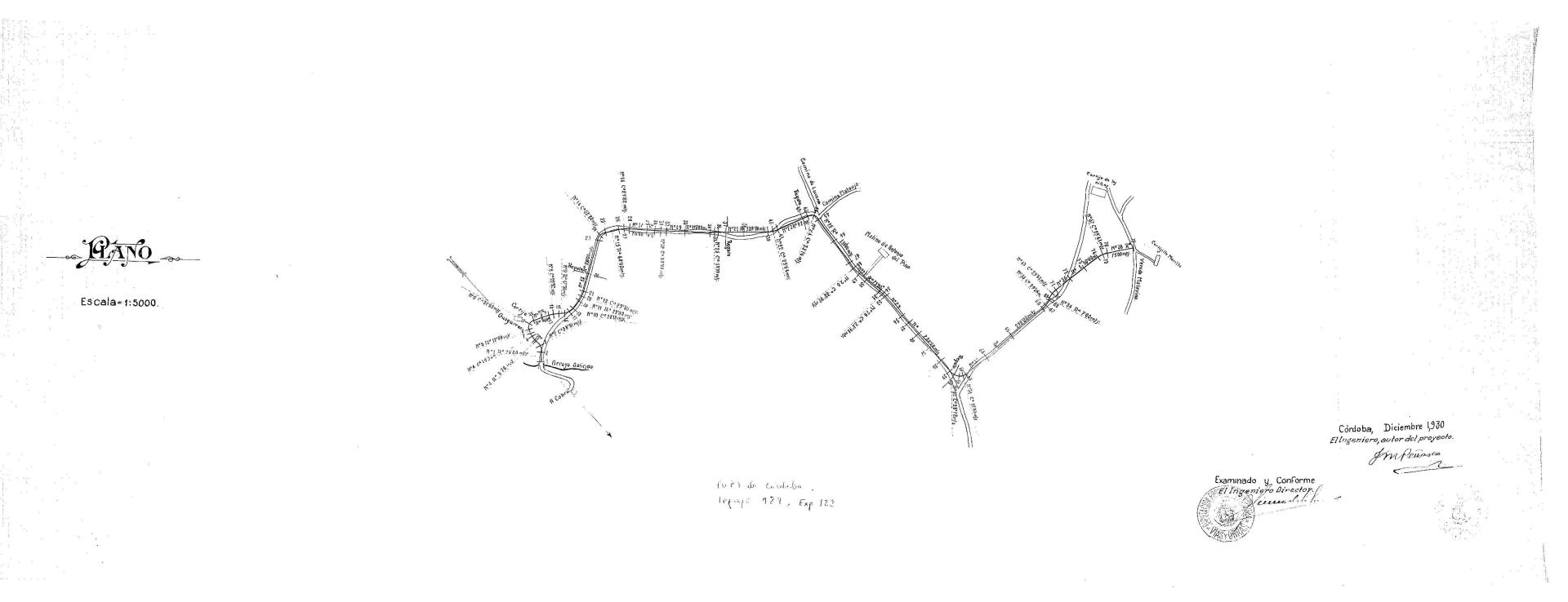 | 500 | ## | $aSe trata de un plano del trazado del camino vecinal del arroyo Galindo a la vereda Matavinos en el término de Cabra | 500 | ## | $aCon flecha de orientación señalando al SE | 500 | ## | $aAparece: el camino a Cabra, el arroyo Galindo, regatos, cortijo Guzgurrea, camino Mataojo, camino de Lucena, molino de Antonio del Pino, cortijo de los niños, cortijillo Morillo, vereda Matavino y el camino vecinal en proyecto | 500 | ## | $aA lo largo del trazado encontramos gran cantidad de medidas y perfiles transversales numerados | 500 | ## | $aAngulo inferior derecho con lugar, fecha y firmas: Córdoba, Diciembre de 1930; fdo. el Ingeniero autor del proyecto J M Peñasco; examinado y conformado por el Ingeniero Director Jiménez de la Cruz y sello en tinta de la Diputación Provincial de Córdoba, Vías y Obras |