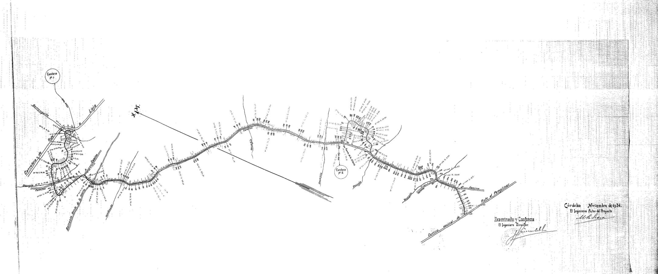 | 500 | ## | $aAtravesado por una flecha de orientación NM señalando al NW | 500 | ## | $aAparece: la carretera de Rute a Loja, barrancos, desagües, barranco Hondo de la Huerta, canteras, hondonada, casas, caminos, camino vecinal de Rute al Pamplinar y el camino vecinal en proyecto | 500 | ## | $aSe señala la distancia a la zona de extracción | 500 | ## | $aEn el trazado encontramos numerosas medidas y perfiles transversales numerados | 500 | ## | $aAngulo inferior derecho con lugar, fecha y firma: Córdoba, Noviembre de 1931; fdo. el Ingeniero autor del proyecto M Cabrera; examinado y conforme del Ingeniero Director Jiménez de la Cruz y sello en tinta de la Diputación Provincial de Córdoba, Vías y Obras |