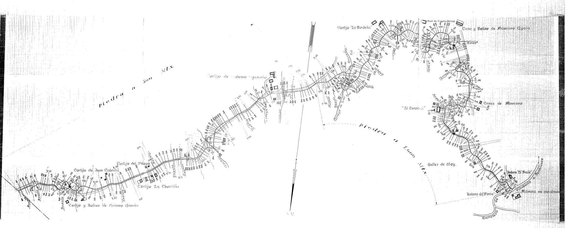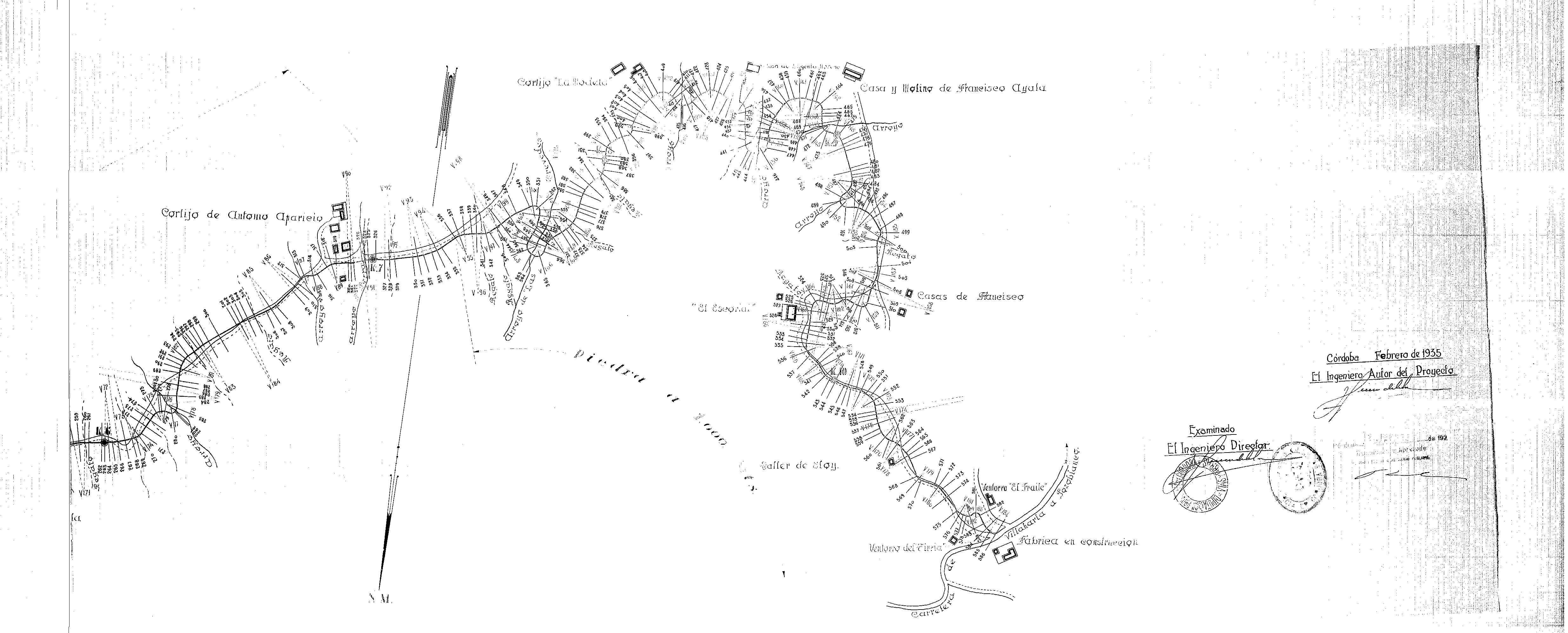 | 500 | ## | $aCon dos flechas de orientación NM | 500 | ## | $aRealizado en dos secciones debido a la falta de espacio | 500 | ## | $aAparece: la carretera de Córdoba a Almadén, venta Jarales, arroyo Tamujoso, casa de Miguel Caballero, regatos, vereda a Las Cuatro Casillas, camino a La Molinilla, vereda del Barranco, arroyo de La Molinilla, paraje Cuatro Casillas, casa de Francisco Charro, molino de Blas Rodríguez, molino del Recio, casa de Felipo, casa de Antonio Aparicio, cerca de piedra, zonas de extracción del material, arroyo del Lobo, cortijo de Juan Cabrera, cortijo y molino de Ciriaco García, cortijos La Chorrilla, del Palomo, La Modeta y El Escorial, arroyo de Las Trevedes, casa de Eugenio Moreno, casa y molino de Francisco Ayala, paraje Taller de Eloy, ventorro El Fraile, fábrica en construcción, ventorro del Tirria, carretera de Villaharta a Pozoblanco y el camino vecinal en proyecto | 500 | ## | $aEn el trazado encontramos numerosas medidas, distancias kilométricas y perfiles transversales numerados | 500 | ## | $aSe señala el tipo de material a extraer así como la distancia de la zona de extracción al camino | 500 | ## | $aAngulo inferior derecho con lugar, fecha y firma: Córdoba, Febrero de 1935; fdo. el Ingeniero autor del proyecto Jiménez de la Cruz; examinado del Ingeniero Director Jiménez de la Cruz y sello en tinta de la Diputación Provincial de Córdoba, Vías y Obras; y Córdoba 28 de Febrero de 1935, examinado y aprobado por el Ingeniero Jefe de Obras Públicas (ilegible) y sello en tinta de Obras Públicas, Provincia de Córdoba |