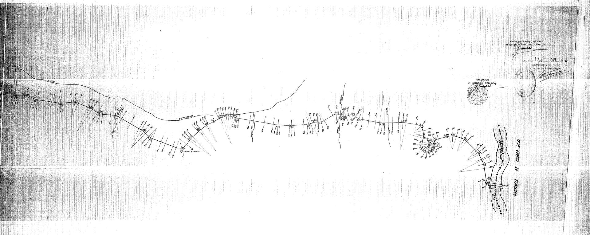 | 500 | ## | $aSin flecha de orientación | 500 | ## | $aRealizado en dos secciones debido a la falta de espacio | 500 | ## | $aAparece: el camino vecinal de Villanueva de Córdoba, ermita de la Virgen de Gracia, parte del núcleo urbano de Torrecampo, camino vecinal a Pozoblanco, arroyo Matadero, camino vecinal a El Guijo, arroyo Ropereza, camino al Pozo de la Villa, laguna de Cobos, tejar, regajos, arroyo Garranchosa, puente, camino al Santuario, cortijo Márquez, arroyo Tamujoso, río Guadalmez, línea límite con la provincia de Ciudad Real y el camino vecinal en proyecto | 500 | ## | $aEn el trazado encontramos numerosas medidas, distancias kilométricas y perfiles transversales numerados | 500 | ## | $aAngulo superior derecho con lugar, fecha y firma: Córdoba, 7 Abril de 1949; fdo. el Ingeniero autor del proyecto Jiménez de la Cruz; examinado del Ingeniero Director Jiménez de la Cruz y sello en tinta de la Diputación Provincial de Córdoba, Vías y Obras; y Córdoba 13 de Abril de 1949, examinado y aprobado por el Ingeniero Jefe de Obras Públicas Santaella y sello en tinta de Obras Públicas, Provincia de Córdoba |