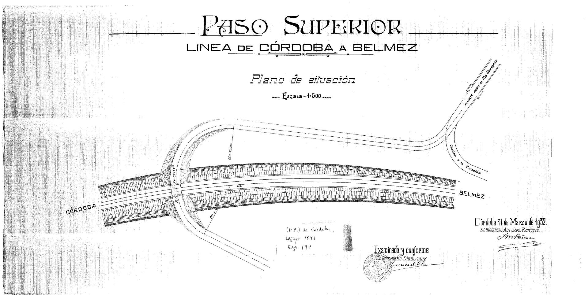 | 500 | ## | $aSin flecha de orientación | 500 | ## | $aAparece: línea de ferrocarril de Córdoba a Belmez, puente sobre el río Guadiato, camino a la Estación de Belmez, terraplenes y paso superior en proyecto | 500 | ## | $aEn el trazado encontramos medidas | 500 | ## | $aAngulo inferior derecho con lugar, fecha y firma: Córdobaa, 31 de Marzo de 1932; fdo. el Ingeniero autor del proyecto J M Peñasco; examinado y conforme del Ingeniero Director Jiménez de la Cruz y sello en tinta de la Diputación Provincial de Córdoba, Vías y Obras |