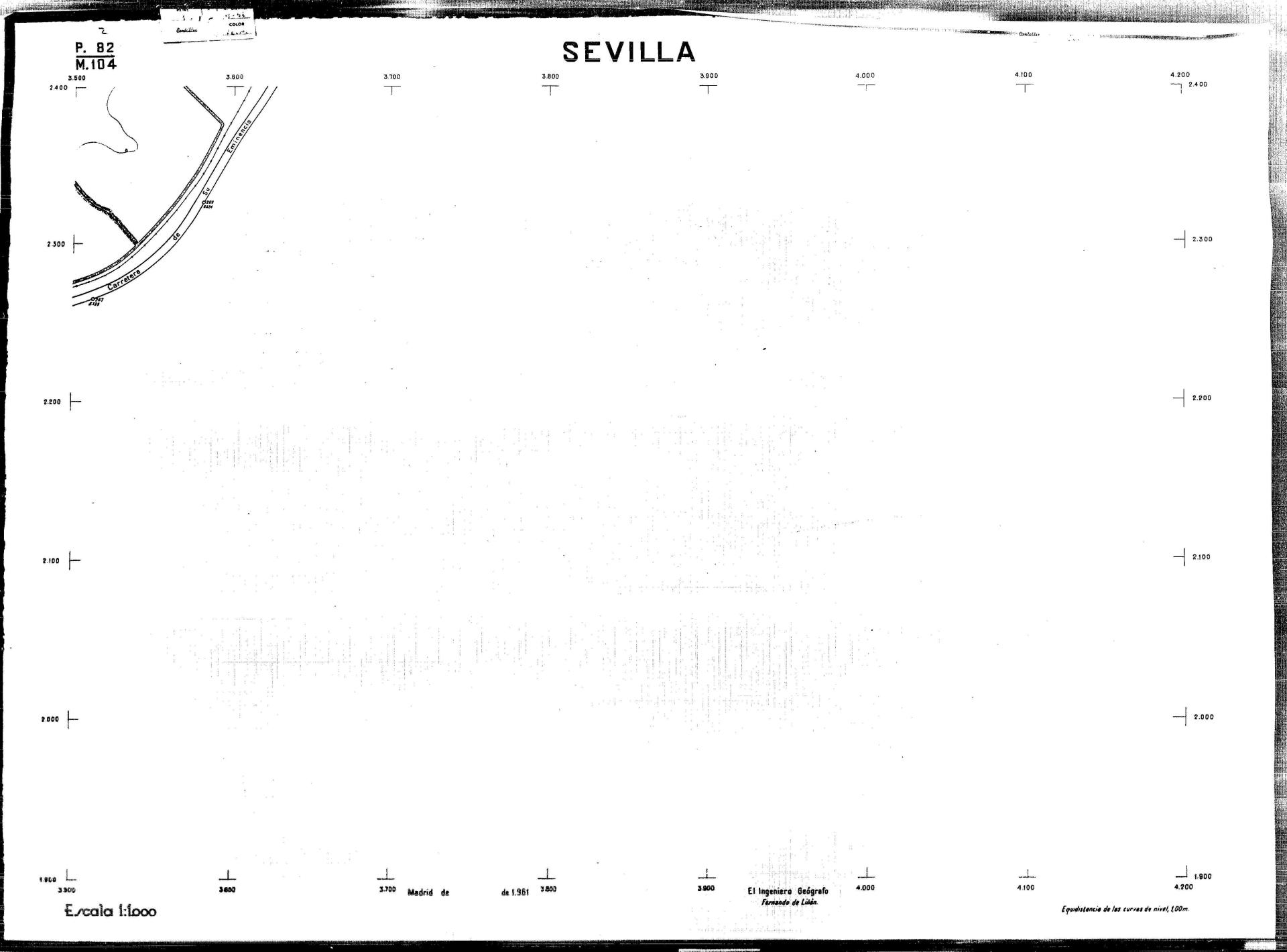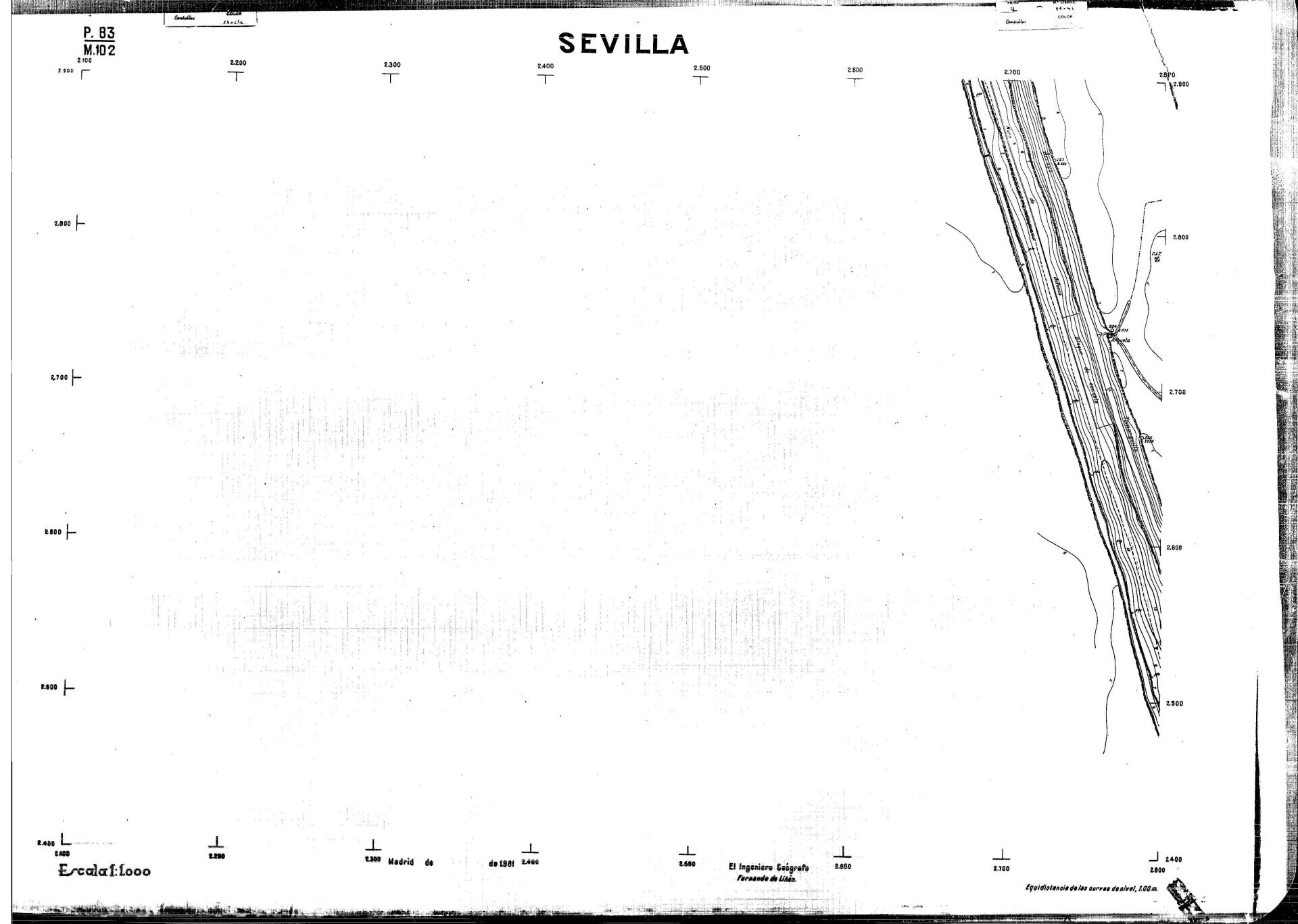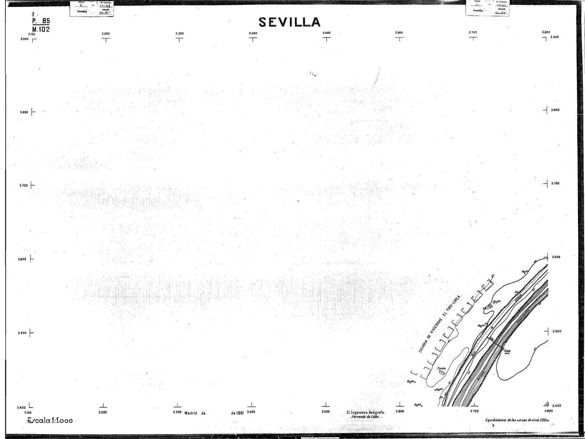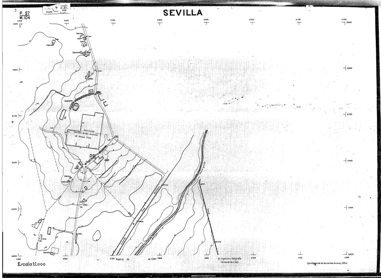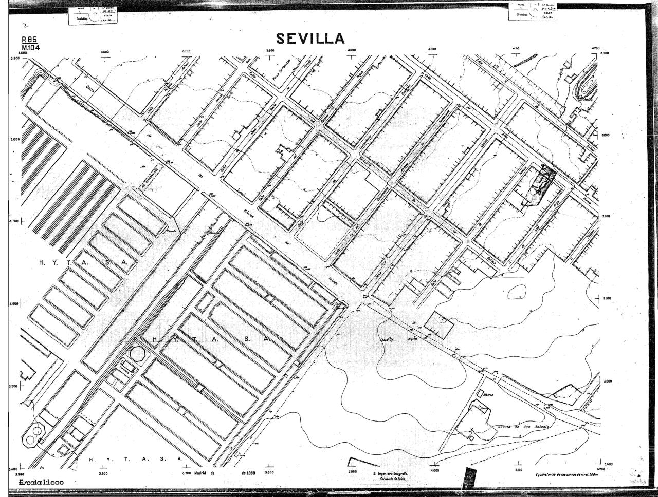 | 500 | ## | $aPlano de la zona Este de Sevilla compuesto por 70 hojas, incluyendo la hoja de composición del plano a escala 1:25000; recoge el viario identificando las calles; cada hoja indica la referencia de la cuadricula de la hoja de composición y señala en una nota "Equidistancia de las curvas de nivel, 1.00 m. | 500 | ## | $aHoja P.82/M.102, sector limitado por el muro de contención la línea del ferrocarril Madrid-Cádiz y la carretera de Su Eminencia; Hoja P.82/M.103, sector limitado por el muro de contención y la carretera de Su Eminencia; Hoja P.82/M104, recoge parte de la carretera de Su Eminencia; Hoja P.83/M.102, recoge parte del muro de contención y el arroyo Tamarguillo; Hoja P.83/M.103, recoge el arroyo del Tamarguillo y terrenos colindantes; Hoja P.83/M.104, recoge la carretera de Su Eminencia, la línea del ferrocarril Sevilla-Carmona y la autopista de la Universidad Laboral; Hoja P.84/M.102, recoge parte del arroyo del Tamarguillo y el muro de contención; Hoja P.84/M.103, recoge la línea del ferrocarril Sevilla-Alcalá de Guadaira y Carmona y la autopista de la Universidad Laboral; Hoja P.84/M.104, sector limitado por la autopista de la Universidad Laboral, la carretera de Su Eminencia y el complejo industrial de HYTASA; Hoja P.85/M.102, recoge el arroyo del Tamarguillo, el barrio del Tiro de Línea y el muro de contención; Hoja P.85/M.103, recoge el arroyo del Tamarguillo, la autopista de la Universidad Laboral y la línea del ferrocarril Sevilla-Carmona; P.85/M.104, recoge la zona industrial de HYTASA y el Cerro del Aguila; Hoja P.85/M.105, sector limitado por las calles Maqueda, Bucarelli, José Sarabia y Corte; Hoja P.86/M103, recoge el matadero municipal y las calles Juan de Herrera y Santuario de la Cabeza; Hoja P.86/M.104, recoge el arroyo del Tamarguillo y el barrio del Cerro del Aguila; Hoja P.86/M.105, recoge la carretera de Su Eminencia, un canal y unas viviendas; Hoja P.86/M.106, recoge la carretera de Su Eminencia; Hoja P.87/M.104, recoge el arroyo del Tamarguillo, los barrios Santa Teresa y Amate, y la emisora de Radio Nacional de España; Hoja P.87/M.105, recoge el cine Candelaria, un arroyo, dos canales y un camino; Hoja P.87/M.106, recoge parte de la carretera Sevilla-Dos Hermanas; Hoja P.88/M.104, recoge el arroyo el Tamarguillo, los barrios de Nuestra Señora de la Candelaria y de los Pájaros; Hoja P.88/M.105, recoge el barrio de Los Pájaros, un cortijo, una fábrica y un canal; Hoja P.88/106, recoge la carretera de Su Eminencia y el barrio de Jesús, María y José; Hoja P.89/M.104, recoge el arroyo del Tamarguillo, el barrio de Los Pájaros, la carretera Sevilla-Carmona y los restos del acueducto romano; Hoja P.89/M.105, los barrios de La Candelaria y Santa Aurelia, el cuartel de San Fernando y la carretera Sevilla-Carmona; Hoja P.89/M.106, recoge el barrio de Santa Aurelia, la ronda de circunvalación, la carretera Sevilla-Carmona, el cuartel de San Fernando y un canal; Hoja P.89/M.107, recoge parte de un viario; Hoja P.90/M.104, sector limitado por el arroyo del Tamarguillo y la carretera Amarilla; Hoja P.90/M.105, la carretera Amarilla y los terrenos adyacentes; Hoja P.90/M.106, recoge la carretera de circunvalación y un canal; Hoja P.90/M.107, recoge el arroyo de los Marañones y un canal; Hoja P.91/M.104, recoge el arroyo del Tamarguillo; Hoja P.91/M.105, recoge el barrio de Santa Clara y unas escuelas; Hoja P.91/M.106, recoge la carretera de circunvalación; Hoja P.92/M.103, recoge el arroyo del Tamarguillo; Hoja P.92/M.104, recoge la carretera de Carmona, la avda. del Aeropuerto, el barrio de Santa Clara y la fábrica de Coca-Cola; Hoja P.92/M.105, recoge el barrio de Santa Clara y la carretera de circunvalación; Hoja P.92/M.106, recoge las carreteras Amarilla y de circunvalación, y la hacienda Buena Esperanza; Hoja P.93/M.103, recoge el arroyo del Tamarguillo; Hoja P.93/M.104, recoge el barrio de Santa Clara, la avda. del Aeropuerto, la carretera Sevilla-Córdoba y la fábrica Cervecera Sevillana; Hoja P.93/M.105, recoge el barrio de Santa Clara, la avda. del Aeropuerto y la carretera de circunvalación; Hoja P.93/M.106, recoge los terrenos adyacentes a la carretera de circunvalación; Hoja P.94/M.102, recoge la línea del ferrocarril Sevilla-Cádiz, la avda. Pino Montano y el barrio de Pino Montano; Hoja P.95/M.103, recoge el arroyo del Tamarguillo, el hospital psiquiátrico y la carretera que le da acceso; Hoja P.94/M.104, recoge los terrenos adyacentes al hospital psiquiátrico; Hoja P.94/M.105, recoge un canal y el consultorio de la Gota de Leche; Hoja P.94/M.106, recoge la línea del ferrocarril Madrid-Cádiz y el barrio de los Carteros; Hoja P.95/M.103, recoge el arroyo del Tamarguillo, la avda. de Pino Montano, el barrio de Pino Montano y la carretera del hospital psiquiátrico; Hoja P.95/M.104, recoge la carretera del hospital psiquiátrico, el cortijo de Miraflores y un canal; Hoja P.95/M.105, recoge los terrenos próximos al cortijo de Miraflores; Hoja P.96/M. 102, recoge la línea del ferrocarril Madrid-Cádiz, el cementerio de San Fernando, las huertas del Buen Pastor y Molina, y una acequia; Hoja P.96/M.103, recoge la avda. de Pino Montano y las huertas de Molina y del Rosal Chico y del Pasillo de los Toros; Hoja P.96/M.104, recoge el arroyo del Tamarguillo y la avda. de Pino Montano; Hoja P.97/M.100, recoge el río Guadalquivir y el cementerio de los Ingleses; Hoja P.97/M.101, recoge el barrio de San Jerónimo, el cementerio de San Fernando, una fábrica de abonos, la carretera Sevilla-La Algaba y la línea del ferrocarril Madrid-Sevilla; Hoja P.97/M.102, recoge la línea del ferrocarril Madrid-Cádiz, la carretera de Brenes, el cementerio de San Fernando y la fábrica Viguetas Castilla; Hoja P.97/M.103, recoge los terrenos próximos a la línea del ferrocarril Madrid-Cádiz; Hoja P.97/M.104, recoge el arroyo del Tamarguillo, la avda. de Pino Montano y la hacienda Casillas de San Jerónimo de Buena Vista; Hoja P