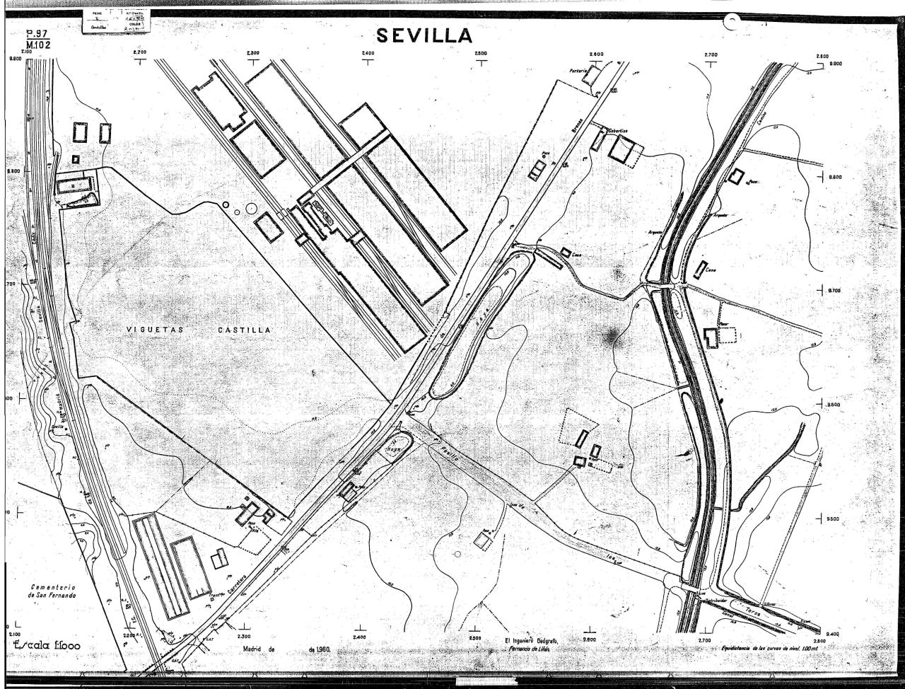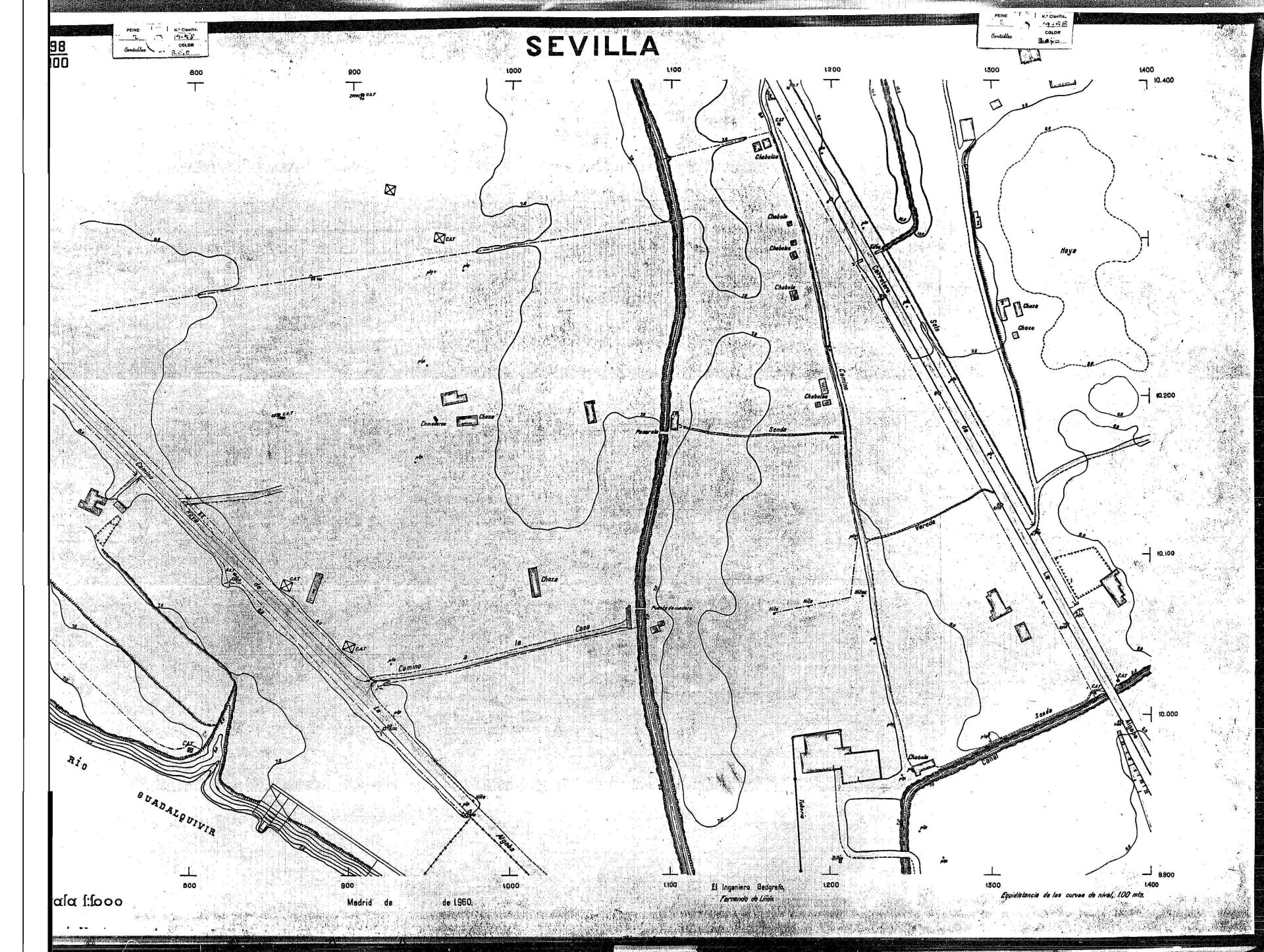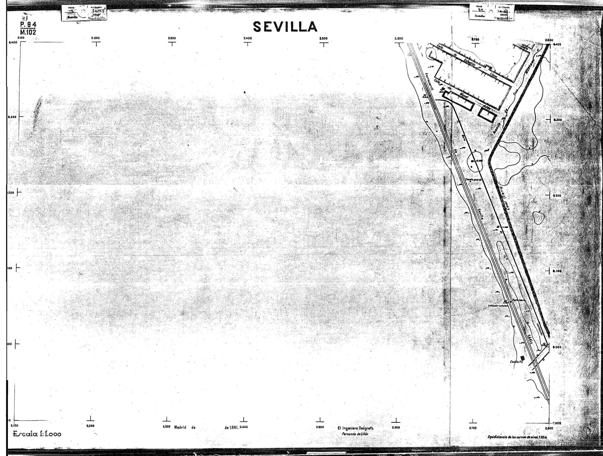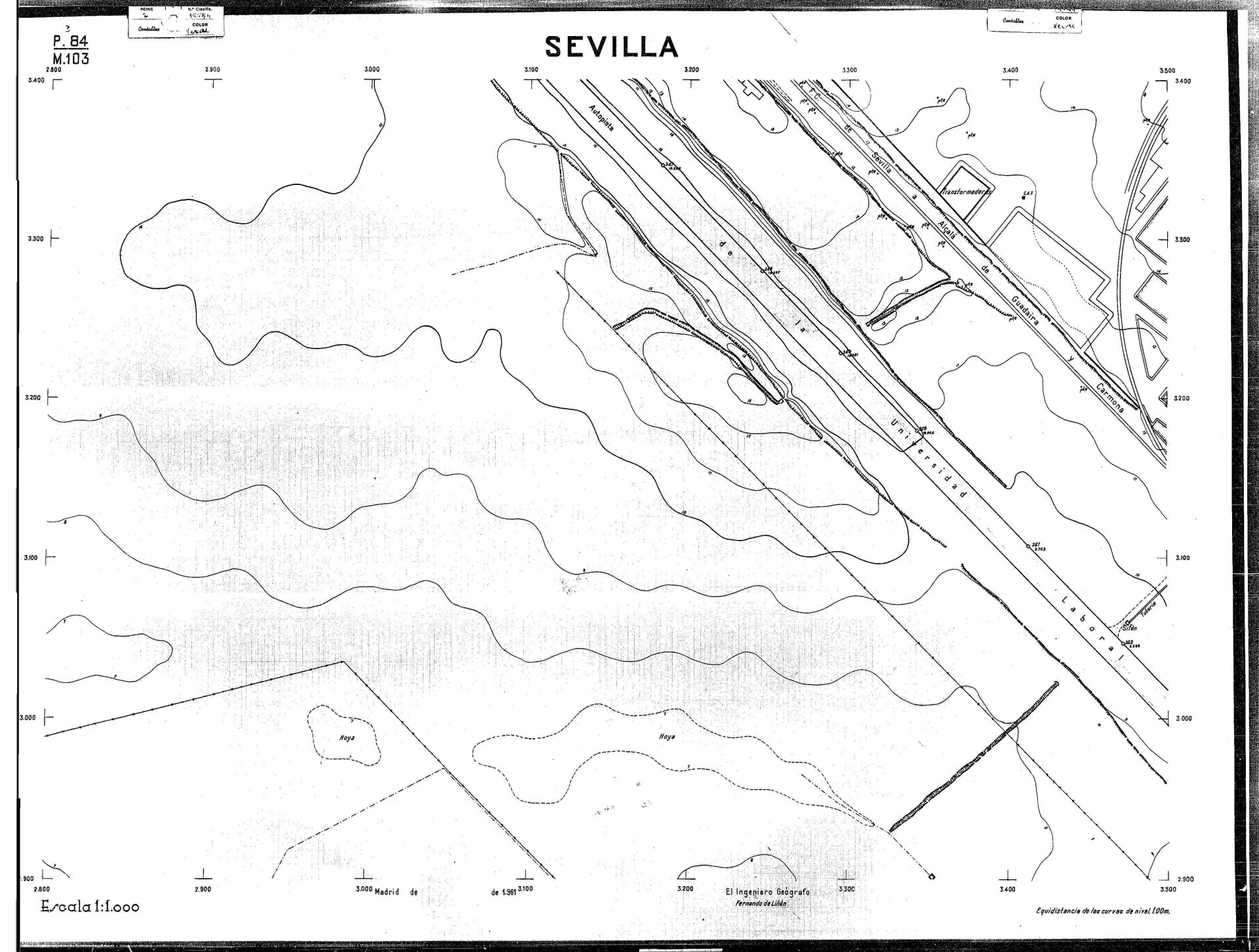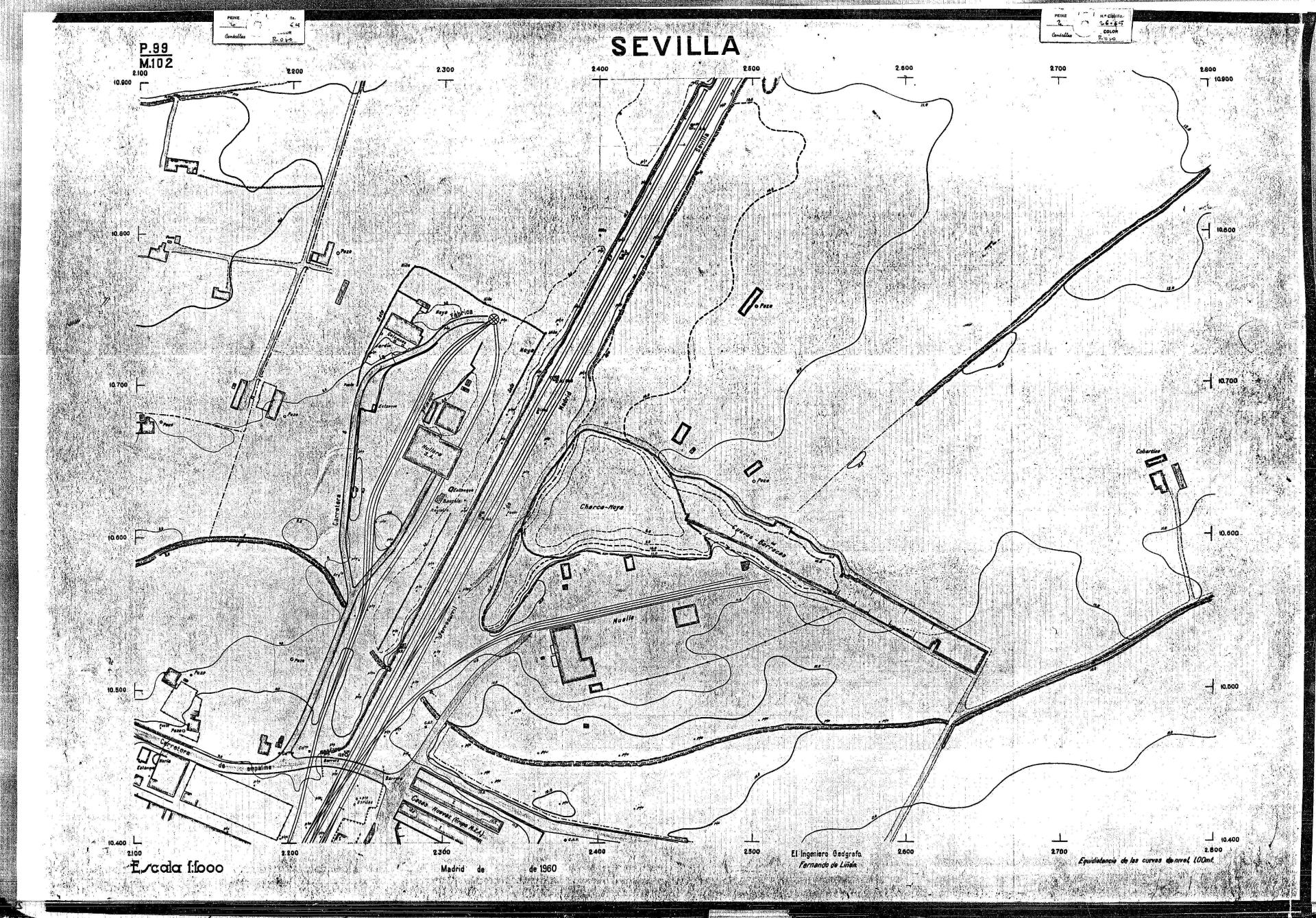 | 500 | ## | $aPlano de la zona Este de Sevilla compuesto por 70 hojas, incluyendo la hoja de composición del plano a escala 1:25000; recoge el viario identificando las calles; cada hoja indica la referencia de la cuadricula de la hoja de composición y señala en una nota "Equidistancia de las curvas de nivel, 1.00 m. | 500 | ## | $aHoja P.82/M.102, sector limitado por el muro de contención la línea del ferrocarril Madrid-Cádiz y la carretera de Su Eminencia; Hoja P.82/M.103, sector limitado por el muro de contención y la carretera de Su Eminencia; Hoja P.82/M104, recoge parte de la carretera de Su Eminencia; Hoja P.83/M.102, recoge parte del muro de contención y el arroyo Tamarguillo; Hoja P.83/M.103, recoge el arroyo del Tamarguillo y terrenos colindantes; Hoja P.83/M.104, recoge la carretera de Su Eminencia, la línea del ferrocarril Sevilla-Carmona y la autopista de la Universidad Laboral; Hoja P.84/M.102, recoge parte del arroyo del Tamarguillo y el muro de contención; Hoja P.84/M.103, recoge la línea del ferrocarril Sevilla-Alcalá de Guadaira y Carmona y la autopista de la Universidad Laboral; Hoja P.84/M.104, sector limitado por la autopista de la Universidad Laboral, la carretera de Su Eminencia y el complejo industrial de HYTASA; Hoja P.85/M.102, recoge el arroyo del Tamarguillo, el barrio del Tiro de Línea y el muro de contención; Hoja P.85/M.103, recoge el arroyo del Tamarguillo, la autopista de la Universidad Laboral y la línea del ferrocarril Sevilla-Carmona; P.85/M.104, recoge la zona industrial de HYTASA y el Cerro del Aguila; Hoja P.85/M.105, sector limitado por las calles Maqueda, Bucarelli, José Sarabia y Corte; Hoja P.86/M103, recoge el matadero municipal y las calles Juan de Herrera y Santuario de la Cabeza; Hoja P.86/M.104, recoge el arroyo del Tamarguillo y el barrio del Cerro del Aguila; Hoja P.86/M.105, recoge la carretera de Su Eminencia, un canal y unas viviendas; Hoja P.86/M.106, recoge la carretera de Su Eminencia; Hoja P.87/M.104, recoge el arroyo del Tamarguillo, los barrios Santa Teresa y Amate, y la emisora de Radio Nacional de España; Hoja P.87/M.105, recoge el cine Candelaria, un arroyo, dos canales y un camino; Hoja P.87/M.106, recoge parte de la carretera Sevilla-Dos Hermanas; Hoja P.88/M.104, recoge el arroyo el Tamarguillo, los barrios de Nuestra Señora de la Candelaria y de los Pájaros; Hoja P.88/M.105, recoge el barrio de Los Pájaros, un cortijo, una fábrica y un canal; Hoja P.88/106, recoge la carretera de Su Eminencia y el barrio de Jesús, María y José; Hoja P.89/M.104, recoge el arroyo del Tamarguillo, el barrio de Los Pájaros, la carretera Sevilla-Carmona y los restos del acueducto romano; Hoja P.89/M.105, los barrios de La Candelaria y Santa Aurelia, el cuartel de San Fernando y la carretera Sevilla-Carmona; Hoja P.89/M.106, recoge el barrio de Santa Aurelia, la ronda de circunvalación, la carretera Sevilla-Carmona, el cuartel de San Fernando y un canal; Hoja P.89/M.107, recoge parte de un viario; Hoja P.90/M.104, sector limitado por el arroyo del Tamarguillo y la carretera Amarilla; Hoja P.90/M.105, la carretera Amarilla y los terrenos adyacentes; Hoja P.90/M.106, recoge la carretera de circunvalación y un canal; Hoja P.90/M.107, recoge el arroyo de los Marañones y un canal; Hoja P.91/M.104, recoge el arroyo del Tamarguillo; Hoja P.91/M.105, recoge el barrio de Santa Clara y unas escuelas; Hoja P.91/M.106, recoge la carretera de circunvalación; Hoja P.92/M.103, recoge el arroyo del Tamarguillo; Hoja P.92/M.104, recoge la carretera de Carmona, la avda. del Aeropuerto, el barrio de Santa Clara y la fábrica de Coca-Cola; Hoja P.92/M.105, recoge el barrio de Santa Clara y la carretera de circunvalación; Hoja P.92/M.106, recoge las carreteras Amarilla y de circunvalación, y la hacienda Buena Esperanza; Hoja P.93/M.103, recoge el arroyo del Tamarguillo; Hoja P.93/M.104, recoge el barrio de Santa Clara, la avda. del Aeropuerto, la carretera Sevilla-Córdoba y la fábrica Cervecera Sevillana; Hoja P.93/M.105, recoge el barrio de Santa Clara, la avda. del Aeropuerto y la carretera de circunvalación; Hoja P.93/M.106, recoge los terrenos adyacentes a la carretera de circunvalación; Hoja P.94/M.102, recoge la línea del ferrocarril Sevilla-Cádiz, la avda. Pino Montano y el barrio de Pino Montano; Hoja P.95/M.103, recoge el arroyo del Tamarguillo, el hospital psiquiátrico y la carretera que le da acceso; Hoja P.94/M.104, recoge los terrenos adyacentes al hospital psiquiátrico; Hoja P.94/M.105, recoge un canal y el consultorio de la Gota de Leche; Hoja P.94/M.106, recoge la línea del ferrocarril Madrid-Cádiz y el barrio de los Carteros; Hoja P.95/M.103, recoge el arroyo del Tamarguillo, la avda. de Pino Montano, el barrio de Pino Montano y la carretera del hospital psiquiátrico; Hoja P.95/M.104, recoge la carretera del hospital psiquiátrico, el cortijo de Miraflores y un canal; Hoja P.95/M.105, recoge los terrenos próximos al cortijo de Miraflores; Hoja P.96/M. 102, recoge la línea del ferrocarril Madrid-Cádiz, el cementerio de San Fernando, las huertas del Buen Pastor y Molina, y una acequia; Hoja P.96/M.103, recoge la avda. de Pino Montano y las huertas de Molina y del Rosal Chico y del Pasillo de los Toros; Hoja P.96/M.104, recoge el arroyo del Tamarguillo y la avda. de Pino Montano; Hoja P.97/M.100, recoge el río Guadalquivir y el cementerio de los Ingleses; Hoja P.97/M.101, recoge el barrio de San Jerónimo, el cementerio de San Fernando, una fábrica de abonos, la carretera Sevilla-La Algaba y la línea del ferrocarril Madrid-Sevilla; Hoja P.97/M.102, recoge la línea del ferrocarril Madrid-Cádiz, la carretera de Brenes, el cementerio de San Fernando y la fábrica Viguetas Castilla; Hoja P.97/M.103, recoge los terrenos próximos a la línea del ferrocarril Madrid-Cádiz; Hoja P.97/M.104, recoge el arroyo del Tamarguillo, la avda. de Pino Montano y la hacienda Casillas de San Jerónimo de Buena Vista; Hoja P