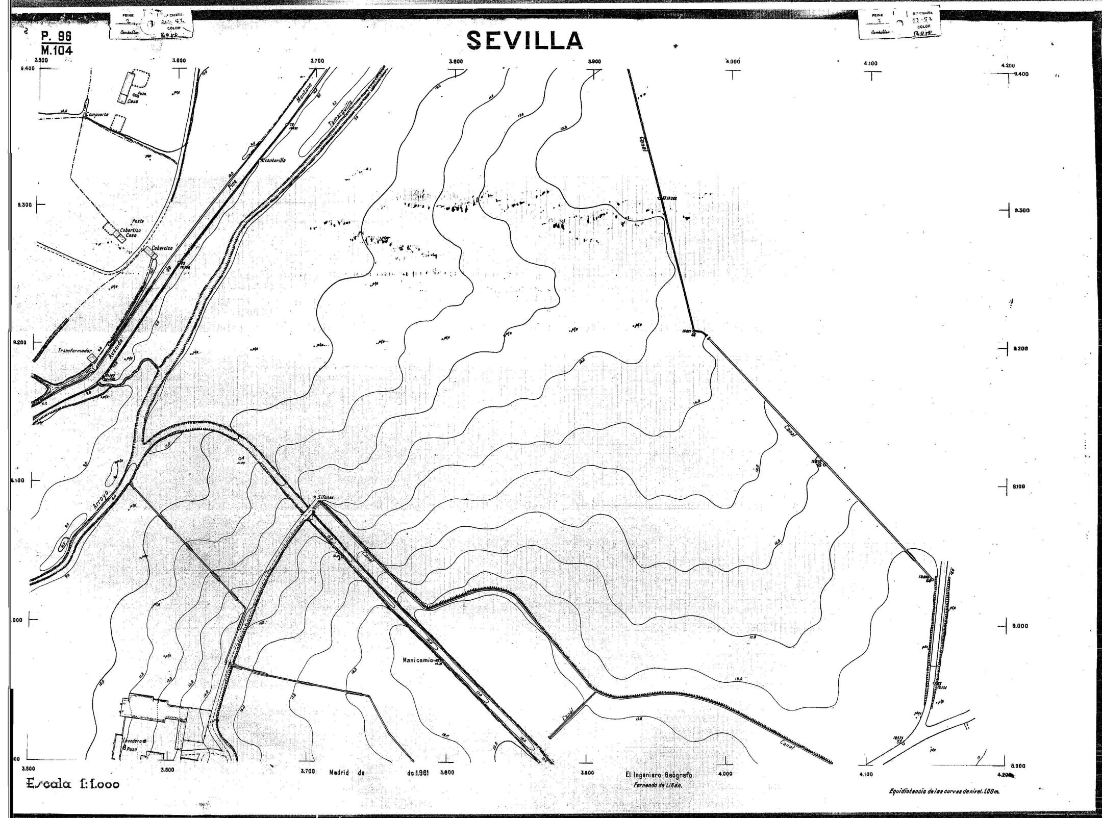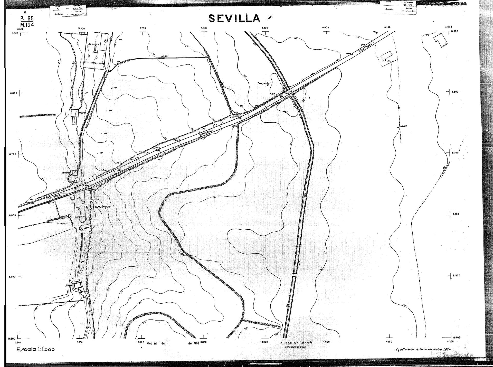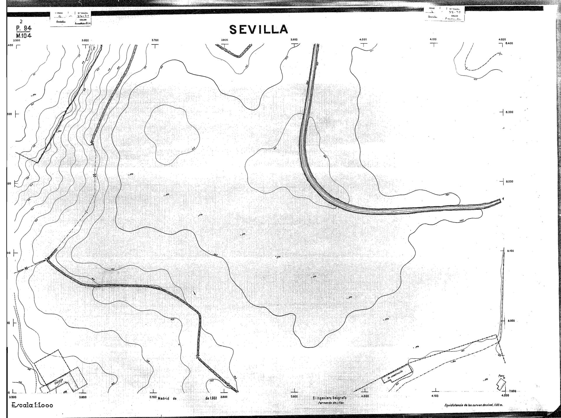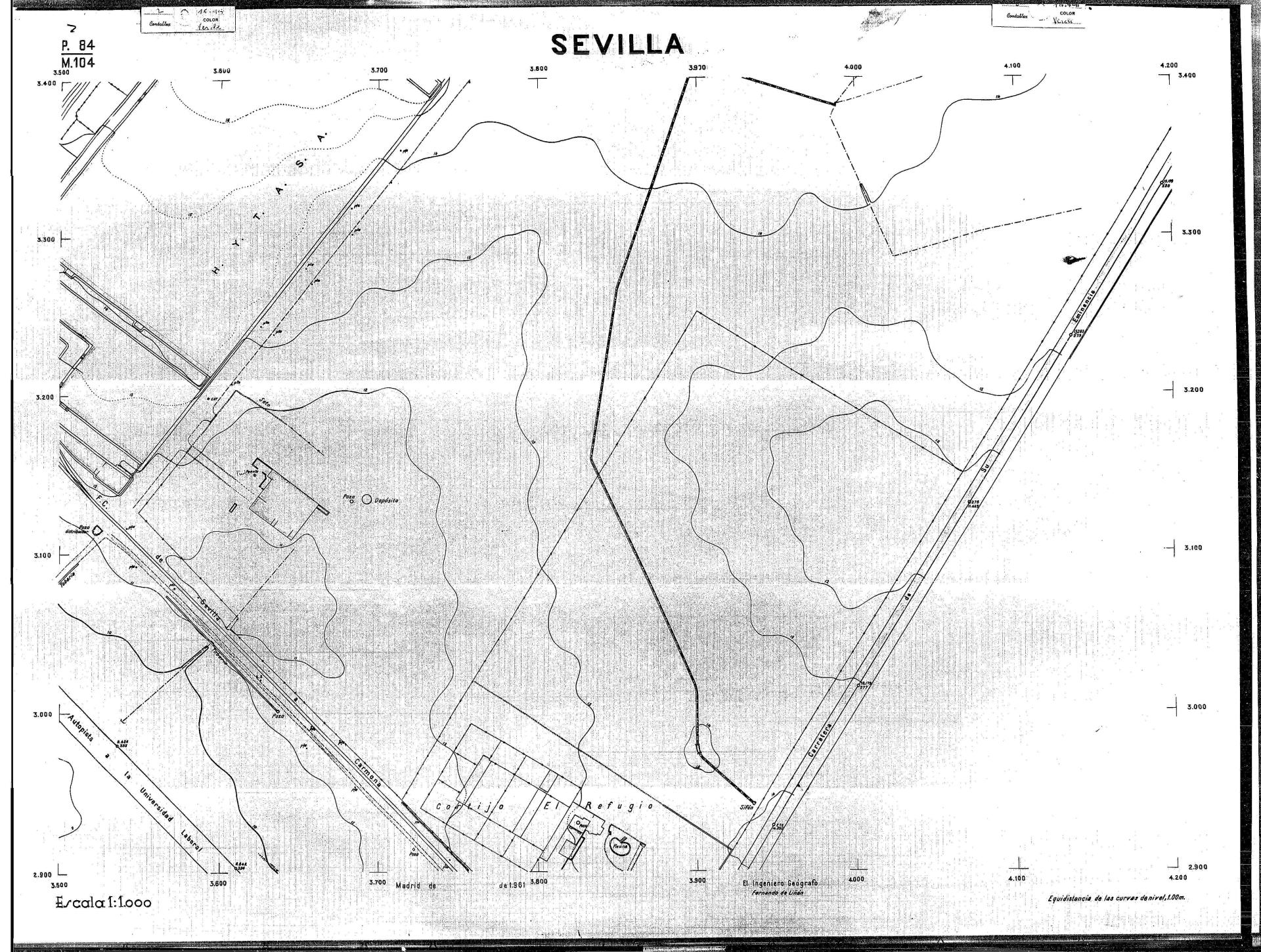 | 500 | ## | $aPlano de la zona Este de Sevilla compuesto por 70 hojas, incluyendo la hoja de composición del plano a escala 1:25000; recoge el viario identificando las calles; cada hoja indica la referencia de la cuadricula de la hoja de composición y señala en una nota "Equidistancia de las curvas de nivel, 1.00 m. | 500 | ## | $aHoja P.82/M.102, sector limitado por el muro de contención la línea del ferrocarril Madrid-Cádiz y la carretera de Su Eminencia; Hoja P.82/M.103, sector limitado por el muro de contención y la carretera de Su Eminencia; Hoja P.82/M104, recoge parte de la carretera de Su Eminencia; Hoja P.83/M.102, recoge parte del muro de contención y el arroyo Tamarguillo; Hoja P.83/M.103, recoge el arroyo del Tamarguillo y terrenos colindantes; Hoja P.83/M.104, recoge la carretera de Su Eminencia, la línea del ferrocarril Sevilla-Carmona y la autopista de la Universidad Laboral; Hoja P.84/M.102, recoge parte del arroyo del Tamarguillo y el muro de contención; Hoja P.84/M.103, recoge la línea del ferrocarril Sevilla-Alcalá de Guadaira y Carmona y la autopista de la Universidad Laboral; Hoja P.84/M.104, sector limitado por la autopista de la Universidad Laboral, la carretera de Su Eminencia y el complejo industrial de HYTASA; Hoja P.85/M.102, recoge el arroyo del Tamarguillo, el barrio del Tiro de Línea y el muro de contención; Hoja P.85/M.103, recoge el arroyo del Tamarguillo, la autopista de la Universidad Laboral y la línea del ferrocarril Sevilla-Carmona; P.85/M.104, recoge la zona industrial de HYTASA y el Cerro del Aguila; Hoja P.85/M.105, sector limitado por las calles Maqueda, Bucarelli, José Sarabia y Corte; Hoja P.86/M103, recoge el matadero municipal y las calles Juan de Herrera y Santuario de la Cabeza; Hoja P.86/M.104, recoge el arroyo del Tamarguillo y el barrio del Cerro del Aguila; Hoja P.86/M.105, recoge la carretera de Su Eminencia, un canal y unas viviendas; Hoja P.86/M.106, recoge la carretera de Su Eminencia; Hoja P.87/M.104, recoge el arroyo del Tamarguillo, los barrios Santa Teresa y Amate, y la emisora de Radio Nacional de España; Hoja P.87/M.105, recoge el cine Candelaria, un arroyo, dos canales y un camino; Hoja P.87/M.106, recoge parte de la carretera Sevilla-Dos Hermanas; Hoja P.88/M.104, recoge el arroyo el Tamarguillo, los barrios de Nuestra Señora de la Candelaria y de los Pájaros; Hoja P.88/M.105, recoge el barrio de Los Pájaros, un cortijo, una fábrica y un canal; Hoja P.88/106, recoge la carretera de Su Eminencia y el barrio de Jesús, María y José; Hoja P.89/M.104, recoge el arroyo del Tamarguillo, el barrio de Los Pájaros, la carretera Sevilla-Carmona y los restos del acueducto romano; Hoja P.89/M.105, los barrios de La Candelaria y Santa Aurelia, el cuartel de San Fernando y la carretera Sevilla-Carmona; Hoja P.89/M.106, recoge el barrio de Santa Aurelia, la ronda de circunvalación, la carretera Sevilla-Carmona, el cuartel de San Fernando y un canal; Hoja P.89/M.107, recoge parte de un viario; Hoja P.90/M.104, sector limitado por el arroyo del Tamarguillo y la carretera Amarilla; Hoja P.90/M.105, la carretera Amarilla y los terrenos adyacentes; Hoja P.90/M.106, recoge la carretera de circunvalación y un canal; Hoja P.90/M.107, recoge el arroyo de los Marañones y un canal; Hoja P.91/M.104, recoge el arroyo del Tamarguillo; Hoja P.91/M.105, recoge el barrio de Santa Clara y unas escuelas; Hoja P.91/M.106, recoge la carretera de circunvalación; Hoja P.92/M.103, recoge el arroyo del Tamarguillo; Hoja P.92/M.104, recoge la carretera de Carmona, la avda. del Aeropuerto, el barrio de Santa Clara y la fábrica de Coca-Cola; Hoja P.92/M.105, recoge el barrio de Santa Clara y la carretera de circunvalación; Hoja P.92/M.106, recoge las carreteras Amarilla y de circunvalación, y la hacienda Buena Esperanza; Hoja P.93/M.103, recoge el arroyo del Tamarguillo; Hoja P.93/M.104, recoge el barrio de Santa Clara, la avda. del Aeropuerto, la carretera Sevilla-Córdoba y la fábrica Cervecera Sevillana; Hoja P.93/M.105, recoge el barrio de Santa Clara, la avda. del Aeropuerto y la carretera de circunvalación; Hoja P.93/M.106, recoge los terrenos adyacentes a la carretera de circunvalación; Hoja P.94/M.102, recoge la línea del ferrocarril Sevilla-Cádiz, la avda. Pino Montano y el barrio de Pino Montano; Hoja P.95/M.103, recoge el arroyo del Tamarguillo, el hospital psiquiátrico y la carretera que le da acceso; Hoja P.94/M.104, recoge los terrenos adyacentes al hospital psiquiátrico; Hoja P.94/M.105, recoge un canal y el consultorio de la Gota de Leche; Hoja P.94/M.106, recoge la línea del ferrocarril Madrid-Cádiz y el barrio de los Carteros; Hoja P.95/M.103, recoge el arroyo del Tamarguillo, la avda. de Pino Montano, el barrio de Pino Montano y la carretera del hospital psiquiátrico; Hoja P.95/M.104, recoge la carretera del hospital psiquiátrico, el cortijo de Miraflores y un canal; Hoja P.95/M.105, recoge los terrenos próximos al cortijo de Miraflores; Hoja P.96/M. 102, recoge la línea del ferrocarril Madrid-Cádiz, el cementerio de San Fernando, las huertas del Buen Pastor y Molina, y una acequia; Hoja P.96/M.103, recoge la avda. de Pino Montano y las huertas de Molina y del Rosal Chico y del Pasillo de los Toros; Hoja P.96/M.104, recoge el arroyo del Tamarguillo y la avda. de Pino Montano; Hoja P.97/M.100, recoge el río Guadalquivir y el cementerio de los Ingleses; Hoja P.97/M.101, recoge el barrio de San Jerónimo, el cementerio de San Fernando, una fábrica de abonos, la carretera Sevilla-La Algaba y la línea del ferrocarril Madrid-Sevilla; Hoja P.97/M.102, recoge la línea del ferrocarril Madrid-Cádiz, la carretera de Brenes, el cementerio de San Fernando y la fábrica Viguetas Castilla; Hoja P.97/M.103, recoge los terrenos próximos a la línea del ferrocarril Madrid-Cádiz; Hoja P.97/M.104, recoge el arroyo del Tamarguillo, la avda. de Pino Montano y la hacienda Casillas de San Jerónimo de Buena Vista; Hoja P