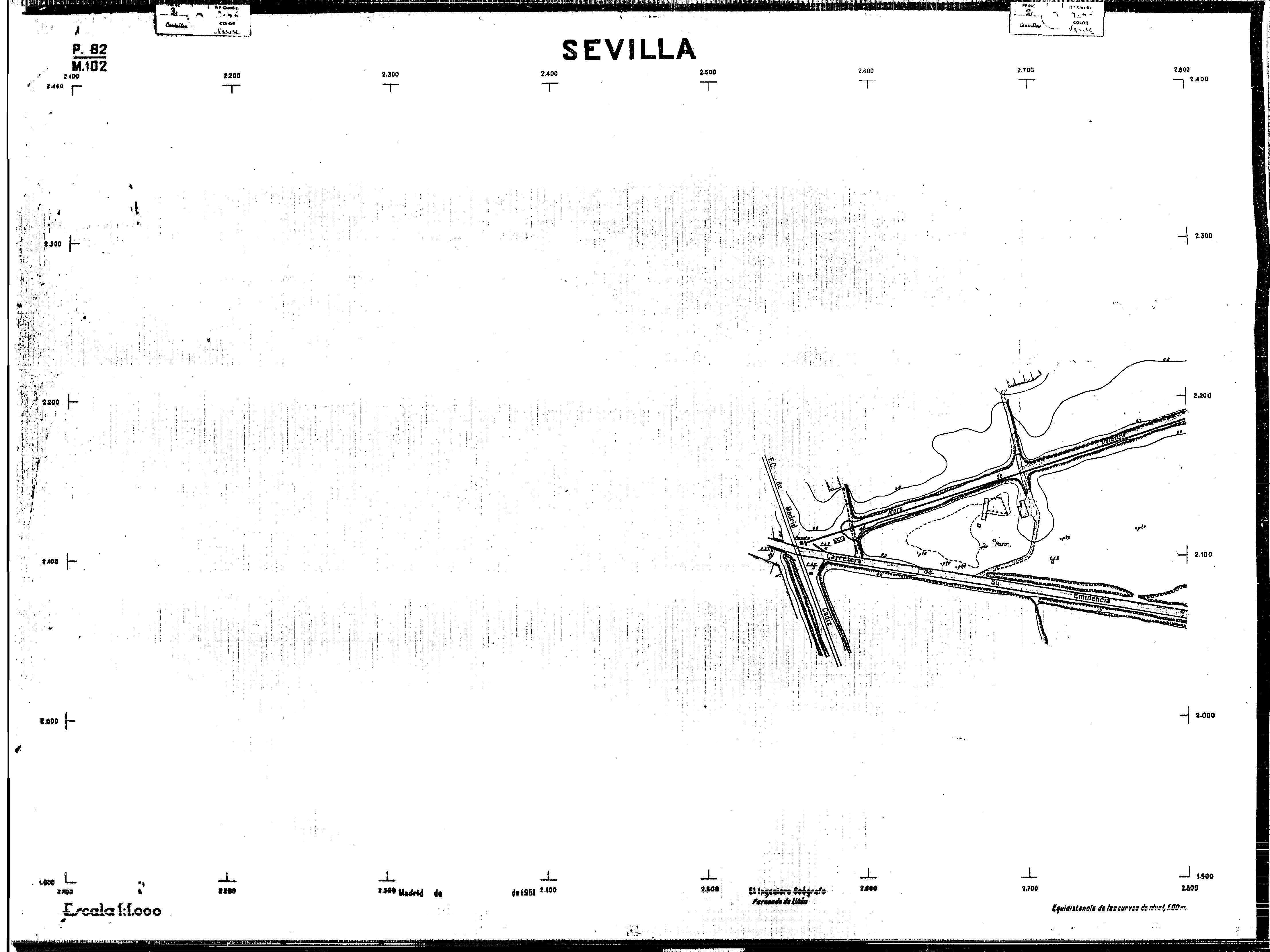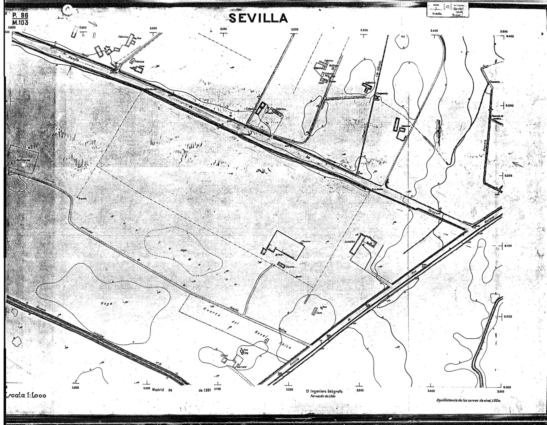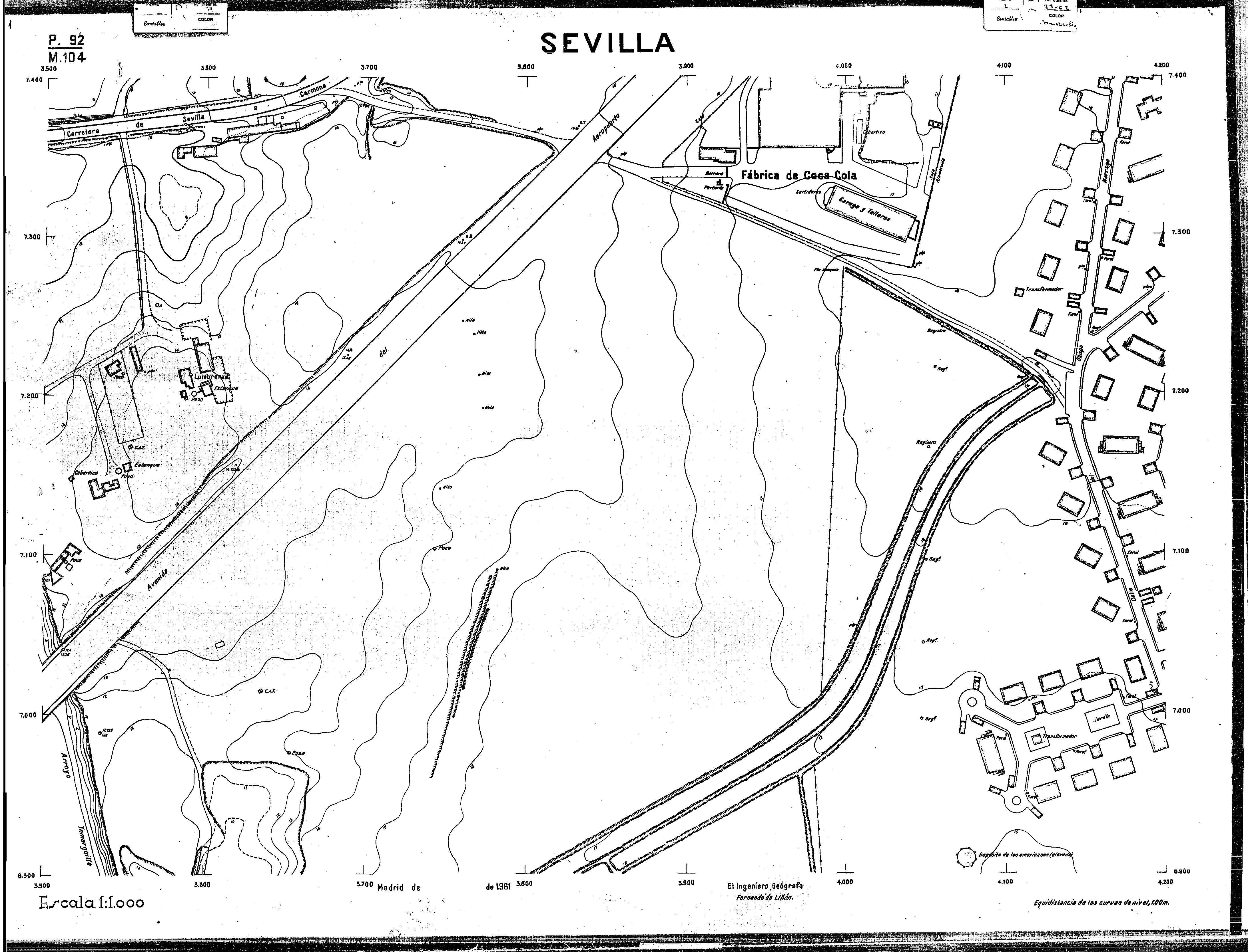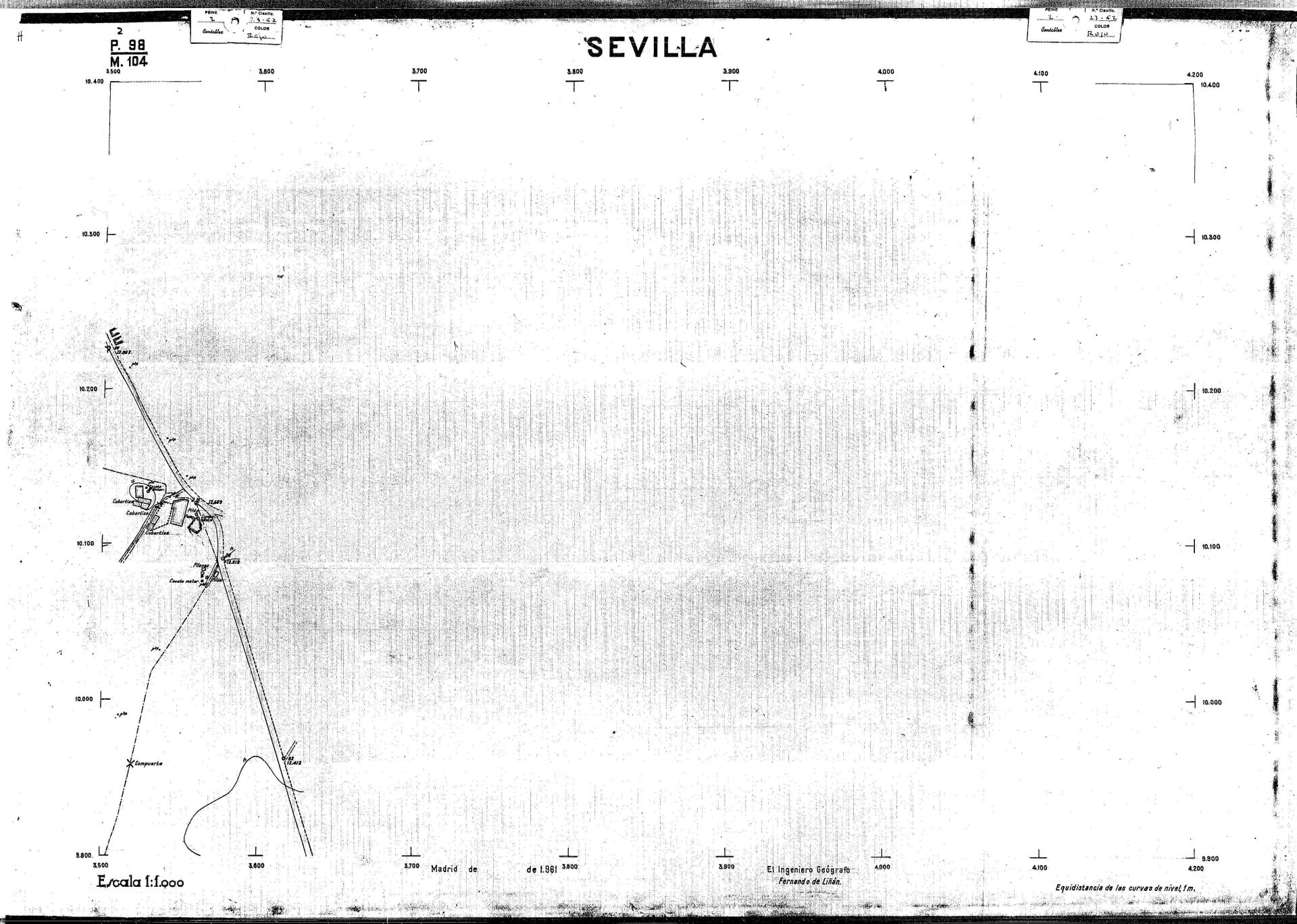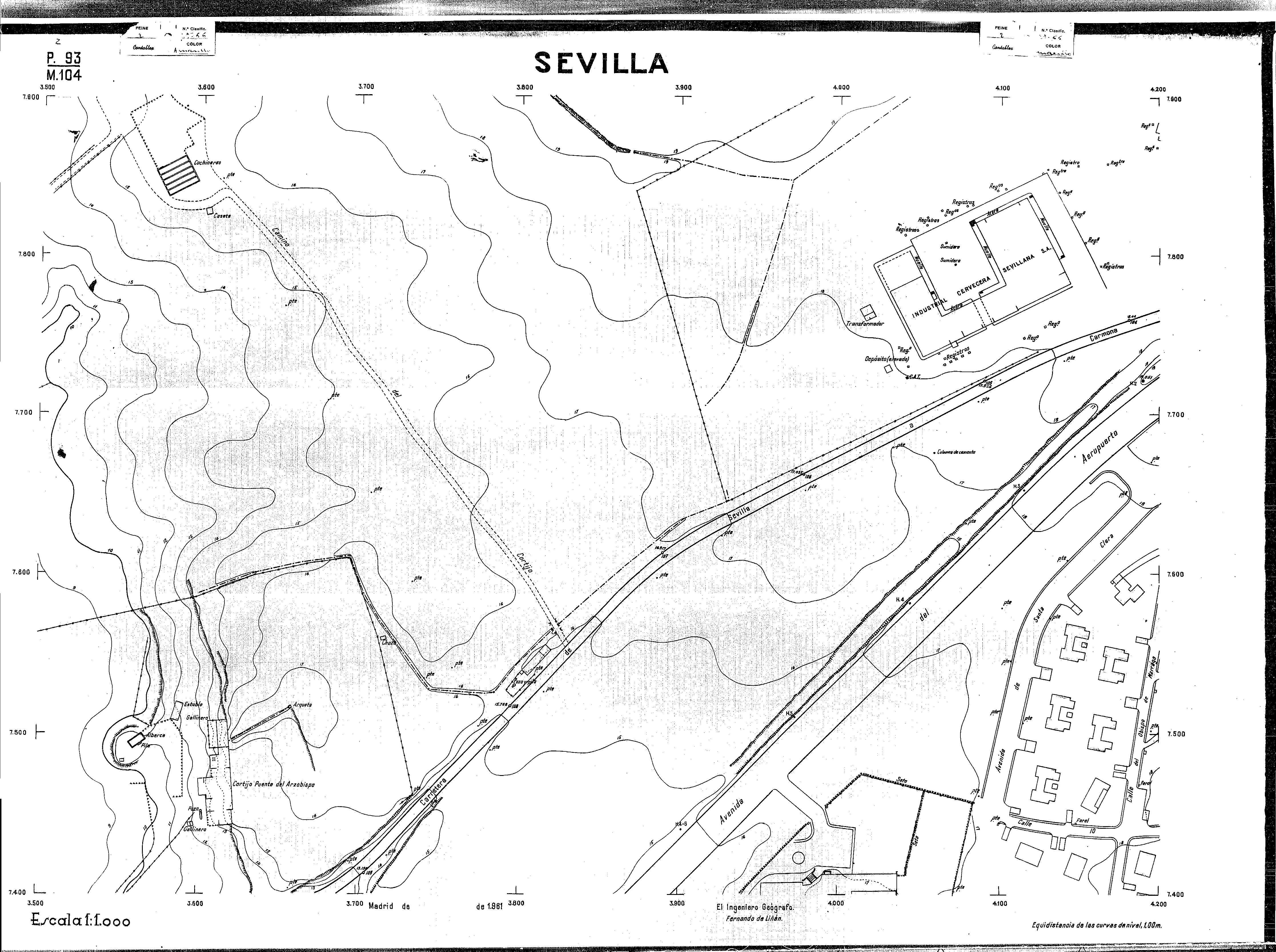 | 500 | ## | $aPlano de la zona Este de Sevilla compuesto por 70 hojas, incluyendo la hoja de composición del plano a escala 1:25000; recoge el viario identificando las calles; cada hoja indica la referencia de la cuadricula de la hoja de composición y señala en una nota "Equidistancia de las curvas de nivel, 1.00 m. | 500 | ## | $aHoja P.82/M.102, sector limitado por el muro de contención la línea del ferrocarril Madrid-Cádiz y la carretera de Su Eminencia; Hoja P.82/M.103, sector limitado por el muro de contención y la carretera de Su Eminencia; Hoja P.82/M104, recoge parte de la carretera de Su Eminencia; Hoja P.83/M.102, recoge parte del muro de contención y el arroyo Tamarguillo; Hoja P.83/M.103, recoge el arroyo del Tamarguillo y terrenos colindantes; Hoja P.83/M.104, recoge la carretera de Su Eminencia, la línea del ferrocarril Sevilla-Carmona y la autopista de la Universidad Laboral; Hoja P.84/M.102, recoge parte del arroyo del Tamarguillo y el muro de contención; Hoja P.84/M.103, recoge la línea del ferrocarril Sevilla-Alcalá de Guadaira y Carmona y la autopista de la Universidad Laboral; Hoja P.84/M.104, sector limitado por la autopista de la Universidad Laboral, la carretera de Su Eminencia y el complejo industrial de HYTASA; Hoja P.85/M.102, recoge el arroyo del Tamarguillo, el barrio del Tiro de Línea y el muro de contención; Hoja P.85/M.103, recoge el arroyo del Tamarguillo, la autopista de la Universidad Laboral y la línea del ferrocarril Sevilla-Carmona; P.85/M.104, recoge la zona industrial de HYTASA y el Cerro del Aguila; Hoja P.85/M.105, sector limitado por las calles Maqueda, Bucarelli, José Sarabia y Corte; Hoja P.86/M103, recoge el matadero municipal y las calles Juan de Herrera y Santuario de la Cabeza; Hoja P.86/M.104, recoge el arroyo del Tamarguillo y el barrio del Cerro del Aguila; Hoja P.86/M.105, recoge la carretera de Su Eminencia, un canal y unas viviendas; Hoja P.86/M.106, recoge la carretera de Su Eminencia; Hoja P.87/M.104, recoge el arroyo del Tamarguillo, los barrios Santa Teresa y Amate, y la emisora de Radio Nacional de España; Hoja P.87/M.105, recoge el cine Candelaria, un arroyo, dos canales y un camino; Hoja P.87/M.106, recoge parte de la carretera Sevilla-Dos Hermanas; Hoja P.88/M.104, recoge el arroyo el Tamarguillo, los barrios de Nuestra Señora de la Candelaria y de los Pájaros; Hoja P.88/M.105, recoge el barrio de Los Pájaros, un cortijo, una fábrica y un canal; Hoja P.88/106, recoge la carretera de Su Eminencia y el barrio de Jesús, María y José; Hoja P.89/M.104, recoge el arroyo del Tamarguillo, el barrio de Los Pájaros, la carretera Sevilla-Carmona y los restos del acueducto romano; Hoja P.89/M.105, los barrios de La Candelaria y Santa Aurelia, el cuartel de San Fernando y la carretera Sevilla-Carmona; Hoja P.89/M.106, recoge el barrio de Santa Aurelia, la ronda de circunvalación, la carretera Sevilla-Carmona, el cuartel de San Fernando y un canal; Hoja P.89/M.107, recoge parte de un viario; Hoja P.90/M.104, sector limitado por el arroyo del Tamarguillo y la carretera Amarilla; Hoja P.90/M.105, la carretera Amarilla y los terrenos adyacentes; Hoja P.90/M.106, recoge la carretera de circunvalación y un canal; Hoja P.90/M.107, recoge el arroyo de los Marañones y un canal; Hoja P.91/M.104, recoge el arroyo del Tamarguillo; Hoja P.91/M.105, recoge el barrio de Santa Clara y unas escuelas; Hoja P.91/M.106, recoge la carretera de circunvalación; Hoja P.92/M.103, recoge el arroyo del Tamarguillo; Hoja P.92/M.104, recoge la carretera de Carmona, la avda. del Aeropuerto, el barrio de Santa Clara y la fábrica de Coca-Cola; Hoja P.92/M.105, recoge el barrio de Santa Clara y la carretera de circunvalación; Hoja P.92/M.106, recoge las carreteras Amarilla y de circunvalación, y la hacienda Buena Esperanza; Hoja P.93/M.103, recoge el arroyo del Tamarguillo; Hoja P.93/M.104, recoge el barrio de Santa Clara, la avda. del Aeropuerto, la carretera Sevilla-Córdoba y la fábrica Cervecera Sevillana; Hoja P.93/M.105, recoge el barrio de Santa Clara, la avda. del Aeropuerto y la carretera de circunvalación; Hoja P.93/M.106, recoge los terrenos adyacentes a la carretera de circunvalación; Hoja P.94/M.102, recoge la línea del ferrocarril Sevilla-Cádiz, la avda. Pino Montano y el barrio de Pino Montano; Hoja P.95/M.103, recoge el arroyo del Tamarguillo, el hospital psiquiátrico y la carretera que le da acceso; Hoja P.94/M.104, recoge los terrenos adyacentes al hospital psiquiátrico; Hoja P.94/M.105, recoge un canal y el consultorio de la Gota de Leche; Hoja P.94/M.106, recoge la línea del ferrocarril Madrid-Cádiz y el barrio de los Carteros; Hoja P.95/M.103, recoge el arroyo del Tamarguillo, la avda. de Pino Montano, el barrio de Pino Montano y la carretera del hospital psiquiátrico; Hoja P.95/M.104, recoge la carretera del hospital psiquiátrico, el cortijo de Miraflores y un canal; Hoja P.95/M.105, recoge los terrenos próximos al cortijo de Miraflores; Hoja P.96/M. 102, recoge la línea del ferrocarril Madrid-Cádiz, el cementerio de San Fernando, las huertas del Buen Pastor y Molina, y una acequia; Hoja P.96/M.103, recoge la avda. de Pino Montano y las huertas de Molina y del Rosal Chico y del Pasillo de los Toros; Hoja P.96/M.104, recoge el arroyo del Tamarguillo y la avda. de Pino Montano; Hoja P.97/M.100, recoge el río Guadalquivir y el cementerio de los Ingleses; Hoja P.97/M.101, recoge el barrio de San Jerónimo, el cementerio de San Fernando, una fábrica de abonos, la carretera Sevilla-La Algaba y la línea del ferrocarril Madrid-Sevilla; Hoja P.97/M.102, recoge la línea del ferrocarril Madrid-Cádiz, la carretera de Brenes, el cementerio de San Fernando y la fábrica Viguetas Castilla; Hoja P.97/M.103, recoge los terrenos próximos a la línea del ferrocarril Madrid-Cádiz; Hoja P.97/M.104, recoge el arroyo del Tamarguillo, la avda. de Pino Montano y la hacienda Casillas de San Jerónimo de Buena Vista; Hoja P
