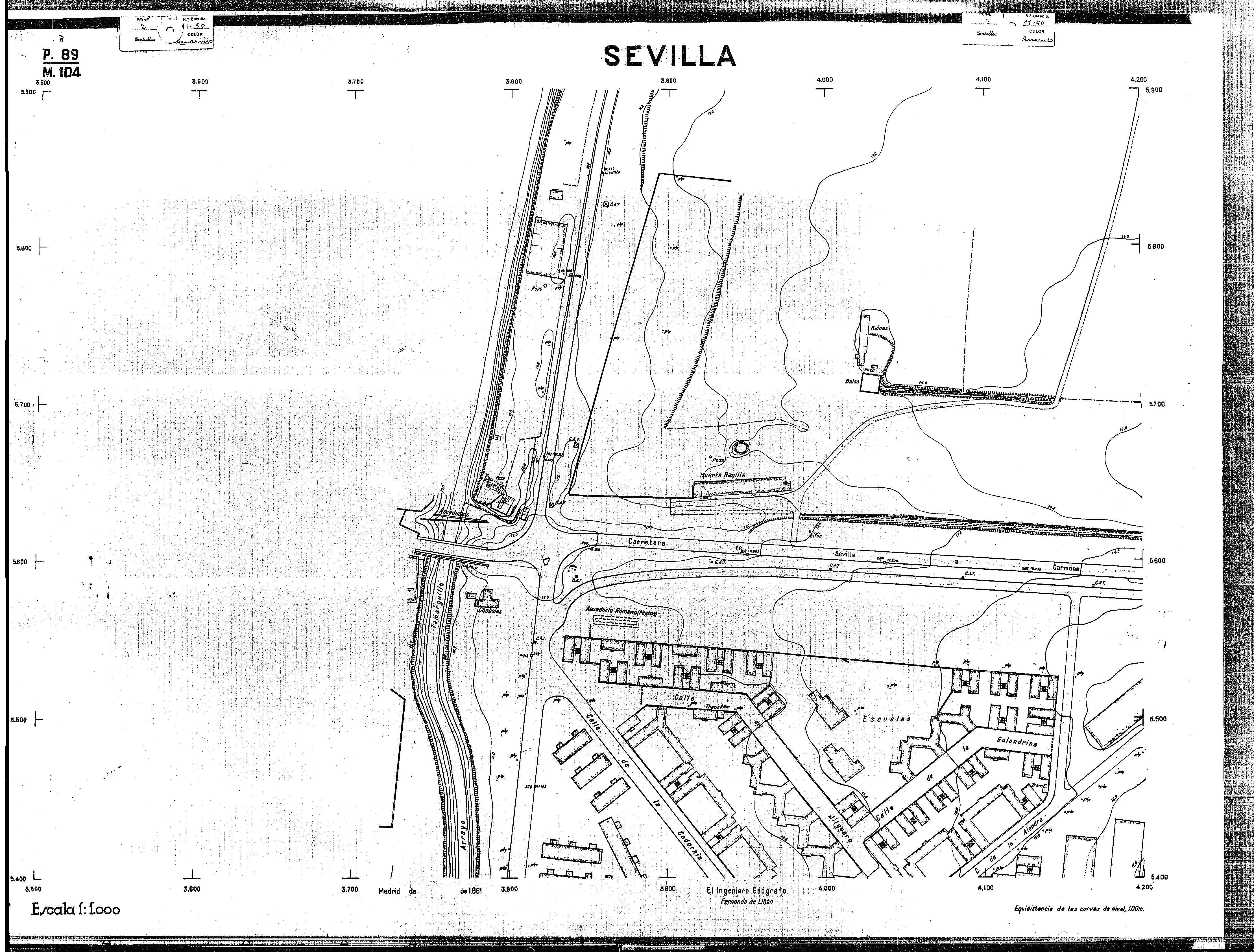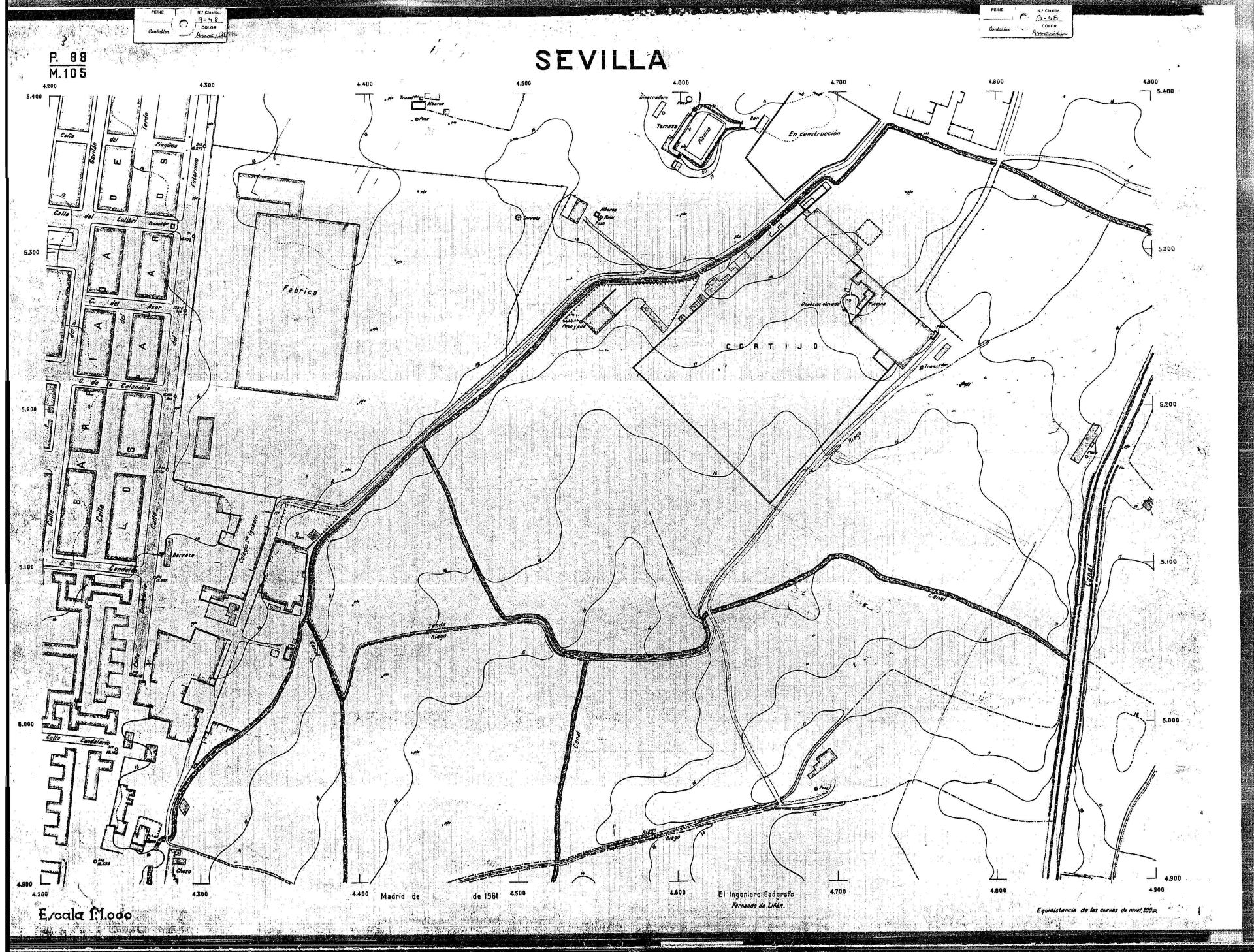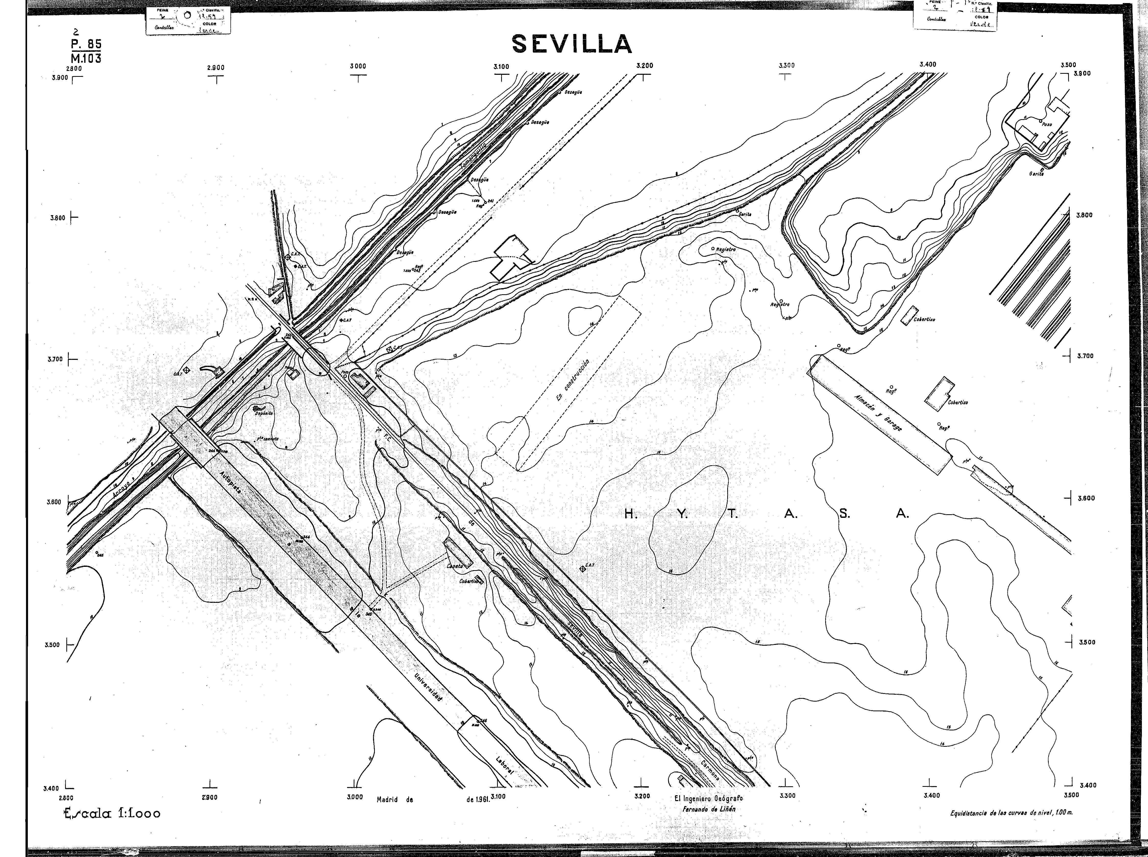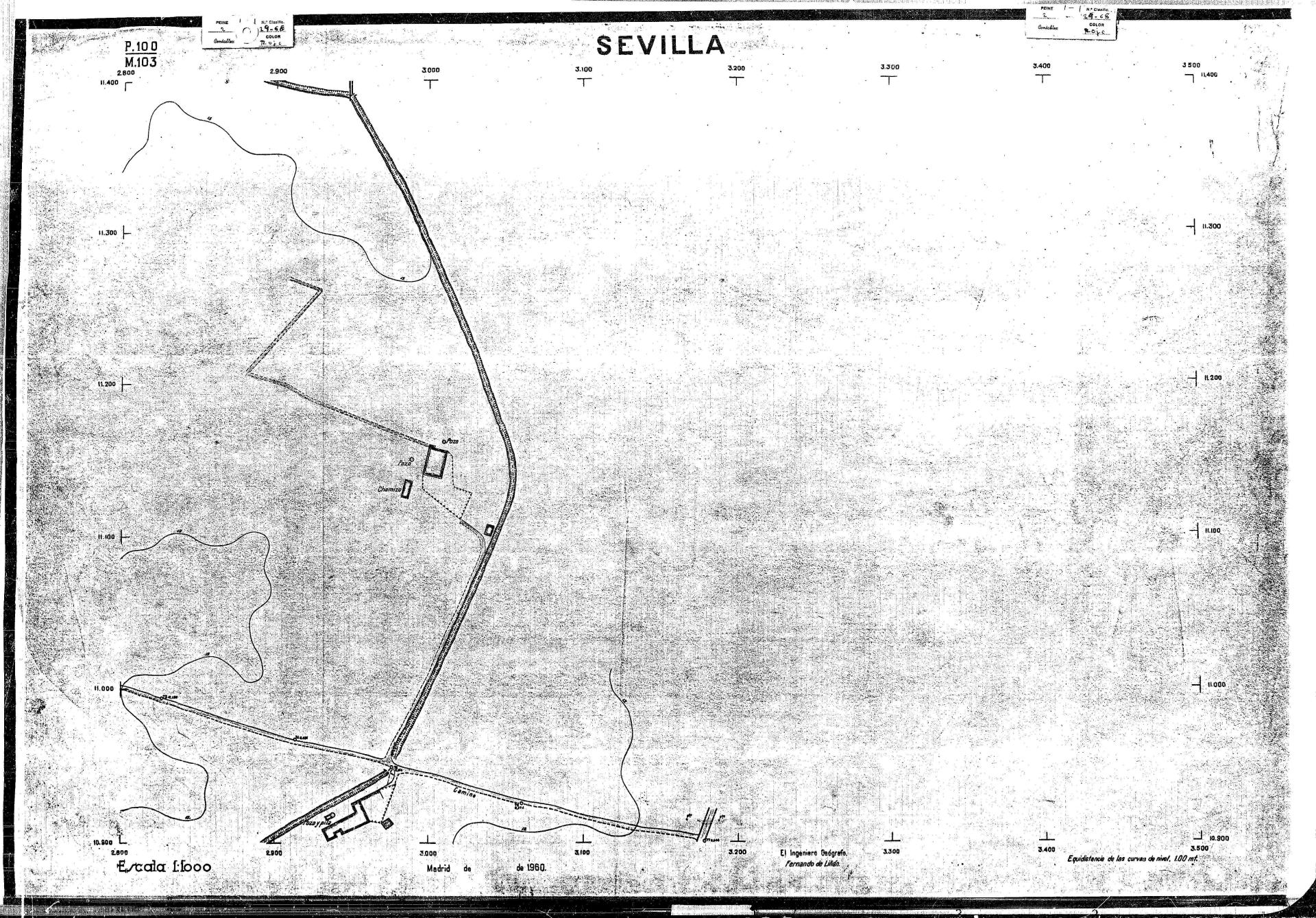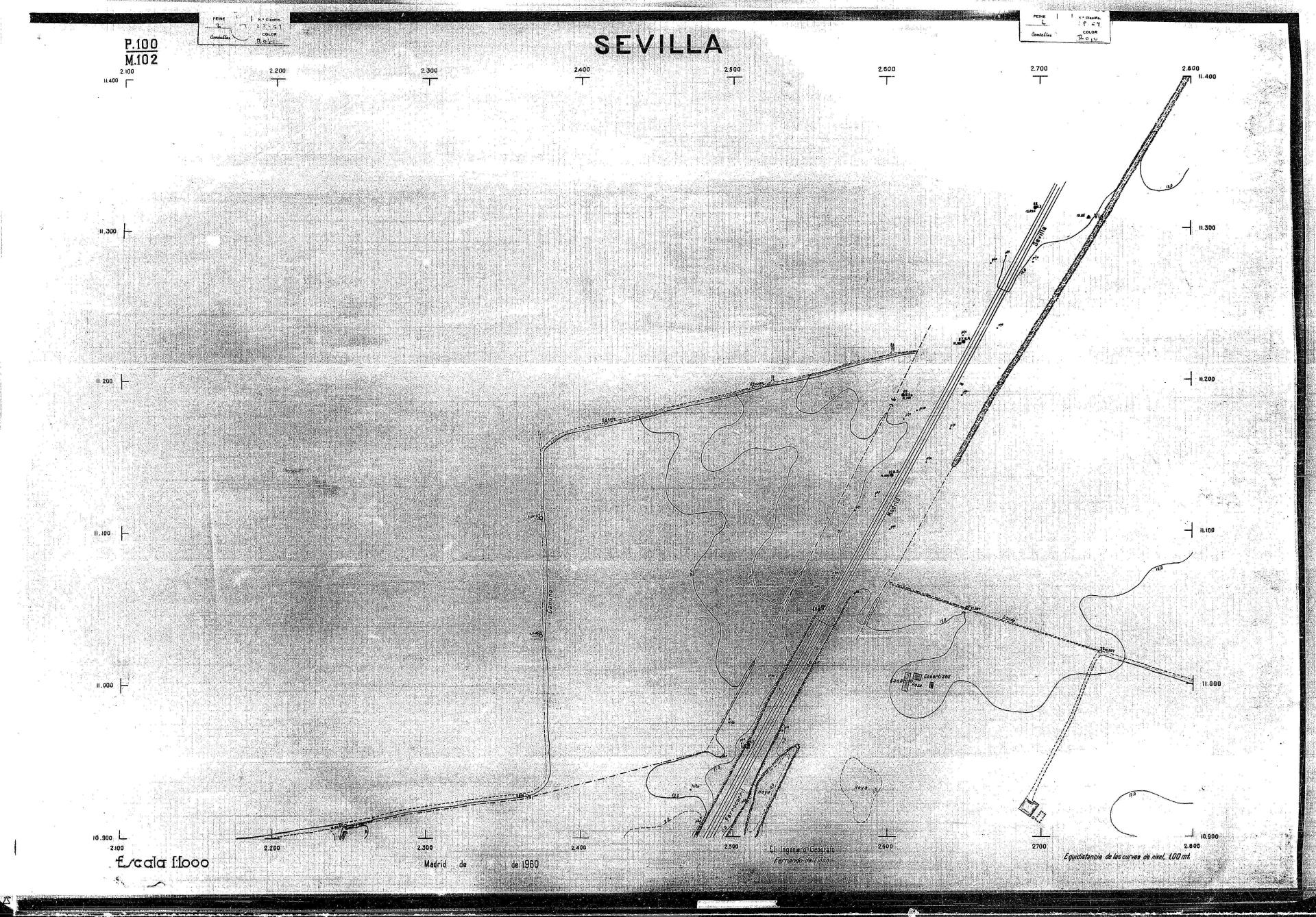 | 500 | ## | $aPlano de la zona Este de Sevilla compuesto por 70 hojas, incluyendo la hoja de composición del plano a escala 1:25000; recoge el viario identificando las calles; cada hoja indica la referencia de la cuadricula de la hoja de composición y señala en una nota "Equidistancia de las curvas de nivel, 1.00 m. | 500 | ## | $aHoja P.82/M.102, sector limitado por el muro de contención la línea del ferrocarril Madrid-Cádiz y la carretera de Su Eminencia; Hoja P.82/M.103, sector limitado por el muro de contención y la carretera de Su Eminencia; Hoja P.82/M104, recoge parte de la carretera de Su Eminencia; Hoja P.83/M.102, recoge parte del muro de contención y el arroyo Tamarguillo; Hoja P.83/M.103, recoge el arroyo del Tamarguillo y terrenos colindantes; Hoja P.83/M.104, recoge la carretera de Su Eminencia, la línea del ferrocarril Sevilla-Carmona y la autopista de la Universidad Laboral; Hoja P.84/M.102, recoge parte del arroyo del Tamarguillo y el muro de contención; Hoja P.84/M.103, recoge la línea del ferrocarril Sevilla-Alcalá de Guadaira y Carmona y la autopista de la Universidad Laboral; Hoja P.84/M.104, sector limitado por la autopista de la Universidad Laboral, la carretera de Su Eminencia y el complejo industrial de HYTASA; Hoja P.85/M.102, recoge el arroyo del Tamarguillo, el barrio del Tiro de Línea y el muro de contención; Hoja P.85/M.103, recoge el arroyo del Tamarguillo, la autopista de la Universidad Laboral y la línea del ferrocarril Sevilla-Carmona; P.85/M.104, recoge la zona industrial de HYTASA y el Cerro del Aguila; Hoja P.85/M.105, sector limitado por las calles Maqueda, Bucarelli, José Sarabia y Corte; Hoja P.86/M103, recoge el matadero municipal y las calles Juan de Herrera y Santuario de la Cabeza; Hoja P.86/M.104, recoge el arroyo del Tamarguillo y el barrio del Cerro del Aguila; Hoja P.86/M.105, recoge la carretera de Su Eminencia, un canal y unas viviendas; Hoja P.86/M.106, recoge la carretera de Su Eminencia; Hoja P.87/M.104, recoge el arroyo del Tamarguillo, los barrios Santa Teresa y Amate, y la emisora de Radio Nacional de España; Hoja P.87/M.105, recoge el cine Candelaria, un arroyo, dos canales y un camino; Hoja P.87/M.106, recoge parte de la carretera Sevilla-Dos Hermanas; Hoja P.88/M.104, recoge el arroyo el Tamarguillo, los barrios de Nuestra Señora de la Candelaria y de los Pájaros; Hoja P.88/M.105, recoge el barrio de Los Pájaros, un cortijo, una fábrica y un canal; Hoja P.88/106, recoge la carretera de Su Eminencia y el barrio de Jesús, María y José; Hoja P.89/M.104, recoge el arroyo del Tamarguillo, el barrio de Los Pájaros, la carretera Sevilla-Carmona y los restos del acueducto romano; Hoja P.89/M.105, los barrios de La Candelaria y Santa Aurelia, el cuartel de San Fernando y la carretera Sevilla-Carmona; Hoja P.89/M.106, recoge el barrio de Santa Aurelia, la ronda de circunvalación, la carretera Sevilla-Carmona, el cuartel de San Fernando y un canal; Hoja P.89/M.107, recoge parte de un viario; Hoja P.90/M.104, sector limitado por el arroyo del Tamarguillo y la carretera Amarilla; Hoja P.90/M.105, la carretera Amarilla y los terrenos adyacentes; Hoja P.90/M.106, recoge la carretera de circunvalación y un canal; Hoja P.90/M.107, recoge el arroyo de los Marañones y un canal; Hoja P.91/M.104, recoge el arroyo del Tamarguillo; Hoja P.91/M.105, recoge el barrio de Santa Clara y unas escuelas; Hoja P.91/M.106, recoge la carretera de circunvalación; Hoja P.92/M.103, recoge el arroyo del Tamarguillo; Hoja P.92/M.104, recoge la carretera de Carmona, la avda. del Aeropuerto, el barrio de Santa Clara y la fábrica de Coca-Cola; Hoja P.92/M.105, recoge el barrio de Santa Clara y la carretera de circunvalación; Hoja P.92/M.106, recoge las carreteras Amarilla y de circunvalación, y la hacienda Buena Esperanza; Hoja P.93/M.103, recoge el arroyo del Tamarguillo; Hoja P.93/M.104, recoge el barrio de Santa Clara, la avda. del Aeropuerto, la carretera Sevilla-Córdoba y la fábrica Cervecera Sevillana; Hoja P.93/M.105, recoge el barrio de Santa Clara, la avda. del Aeropuerto y la carretera de circunvalación; Hoja P.93/M.106, recoge los terrenos adyacentes a la carretera de circunvalación; Hoja P.94/M.102, recoge la línea del ferrocarril Sevilla-Cádiz, la avda. Pino Montano y el barrio de Pino Montano; Hoja P.95/M.103, recoge el arroyo del Tamarguillo, el hospital psiquiátrico y la carretera que le da acceso; Hoja P.94/M.104, recoge los terrenos adyacentes al hospital psiquiátrico; Hoja P.94/M.105, recoge un canal y el consultorio de la Gota de Leche; Hoja P.94/M.106, recoge la línea del ferrocarril Madrid-Cádiz y el barrio de los Carteros; Hoja P.95/M.103, recoge el arroyo del Tamarguillo, la avda. de Pino Montano, el barrio de Pino Montano y la carretera del hospital psiquiátrico; Hoja P.95/M.104, recoge la carretera del hospital psiquiátrico, el cortijo de Miraflores y un canal; Hoja P.95/M.105, recoge los terrenos próximos al cortijo de Miraflores; Hoja P.96/M. 102, recoge la línea del ferrocarril Madrid-Cádiz, el cementerio de San Fernando, las huertas del Buen Pastor y Molina, y una acequia; Hoja P.96/M.103, recoge la avda. de Pino Montano y las huertas de Molina y del Rosal Chico y del Pasillo de los Toros; Hoja P.96/M.104, recoge el arroyo del Tamarguillo y la avda. de Pino Montano; Hoja P.97/M.100, recoge el río Guadalquivir y el cementerio de los Ingleses; Hoja P.97/M.101, recoge el barrio de San Jerónimo, el cementerio de San Fernando, una fábrica de abonos, la carretera Sevilla-La Algaba y la línea del ferrocarril Madrid-Sevilla; Hoja P.97/M.102, recoge la línea del ferrocarril Madrid-Cádiz, la carretera de Brenes, el cementerio de San Fernando y la fábrica Viguetas Castilla; Hoja P.97/M.103, recoge los terrenos próximos a la línea del ferrocarril Madrid-Cádiz; Hoja P.97/M.104, recoge el arroyo del Tamarguillo, la avda. de Pino Montano y la hacienda Casillas de San Jerónimo de Buena Vista; Hoja P