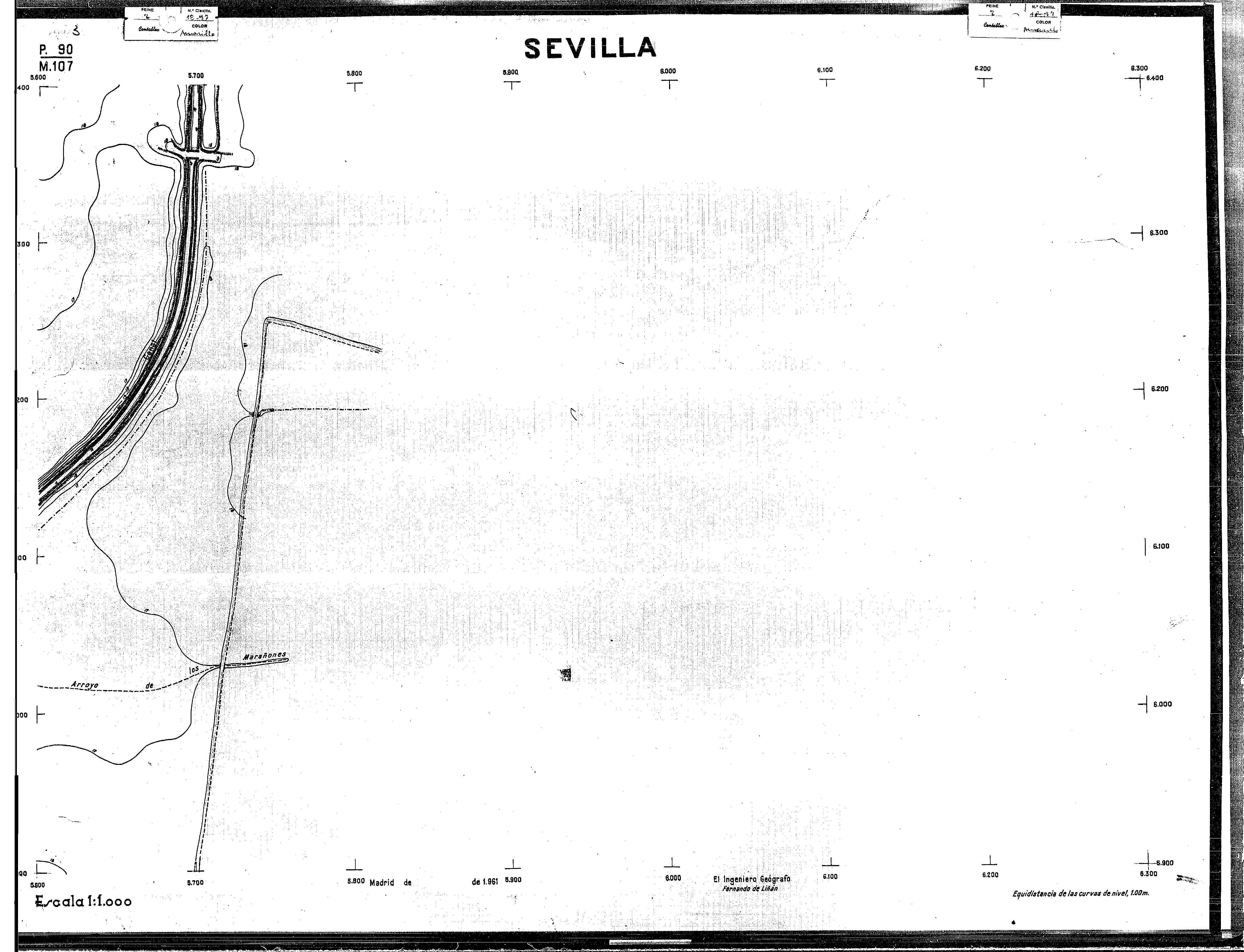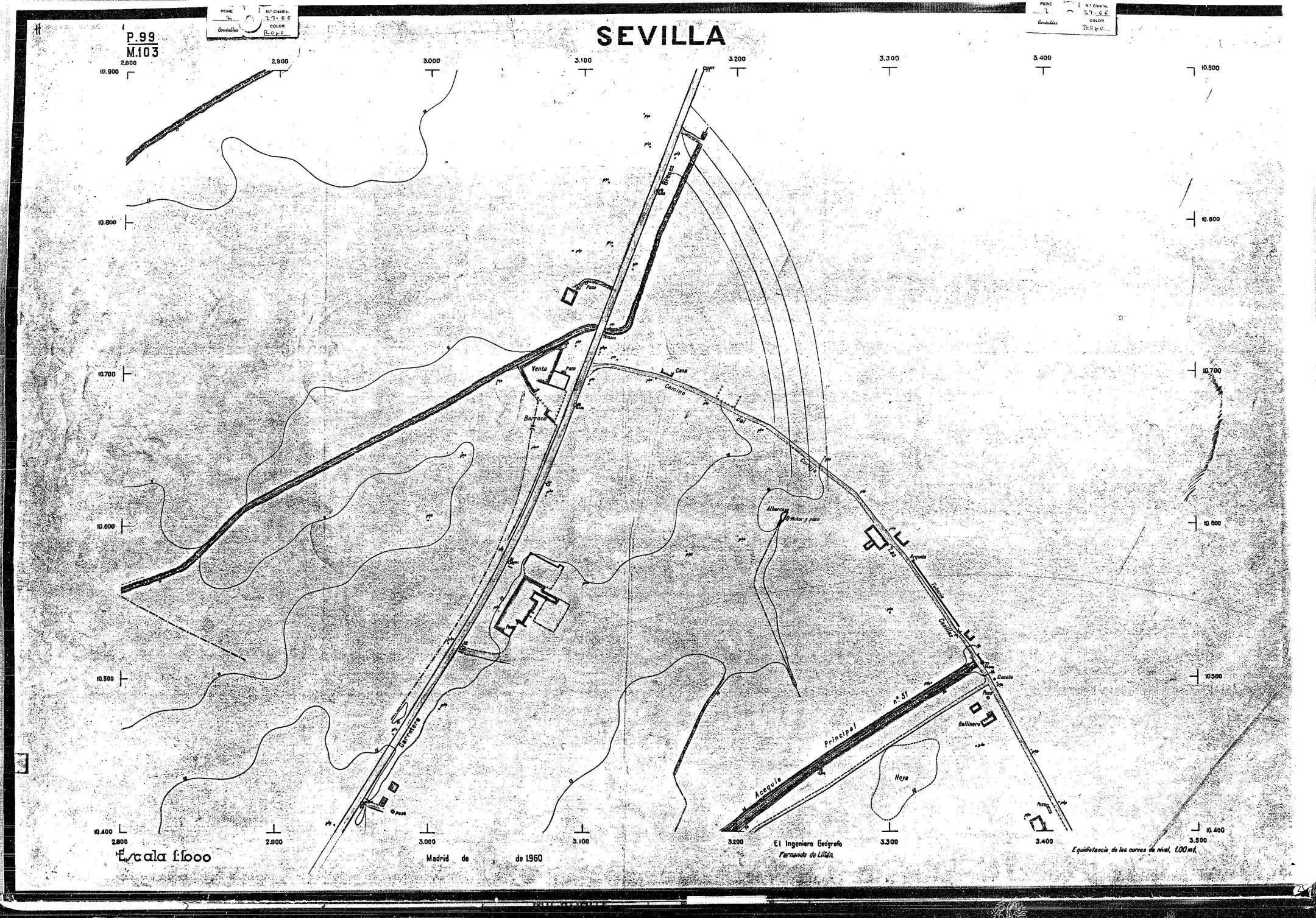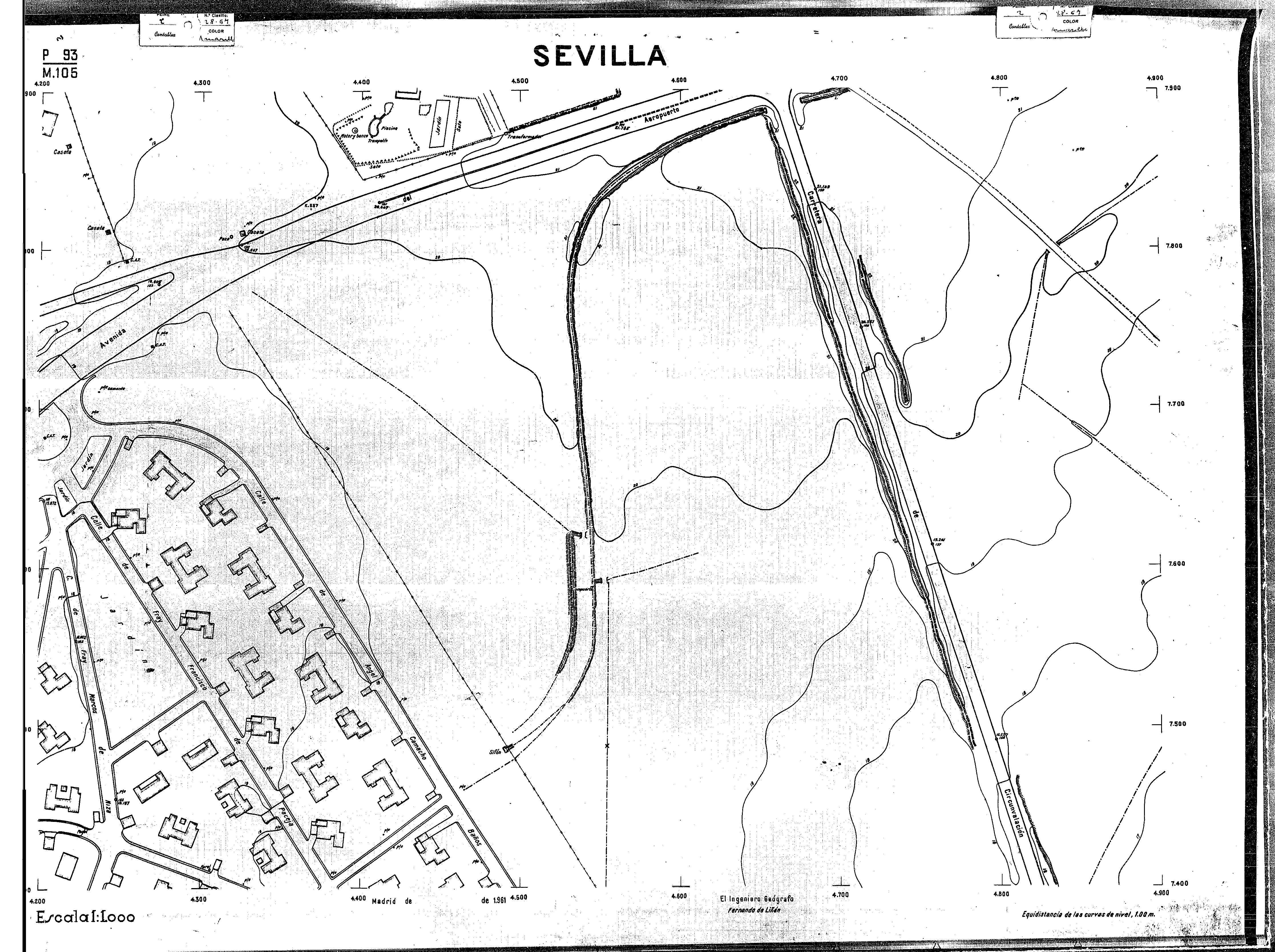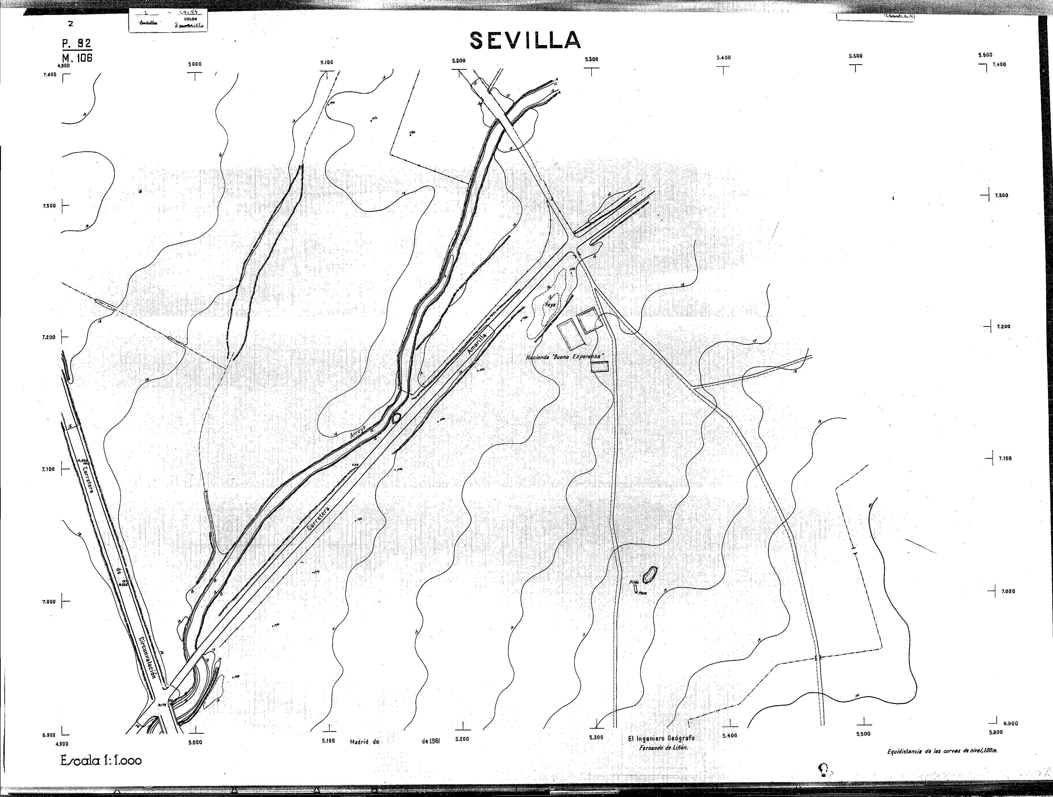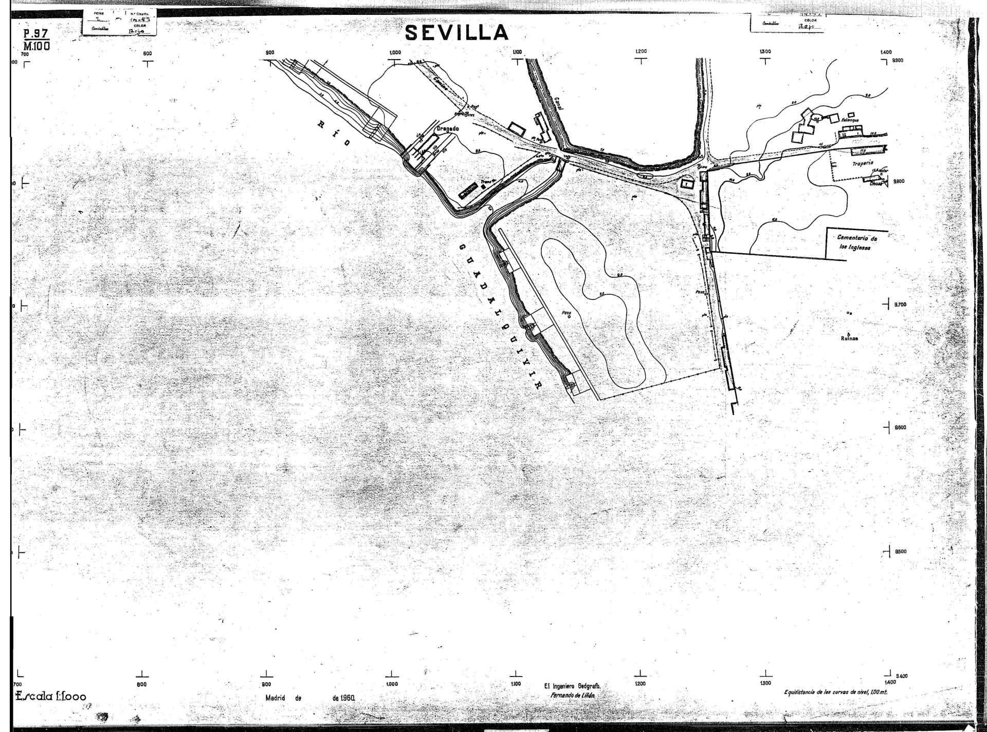 | 500 | ## | $aPlano de la zona Este de Sevilla compuesto por 70 hojas, incluyendo la hoja de composición del plano a escala 1:25000; recoge el viario identificando las calles; cada hoja indica la referencia de la cuadricula de la hoja de composición y señala en una nota "Equidistancia de las curvas de nivel, 1.00 m. | 500 | ## | $aHoja P.82/M.102, sector limitado por el muro de contención la línea del ferrocarril Madrid-Cádiz y la carretera de Su Eminencia; Hoja P.82/M.103, sector limitado por el muro de contención y la carretera de Su Eminencia; Hoja P.82/M104, recoge parte de la carretera de Su Eminencia; Hoja P.83/M.102, recoge parte del muro de contención y el arroyo Tamarguillo; Hoja P.83/M.103, recoge el arroyo del Tamarguillo y terrenos colindantes; Hoja P.83/M.104, recoge la carretera de Su Eminencia, la línea del ferrocarril Sevilla-Carmona y la autopista de la Universidad Laboral; Hoja P.84/M.102, recoge parte del arroyo del Tamarguillo y el muro de contención; Hoja P.84/M.103, recoge la línea del ferrocarril Sevilla-Alcalá de Guadaira y Carmona y la autopista de la Universidad Laboral; Hoja P.84/M.104, sector limitado por la autopista de la Universidad Laboral, la carretera de Su Eminencia y el complejo industrial de HYTASA; Hoja P.85/M.102, recoge el arroyo del Tamarguillo, el barrio del Tiro de Línea y el muro de contención; Hoja P.85/M.103, recoge el arroyo del Tamarguillo, la autopista de la Universidad Laboral y la línea del ferrocarril Sevilla-Carmona; P.85/M.104, recoge la zona industrial de HYTASA y el Cerro del Aguila; Hoja P.85/M.105, sector limitado por las calles Maqueda, Bucarelli, José Sarabia y Corte; Hoja P.86/M103, recoge el matadero municipal y las calles Juan de Herrera y Santuario de la Cabeza; Hoja P.86/M.104, recoge el arroyo del Tamarguillo y el barrio del Cerro del Aguila; Hoja P.86/M.105, recoge la carretera de Su Eminencia, un canal y unas viviendas; Hoja P.86/M.106, recoge la carretera de Su Eminencia; Hoja P.87/M.104, recoge el arroyo del Tamarguillo, los barrios Santa Teresa y Amate, y la emisora de Radio Nacional de España; Hoja P.87/M.105, recoge el cine Candelaria, un arroyo, dos canales y un camino; Hoja P.87/M.106, recoge parte de la carretera Sevilla-Dos Hermanas; Hoja P.88/M.104, recoge el arroyo el Tamarguillo, los barrios de Nuestra Señora de la Candelaria y de los Pájaros; Hoja P.88/M.105, recoge el barrio de Los Pájaros, un cortijo, una fábrica y un canal; Hoja P.88/106, recoge la carretera de Su Eminencia y el barrio de Jesús, María y José; Hoja P.89/M.104, recoge el arroyo del Tamarguillo, el barrio de Los Pájaros, la carretera Sevilla-Carmona y los restos del acueducto romano; Hoja P.89/M.105, los barrios de La Candelaria y Santa Aurelia, el cuartel de San Fernando y la carretera Sevilla-Carmona; Hoja P.89/M.106, recoge el barrio de Santa Aurelia, la ronda de circunvalación, la carretera Sevilla-Carmona, el cuartel de San Fernando y un canal; Hoja P.89/M.107, recoge parte de un viario; Hoja P.90/M.104, sector limitado por el arroyo del Tamarguillo y la carretera Amarilla; Hoja P.90/M.105, la carretera Amarilla y los terrenos adyacentes; Hoja P.90/M.106, recoge la carretera de circunvalación y un canal; Hoja P.90/M.107, recoge el arroyo de los Marañones y un canal; Hoja P.91/M.104, recoge el arroyo del Tamarguillo; Hoja P.91/M.105, recoge el barrio de Santa Clara y unas escuelas; Hoja P.91/M.106, recoge la carretera de circunvalación; Hoja P.92/M.103, recoge el arroyo del Tamarguillo; Hoja P.92/M.104, recoge la carretera de Carmona, la avda. del Aeropuerto, el barrio de Santa Clara y la fábrica de Coca-Cola; Hoja P.92/M.105, recoge el barrio de Santa Clara y la carretera de circunvalación; Hoja P.92/M.106, recoge las carreteras Amarilla y de circunvalación, y la hacienda Buena Esperanza; Hoja P.93/M.103, recoge el arroyo del Tamarguillo; Hoja P.93/M.104, recoge el barrio de Santa Clara, la avda. del Aeropuerto, la carretera Sevilla-Córdoba y la fábrica Cervecera Sevillana; Hoja P.93/M.105, recoge el barrio de Santa Clara, la avda. del Aeropuerto y la carretera de circunvalación; Hoja P.93/M.106, recoge los terrenos adyacentes a la carretera de circunvalación; Hoja P.94/M.102, recoge la línea del ferrocarril Sevilla-Cádiz, la avda. Pino Montano y el barrio de Pino Montano; Hoja P.95/M.103, recoge el arroyo del Tamarguillo, el hospital psiquiátrico y la carretera que le da acceso; Hoja P.94/M.104, recoge los terrenos adyacentes al hospital psiquiátrico; Hoja P.94/M.105, recoge un canal y el consultorio de la Gota de Leche; Hoja P.94/M.106, recoge la línea del ferrocarril Madrid-Cádiz y el barrio de los Carteros; Hoja P.95/M.103, recoge el arroyo del Tamarguillo, la avda. de Pino Montano, el barrio de Pino Montano y la carretera del hospital psiquiátrico; Hoja P.95/M.104, recoge la carretera del hospital psiquiátrico, el cortijo de Miraflores y un canal; Hoja P.95/M.105, recoge los terrenos próximos al cortijo de Miraflores; Hoja P.96/M. 102, recoge la línea del ferrocarril Madrid-Cádiz, el cementerio de San Fernando, las huertas del Buen Pastor y Molina, y una acequia; Hoja P.96/M.103, recoge la avda. de Pino Montano y las huertas de Molina y del Rosal Chico y del Pasillo de los Toros; Hoja P.96/M.104, recoge el arroyo del Tamarguillo y la avda. de Pino Montano; Hoja P.97/M.100, recoge el río Guadalquivir y el cementerio de los Ingleses; Hoja P.97/M.101, recoge el barrio de San Jerónimo, el cementerio de San Fernando, una fábrica de abonos, la carretera Sevilla-La Algaba y la línea del ferrocarril Madrid-Sevilla; Hoja P.97/M.102, recoge la línea del ferrocarril Madrid-Cádiz, la carretera de Brenes, el cementerio de San Fernando y la fábrica Viguetas Castilla; Hoja P.97/M.103, recoge los terrenos próximos a la línea del ferrocarril Madrid-Cádiz; Hoja P.97/M.104, recoge el arroyo del Tamarguillo, la avda. de Pino Montano y la hacienda Casillas de San Jerónimo de Buena Vista; Hoja P