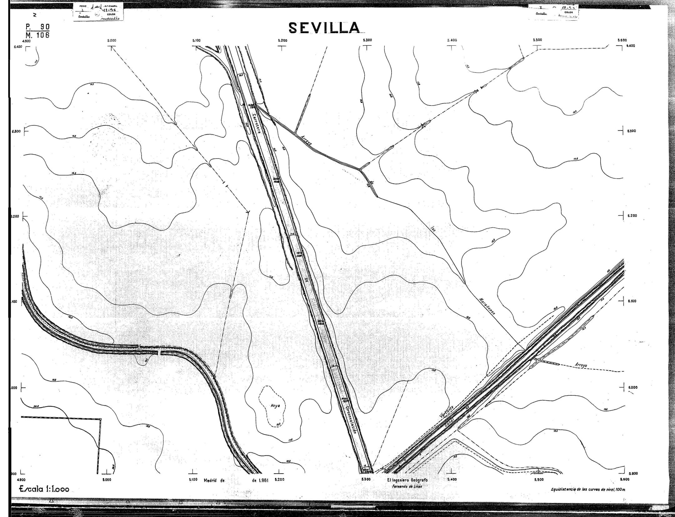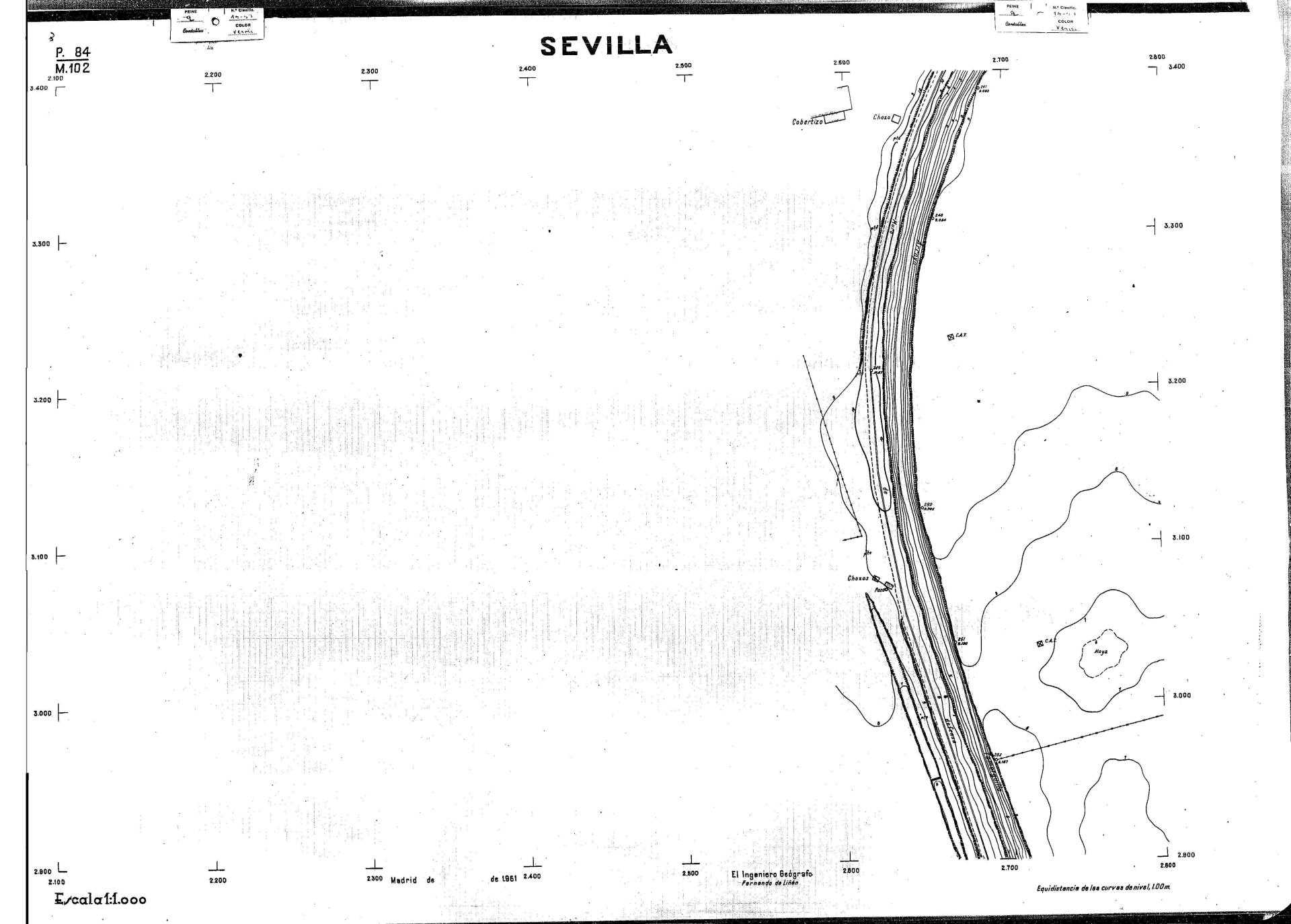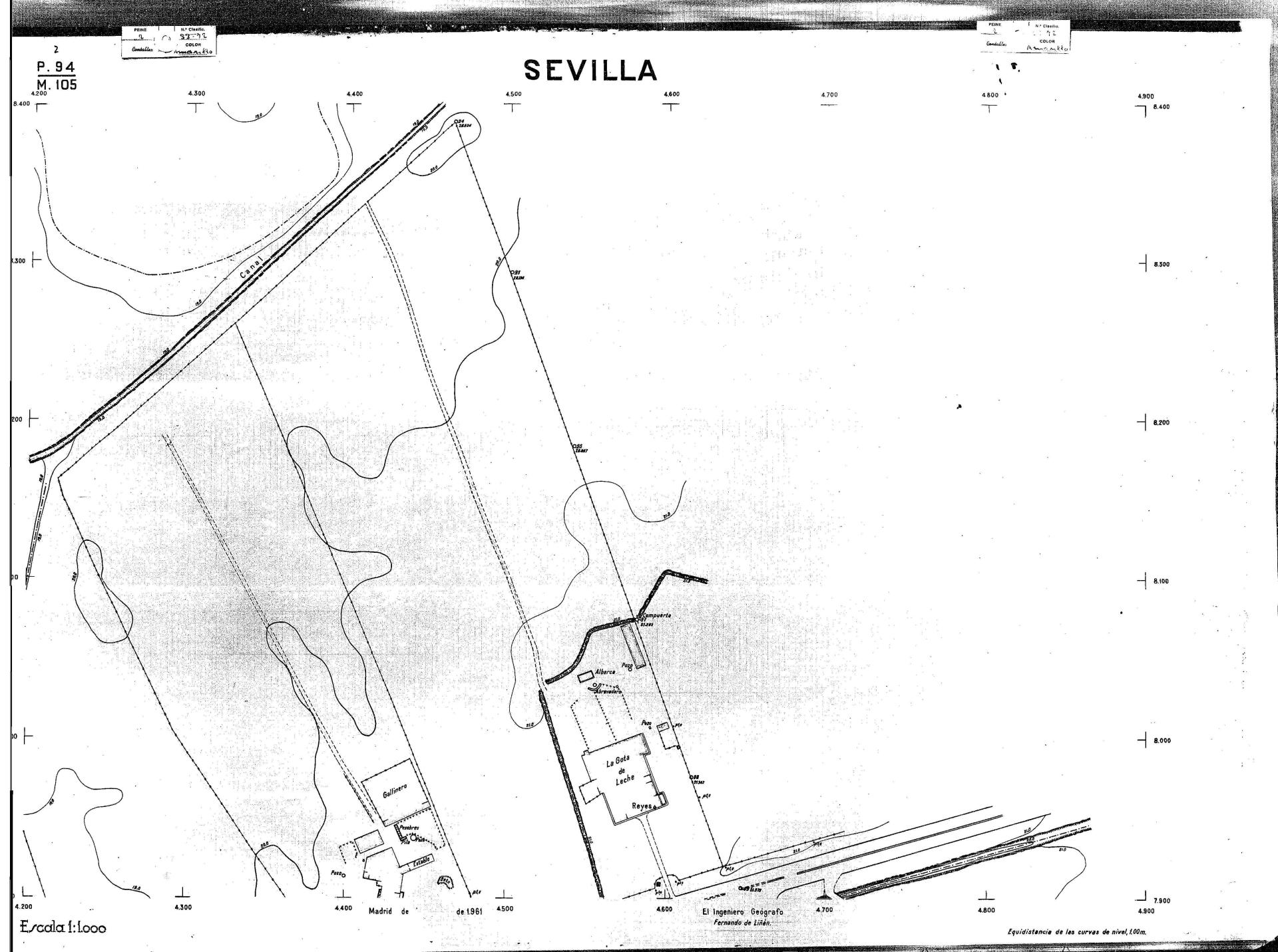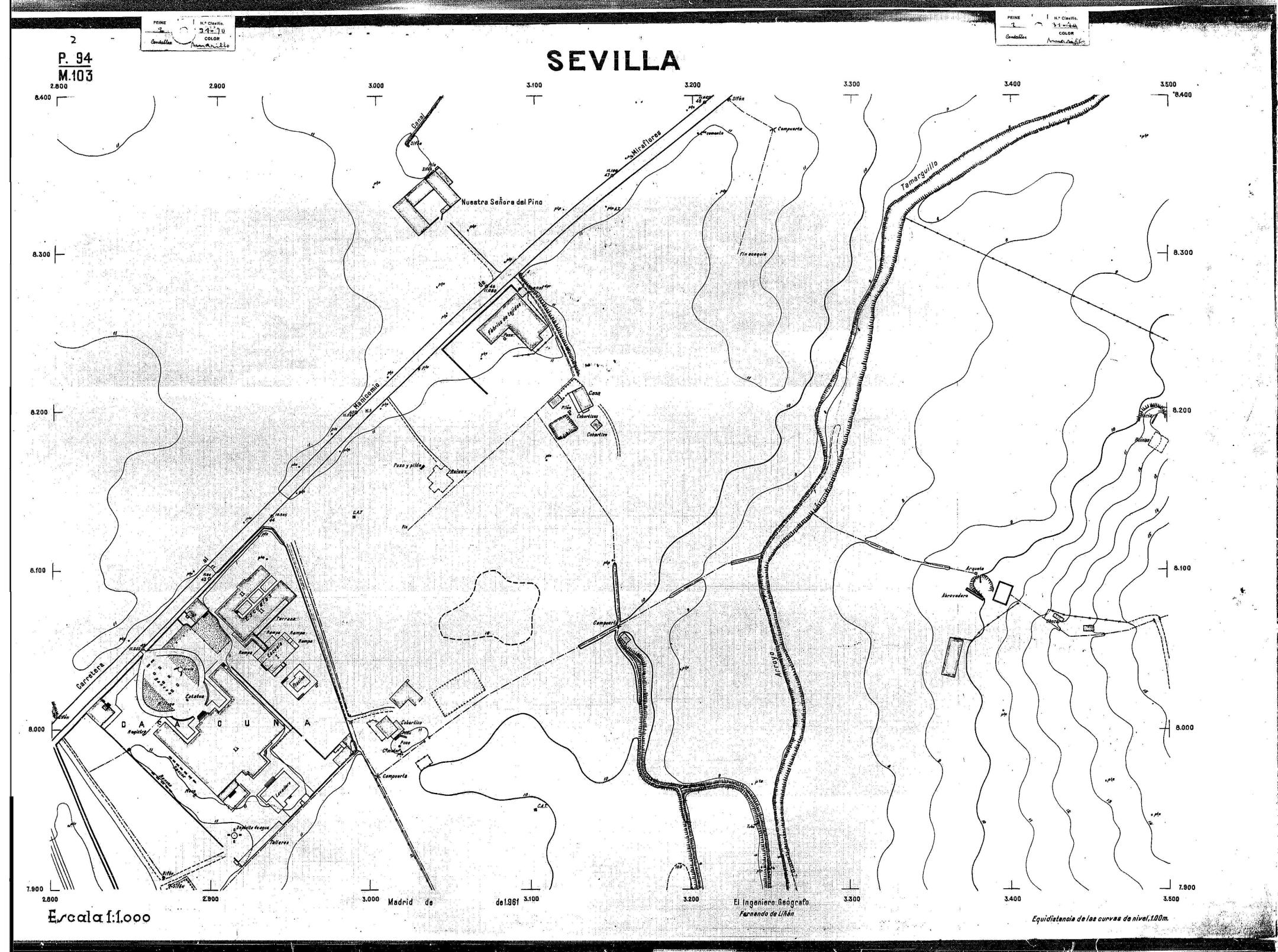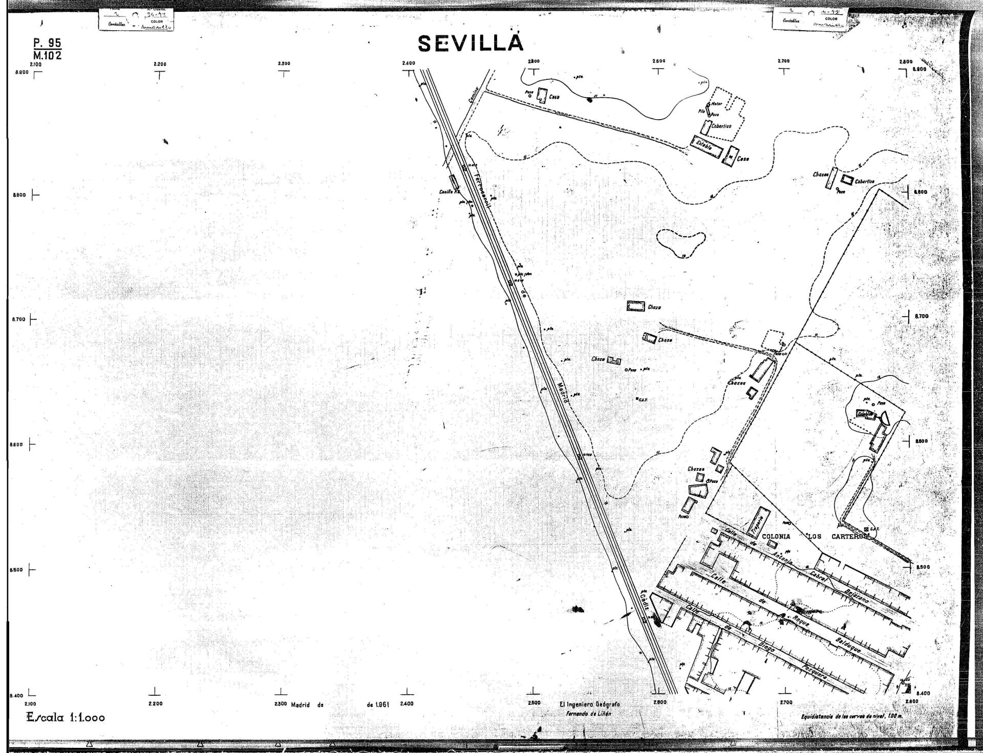 | 500 | ## | $aPlano de la zona Este de Sevilla compuesto por 70 hojas, incluyendo la hoja de composición del plano a escala 1:25000; recoge el viario identificando las calles; cada hoja indica la referencia de la cuadricula de la hoja de composición y señala en una nota "Equidistancia de las curvas de nivel, 1.00 m. | 500 | ## | $aHoja P.82/M.102, sector limitado por el muro de contención la línea del ferrocarril Madrid-Cádiz y la carretera de Su Eminencia; Hoja P.82/M.103, sector limitado por el muro de contención y la carretera de Su Eminencia; Hoja P.82/M104, recoge parte de la carretera de Su Eminencia; Hoja P.83/M.102, recoge parte del muro de contención y el arroyo Tamarguillo; Hoja P.83/M.103, recoge el arroyo del Tamarguillo y terrenos colindantes; Hoja P.83/M.104, recoge la carretera de Su Eminencia, la línea del ferrocarril Sevilla-Carmona y la autopista de la Universidad Laboral; Hoja P.84/M.102, recoge parte del arroyo del Tamarguillo y el muro de contención; Hoja P.84/M.103, recoge la línea del ferrocarril Sevilla-Alcalá de Guadaira y Carmona y la autopista de la Universidad Laboral; Hoja P.84/M.104, sector limitado por la autopista de la Universidad Laboral, la carretera de Su Eminencia y el complejo industrial de HYTASA; Hoja P.85/M.102, recoge el arroyo del Tamarguillo, el barrio del Tiro de Línea y el muro de contención; Hoja P.85/M.103, recoge el arroyo del Tamarguillo, la autopista de la Universidad Laboral y la línea del ferrocarril Sevilla-Carmona; P.85/M.104, recoge la zona industrial de HYTASA y el Cerro del Aguila; Hoja P.85/M.105, sector limitado por las calles Maqueda, Bucarelli, José Sarabia y Corte; Hoja P.86/M103, recoge el matadero municipal y las calles Juan de Herrera y Santuario de la Cabeza; Hoja P.86/M.104, recoge el arroyo del Tamarguillo y el barrio del Cerro del Aguila; Hoja P.86/M.105, recoge la carretera de Su Eminencia, un canal y unas viviendas; Hoja P.86/M.106, recoge la carretera de Su Eminencia; Hoja P.87/M.104, recoge el arroyo del Tamarguillo, los barrios Santa Teresa y Amate, y la emisora de Radio Nacional de España; Hoja P.87/M.105, recoge el cine Candelaria, un arroyo, dos canales y un camino; Hoja P.87/M.106, recoge parte de la carretera Sevilla-Dos Hermanas; Hoja P.88/M.104, recoge el arroyo el Tamarguillo, los barrios de Nuestra Señora de la Candelaria y de los Pájaros; Hoja P.88/M.105, recoge el barrio de Los Pájaros, un cortijo, una fábrica y un canal; Hoja P.88/106, recoge la carretera de Su Eminencia y el barrio de Jesús, María y José; Hoja P.89/M.104, recoge el arroyo del Tamarguillo, el barrio de Los Pájaros, la carretera Sevilla-Carmona y los restos del acueducto romano; Hoja P.89/M.105, los barrios de La Candelaria y Santa Aurelia, el cuartel de San Fernando y la carretera Sevilla-Carmona; Hoja P.89/M.106, recoge el barrio de Santa Aurelia, la ronda de circunvalación, la carretera Sevilla-Carmona, el cuartel de San Fernando y un canal; Hoja P.89/M.107, recoge parte de un viario; Hoja P.90/M.104, sector limitado por el arroyo del Tamarguillo y la carretera Amarilla; Hoja P.90/M.105, la carretera Amarilla y los terrenos adyacentes; Hoja P.90/M.106, recoge la carretera de circunvalación y un canal; Hoja P.90/M.107, recoge el arroyo de los Marañones y un canal; Hoja P.91/M.104, recoge el arroyo del Tamarguillo; Hoja P.91/M.105, recoge el barrio de Santa Clara y unas escuelas; Hoja P.91/M.106, recoge la carretera de circunvalación; Hoja P.92/M.103, recoge el arroyo del Tamarguillo; Hoja P.92/M.104, recoge la carretera de Carmona, la avda. del Aeropuerto, el barrio de Santa Clara y la fábrica de Coca-Cola; Hoja P.92/M.105, recoge el barrio de Santa Clara y la carretera de circunvalación; Hoja P.92/M.106, recoge las carreteras Amarilla y de circunvalación, y la hacienda Buena Esperanza; Hoja P.93/M.103, recoge el arroyo del Tamarguillo; Hoja P.93/M.104, recoge el barrio de Santa Clara, la avda. del Aeropuerto, la carretera Sevilla-Córdoba y la fábrica Cervecera Sevillana; Hoja P.93/M.105, recoge el barrio de Santa Clara, la avda. del Aeropuerto y la carretera de circunvalación; Hoja P.93/M.106, recoge los terrenos adyacentes a la carretera de circunvalación; Hoja P.94/M.102, recoge la línea del ferrocarril Sevilla-Cádiz, la avda. Pino Montano y el barrio de Pino Montano; Hoja P.95/M.103, recoge el arroyo del Tamarguillo, el hospital psiquiátrico y la carretera que le da acceso; Hoja P.94/M.104, recoge los terrenos adyacentes al hospital psiquiátrico; Hoja P.94/M.105, recoge un canal y el consultorio de la Gota de Leche; Hoja P.94/M.106, recoge la línea del ferrocarril Madrid-Cádiz y el barrio de los Carteros; Hoja P.95/M.103, recoge el arroyo del Tamarguillo, la avda. de Pino Montano, el barrio de Pino Montano y la carretera del hospital psiquiátrico; Hoja P.95/M.104, recoge la carretera del hospital psiquiátrico, el cortijo de Miraflores y un canal; Hoja P.95/M.105, recoge los terrenos próximos al cortijo de Miraflores; Hoja P.96/M. 102, recoge la línea del ferrocarril Madrid-Cádiz, el cementerio de San Fernando, las huertas del Buen Pastor y Molina, y una acequia; Hoja P.96/M.103, recoge la avda. de Pino Montano y las huertas de Molina y del Rosal Chico y del Pasillo de los Toros; Hoja P.96/M.104, recoge el arroyo del Tamarguillo y la avda. de Pino Montano; Hoja P.97/M.100, recoge el río Guadalquivir y el cementerio de los Ingleses; Hoja P.97/M.101, recoge el barrio de San Jerónimo, el cementerio de San Fernando, una fábrica de abonos, la carretera Sevilla-La Algaba y la línea del ferrocarril Madrid-Sevilla; Hoja P.97/M.102, recoge la línea del ferrocarril Madrid-Cádiz, la carretera de Brenes, el cementerio de San Fernando y la fábrica Viguetas Castilla; Hoja P.97/M.103, recoge los terrenos próximos a la línea del ferrocarril Madrid-Cádiz; Hoja P.97/M.104, recoge el arroyo del Tamarguillo, la avda. de Pino Montano y la hacienda Casillas de San Jerónimo de Buena Vista; Hoja P
