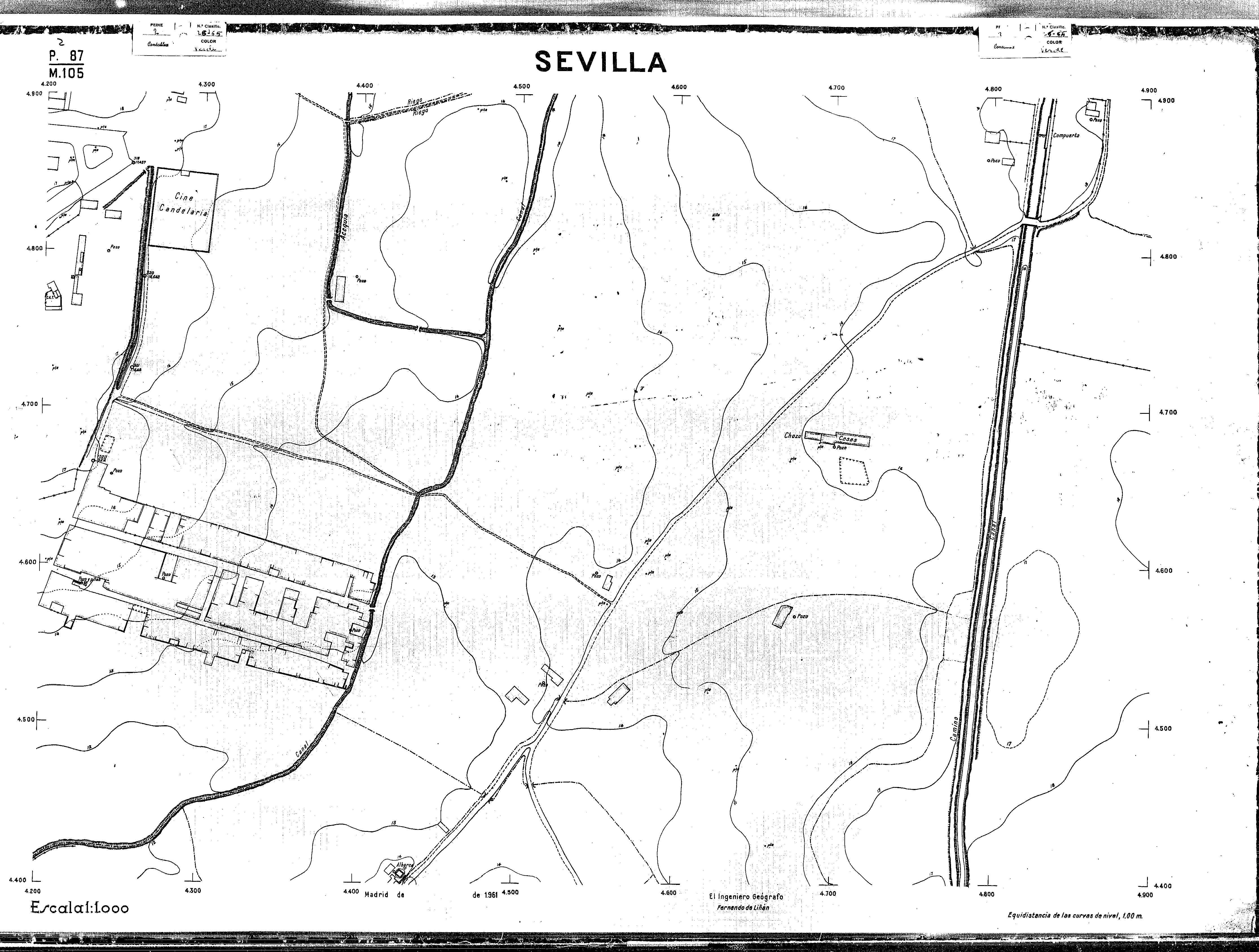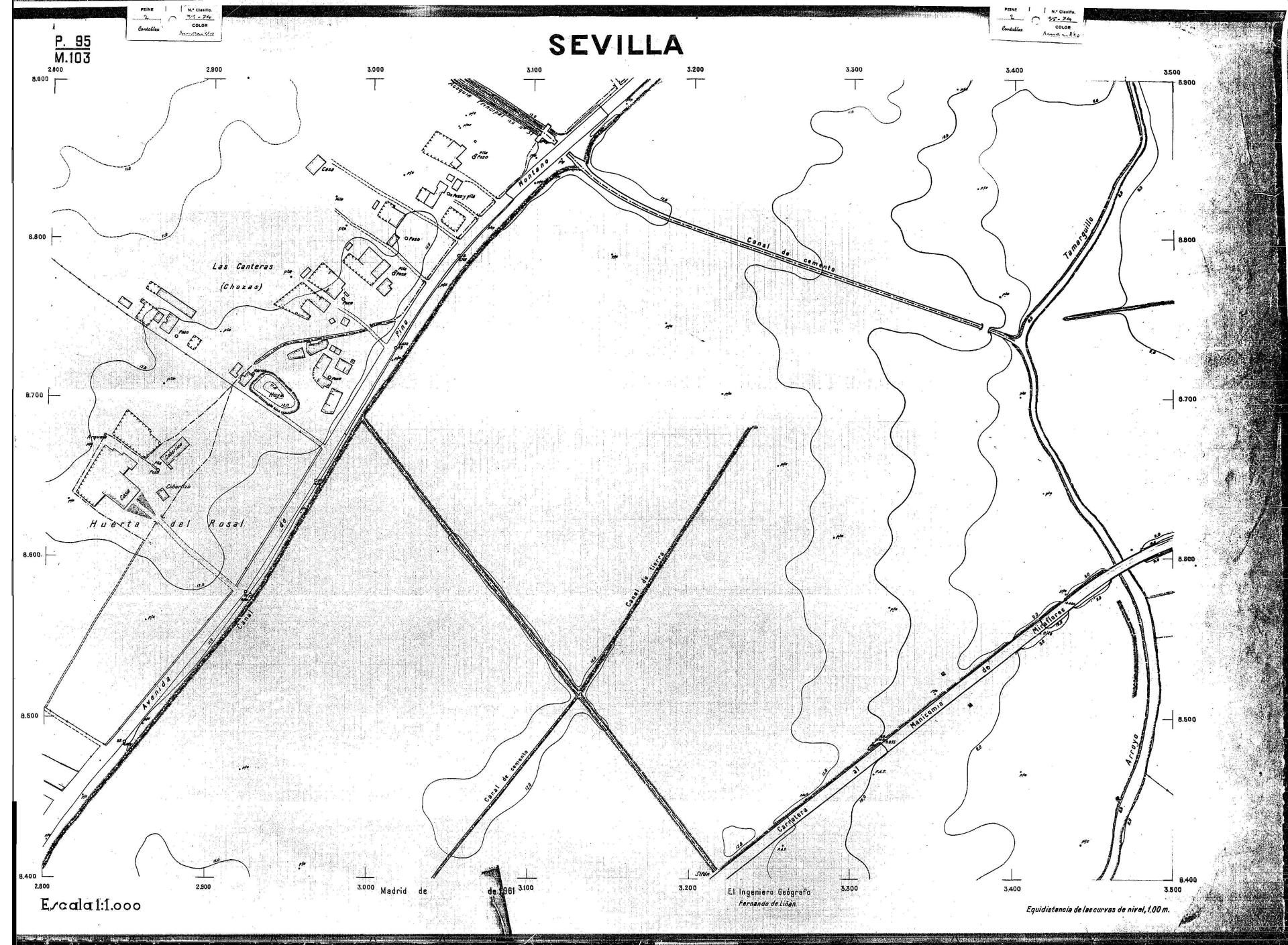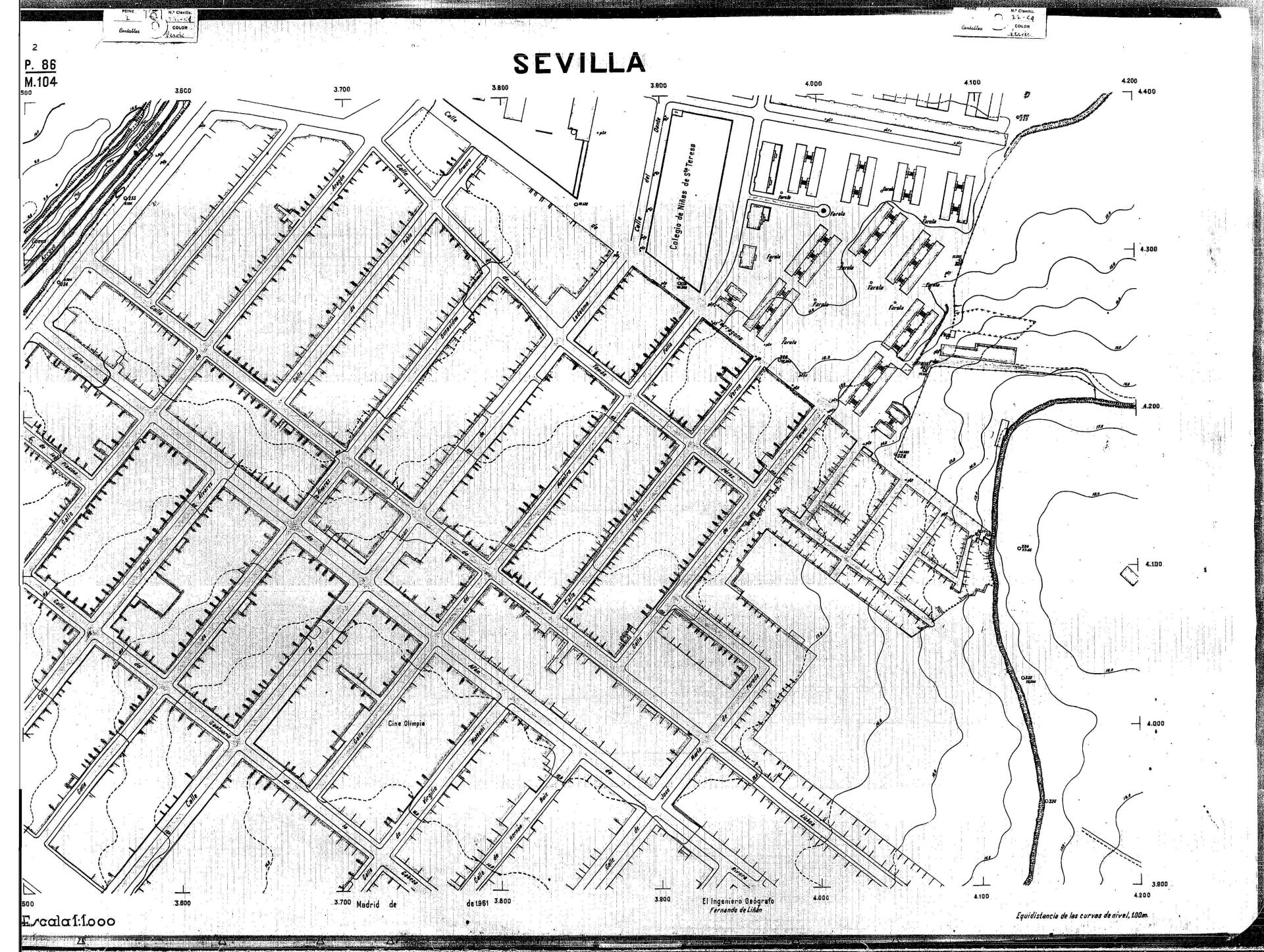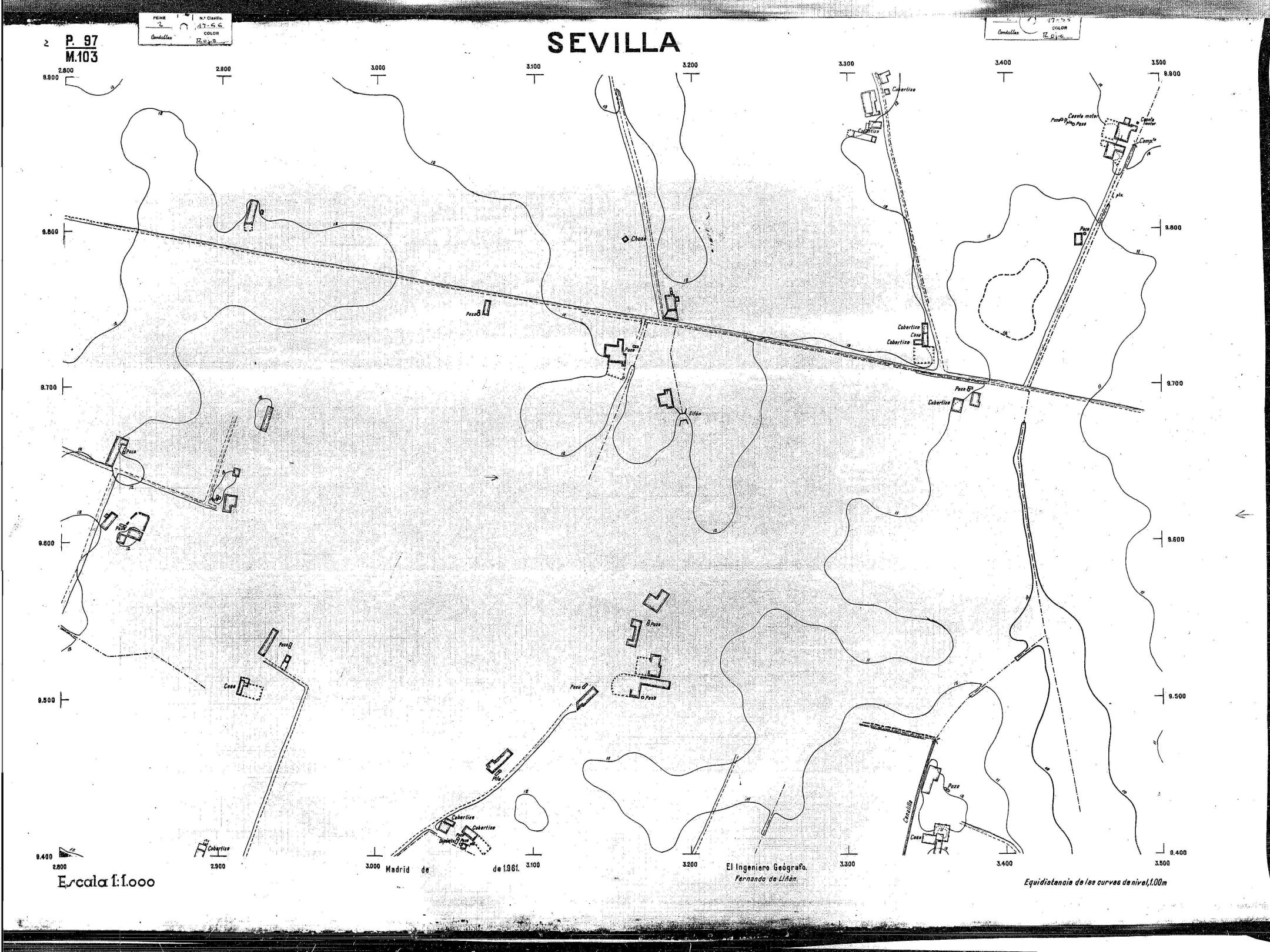 | 500 | ## | $aPlano de la zona Este de Sevilla compuesto por 70 hojas, incluyendo la hoja de composición del plano a escala 1:25000; recoge el viario identificando las calles; cada hoja indica la referencia de la cuadricula de la hoja de composición y señala en una nota "Equidistancia de las curvas de nivel, 1.00 m. | 500 | ## | $aHoja P.82/M.102, sector limitado por el muro de contención la línea del ferrocarril Madrid-Cádiz y la carretera de Su Eminencia; Hoja P.82/M.103, sector limitado por el muro de contención y la carretera de Su Eminencia; Hoja P.82/M104, recoge parte de la carretera de Su Eminencia; Hoja P.83/M.102, recoge parte del muro de contención y el arroyo Tamarguillo; Hoja P.83/M.103, recoge el arroyo del Tamarguillo y terrenos colindantes; Hoja P.83/M.104, recoge la carretera de Su Eminencia, la línea del ferrocarril Sevilla-Carmona y la autopista de la Universidad Laboral; Hoja P.84/M.102, recoge parte del arroyo del Tamarguillo y el muro de contención; Hoja P.84/M.103, recoge la línea del ferrocarril Sevilla-Alcalá de Guadaira y Carmona y la autopista de la Universidad Laboral; Hoja P.84/M.104, sector limitado por la autopista de la Universidad Laboral, la carretera de Su Eminencia y el complejo industrial de HYTASA; Hoja P.85/M.102, recoge el arroyo del Tamarguillo, el barrio del Tiro de Línea y el muro de contención; Hoja P.85/M.103, recoge el arroyo del Tamarguillo, la autopista de la Universidad Laboral y la línea del ferrocarril Sevilla-Carmona; P.85/M.104, recoge la zona industrial de HYTASA y el Cerro del Aguila; Hoja P.85/M.105, sector limitado por las calles Maqueda, Bucarelli, José Sarabia y Corte; Hoja P.86/M103, recoge el matadero municipal y las calles Juan de Herrera y Santuario de la Cabeza; Hoja P.86/M.104, recoge el arroyo del Tamarguillo y el barrio del Cerro del Aguila; Hoja P.86/M.105, recoge la carretera de Su Eminencia, un canal y unas viviendas; Hoja P.86/M.106, recoge la carretera de Su Eminencia; Hoja P.87/M.104, recoge el arroyo del Tamarguillo, los barrios Santa Teresa y Amate, y la emisora de Radio Nacional de España; Hoja P.87/M.105, recoge el cine Candelaria, un arroyo, dos canales y un camino; Hoja P.87/M.106, recoge parte de la carretera Sevilla-Dos Hermanas; Hoja P.88/M.104, recoge el arroyo el Tamarguillo, los barrios de Nuestra Señora de la Candelaria y de los Pájaros; Hoja P.88/M.105, recoge el barrio de Los Pájaros, un cortijo, una fábrica y un canal; Hoja P.88/106, recoge la carretera de Su Eminencia y el barrio de Jesús, María y José; Hoja P.89/M.104, recoge el arroyo del Tamarguillo, el barrio de Los Pájaros, la carretera Sevilla-Carmona y los restos del acueducto romano; Hoja P.89/M.105, los barrios de La Candelaria y Santa Aurelia, el cuartel de San Fernando y la carretera Sevilla-Carmona; Hoja P.89/M.106, recoge el barrio de Santa Aurelia, la ronda de circunvalación, la carretera Sevilla-Carmona, el cuartel de San Fernando y un canal; Hoja P.89/M.107, recoge parte de un viario; Hoja P.90/M.104, sector limitado por el arroyo del Tamarguillo y la carretera Amarilla; Hoja P.90/M.105, la carretera Amarilla y los terrenos adyacentes; Hoja P.90/M.106, recoge la carretera de circunvalación y un canal; Hoja P.90/M.107, recoge el arroyo de los Marañones y un canal; Hoja P.91/M.104, recoge el arroyo del Tamarguillo; Hoja P.91/M.105, recoge el barrio de Santa Clara y unas escuelas; Hoja P.91/M.106, recoge la carretera de circunvalación; Hoja P.92/M.103, recoge el arroyo del Tamarguillo; Hoja P.92/M.104, recoge la carretera de Carmona, la avda. del Aeropuerto, el barrio de Santa Clara y la fábrica de Coca-Cola; Hoja P.92/M.105, recoge el barrio de Santa Clara y la carretera de circunvalación; Hoja P.92/M.106, recoge las carreteras Amarilla y de circunvalación, y la hacienda Buena Esperanza; Hoja P.93/M.103, recoge el arroyo del Tamarguillo; Hoja P.93/M.104, recoge el barrio de Santa Clara, la avda. del Aeropuerto, la carretera Sevilla-Córdoba y la fábrica Cervecera Sevillana; Hoja P.93/M.105, recoge el barrio de Santa Clara, la avda. del Aeropuerto y la carretera de circunvalación; Hoja P.93/M.106, recoge los terrenos adyacentes a la carretera de circunvalación; Hoja P.94/M.102, recoge la línea del ferrocarril Sevilla-Cádiz, la avda. Pino Montano y el barrio de Pino Montano; Hoja P.95/M.103, recoge el arroyo del Tamarguillo, el hospital psiquiátrico y la carretera que le da acceso; Hoja P.94/M.104, recoge los terrenos adyacentes al hospital psiquiátrico; Hoja P.94/M.105, recoge un canal y el consultorio de la Gota de Leche; Hoja P.94/M.106, recoge la línea del ferrocarril Madrid-Cádiz y el barrio de los Carteros; Hoja P.95/M.103, recoge el arroyo del Tamarguillo, la avda. de Pino Montano, el barrio de Pino Montano y la carretera del hospital psiquiátrico; Hoja P.95/M.104, recoge la carretera del hospital psiquiátrico, el cortijo de Miraflores y un canal; Hoja P.95/M.105, recoge los terrenos próximos al cortijo de Miraflores; Hoja P.96/M. 102, recoge la línea del ferrocarril Madrid-Cádiz, el cementerio de San Fernando, las huertas del Buen Pastor y Molina, y una acequia; Hoja P.96/M.103, recoge la avda. de Pino Montano y las huertas de Molina y del Rosal Chico y del Pasillo de los Toros; Hoja P.96/M.104, recoge el arroyo del Tamarguillo y la avda. de Pino Montano; Hoja P.97/M.100, recoge el río Guadalquivir y el cementerio de los Ingleses; Hoja P.97/M.101, recoge el barrio de San Jerónimo, el cementerio de San Fernando, una fábrica de abonos, la carretera Sevilla-La Algaba y la línea del ferrocarril Madrid-Sevilla; Hoja P.97/M.102, recoge la línea del ferrocarril Madrid-Cádiz, la carretera de Brenes, el cementerio de San Fernando y la fábrica Viguetas Castilla; Hoja P.97/M.103, recoge los terrenos próximos a la línea del ferrocarril Madrid-Cádiz; Hoja P.97/M.104, recoge el arroyo del Tamarguillo, la avda. de Pino Montano y la hacienda Casillas de San Jerónimo de Buena Vista; Hoja P
