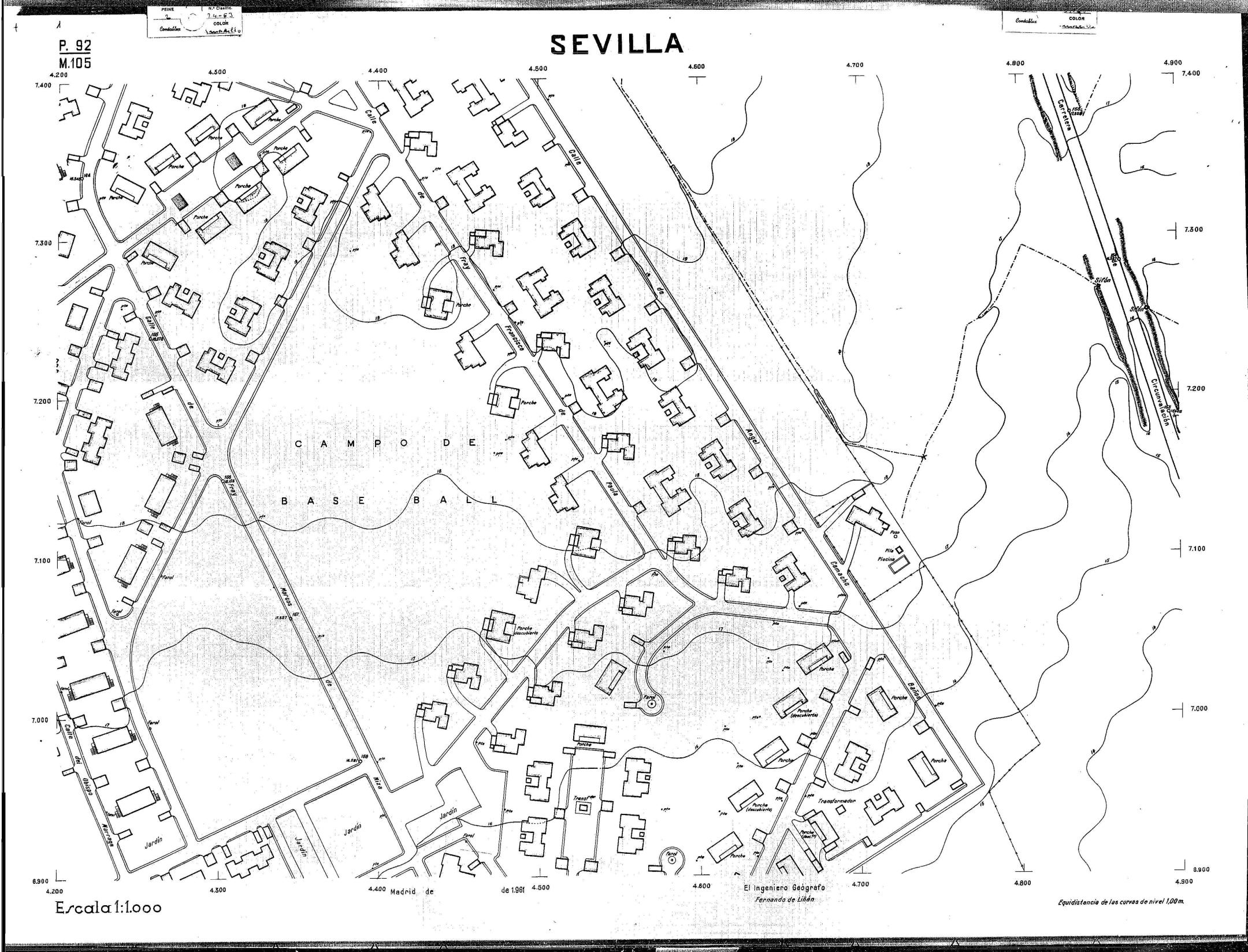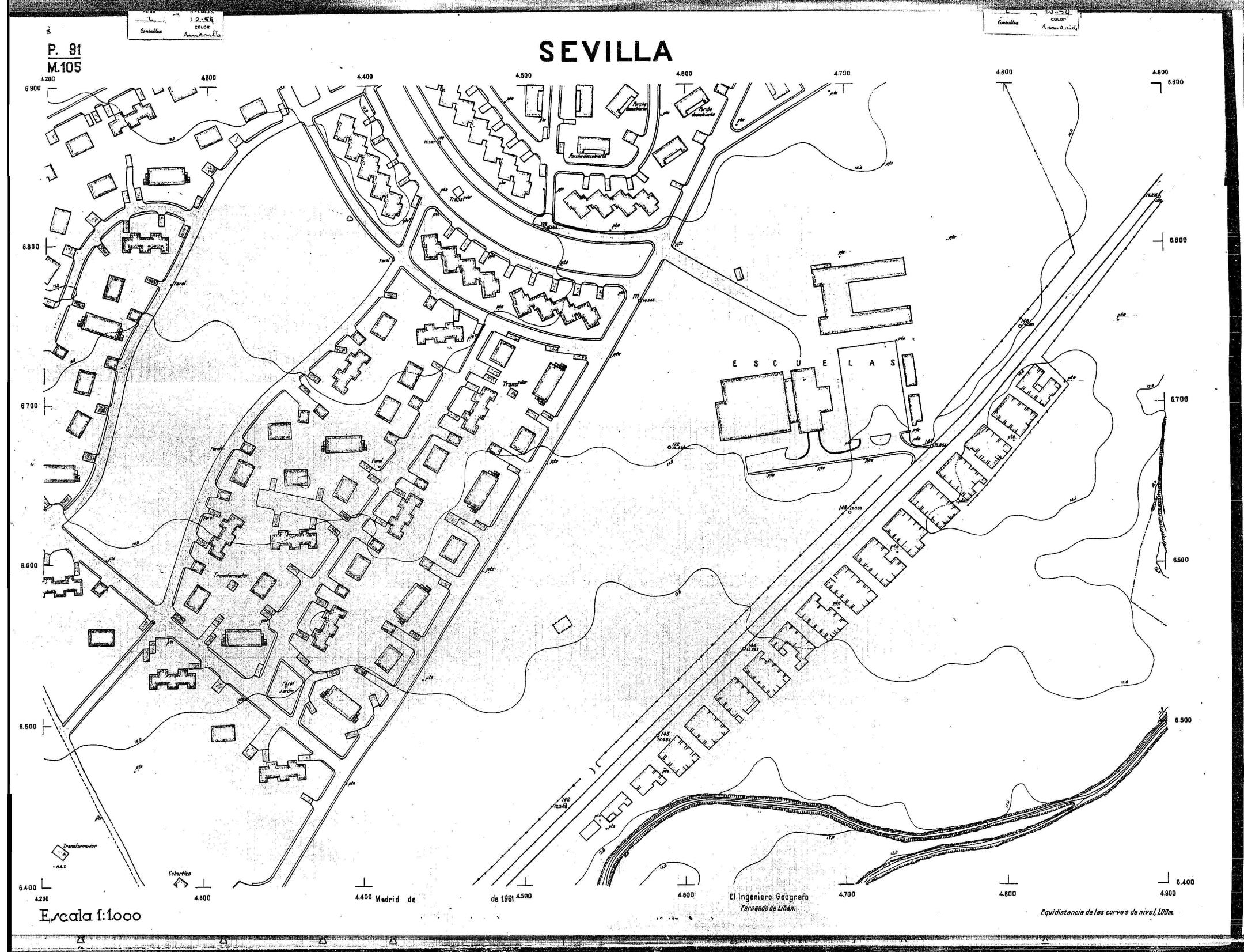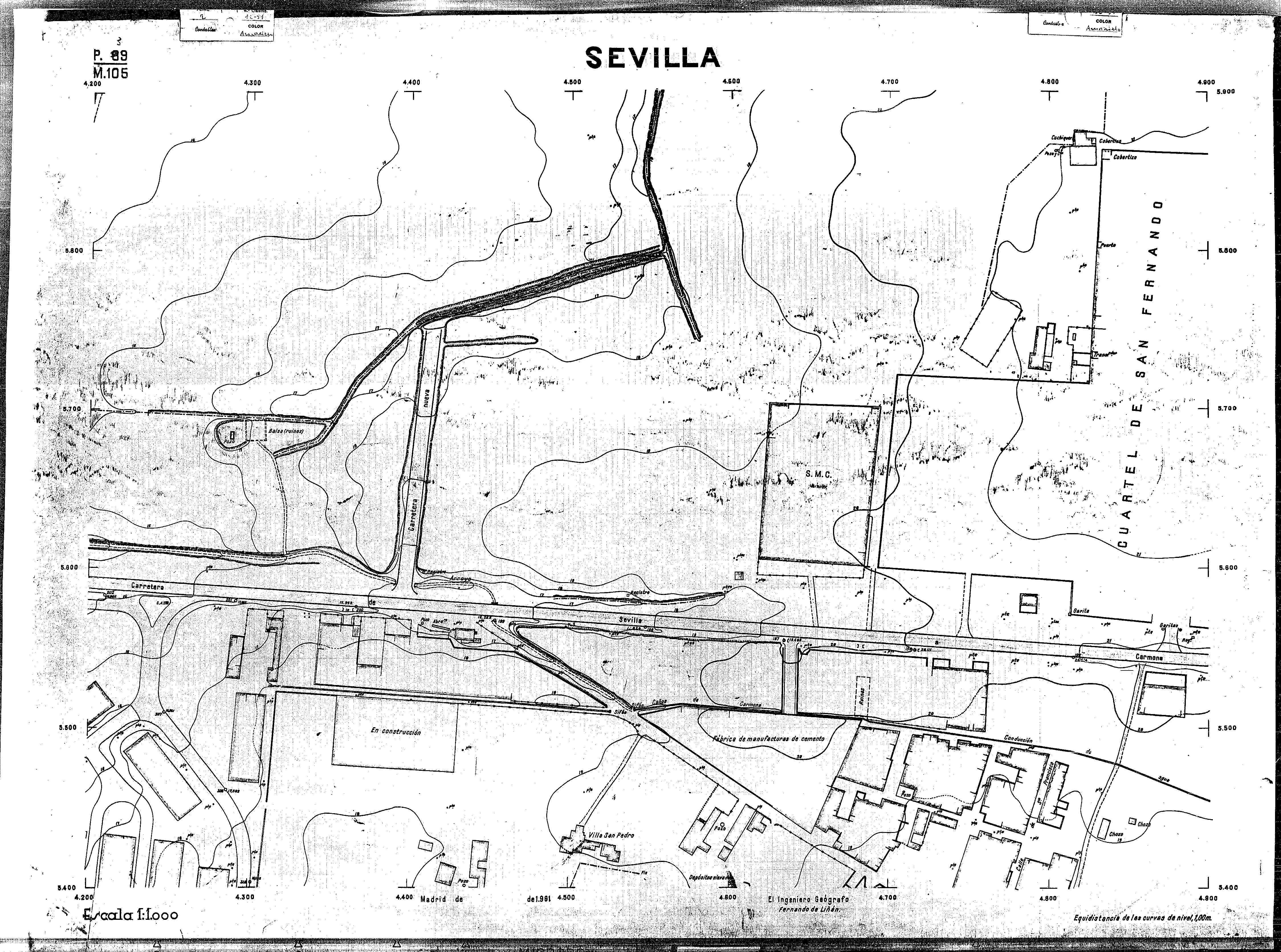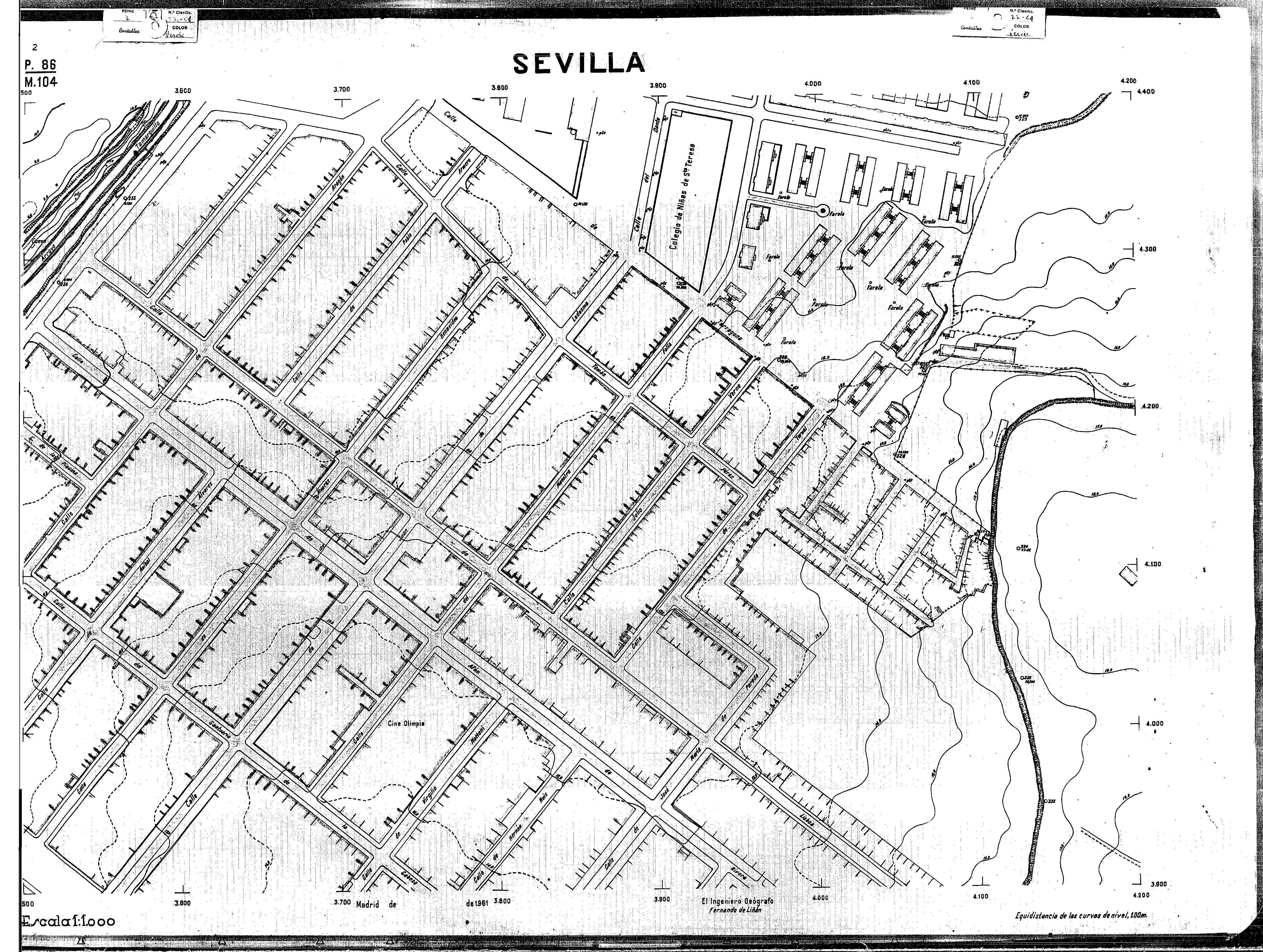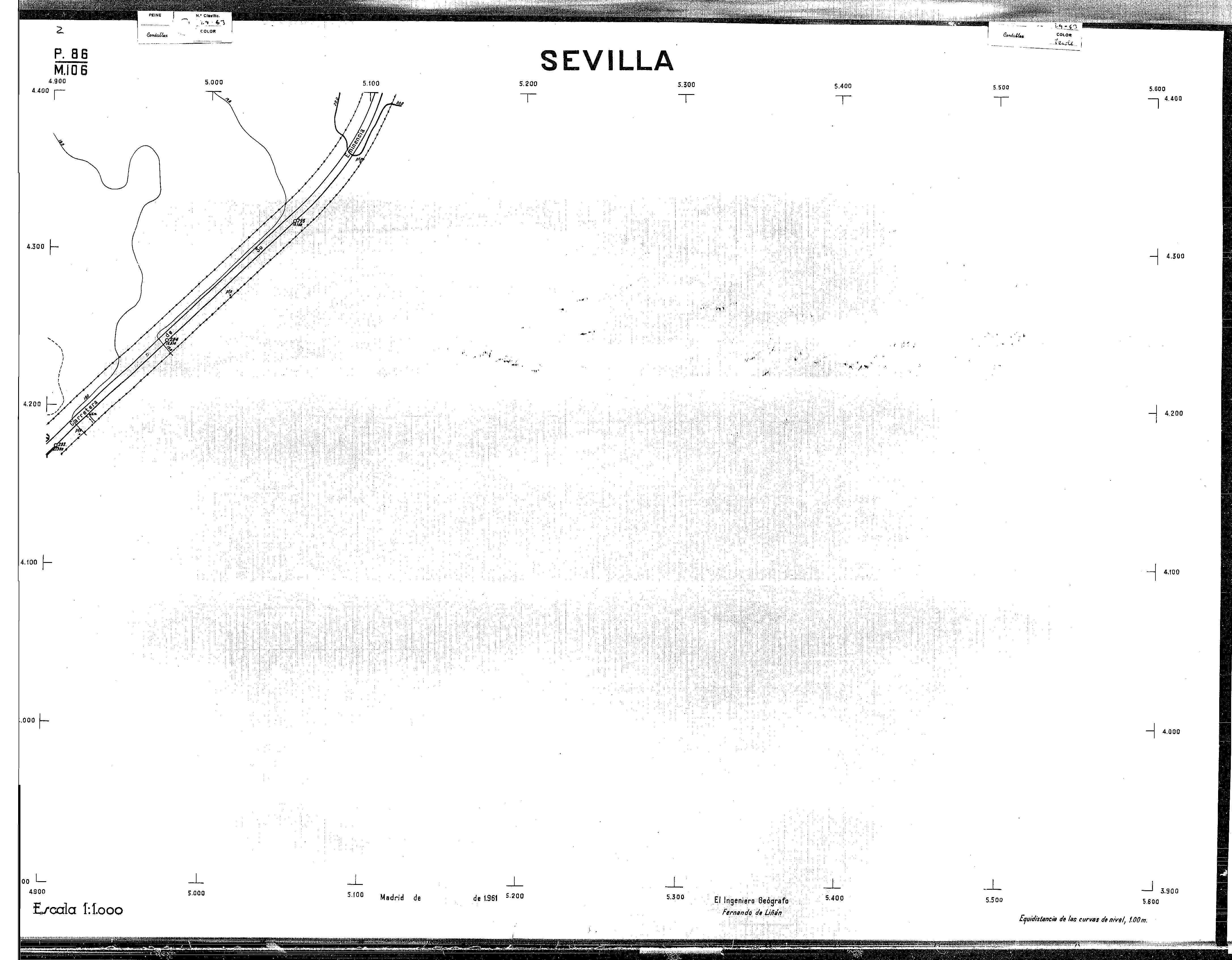 | 500 | ## | $aPlano de la zona Este de Sevilla compuesto por 70 hojas, incluyendo la hoja de composición del plano a escala 1:25000; recoge el viario identificando las calles; cada hoja indica la referencia de la cuadricula de la hoja de composición y señala en una nota "Equidistancia de las curvas de nivel, 1.00 m. | 500 | ## | $aHoja P.82/M.102, sector limitado por el muro de contención la línea del ferrocarril Madrid-Cádiz y la carretera de Su Eminencia; Hoja P.82/M.103, sector limitado por el muro de contención y la carretera de Su Eminencia; Hoja P.82/M104, recoge parte de la carretera de Su Eminencia; Hoja P.83/M.102, recoge parte del muro de contención y el arroyo Tamarguillo; Hoja P.83/M.103, recoge el arroyo del Tamarguillo y terrenos colindantes; Hoja P.83/M.104, recoge la carretera de Su Eminencia, la línea del ferrocarril Sevilla-Carmona y la autopista de la Universidad Laboral; Hoja P.84/M.102, recoge parte del arroyo del Tamarguillo y el muro de contención; Hoja P.84/M.103, recoge la línea del ferrocarril Sevilla-Alcalá de Guadaira y Carmona y la autopista de la Universidad Laboral; Hoja P.84/M.104, sector limitado por la autopista de la Universidad Laboral, la carretera de Su Eminencia y el complejo industrial de HYTASA; Hoja P.85/M.102, recoge el arroyo del Tamarguillo, el barrio del Tiro de Línea y el muro de contención; Hoja P.85/M.103, recoge el arroyo del Tamarguillo, la autopista de la Universidad Laboral y la línea del ferrocarril Sevilla-Carmona; P.85/M.104, recoge la zona industrial de HYTASA y el Cerro del Aguila; Hoja P.85/M.105, sector limitado por las calles Maqueda, Bucarelli, José Sarabia y Corte; Hoja P.86/M103, recoge el matadero municipal y las calles Juan de Herrera y Santuario de la Cabeza; Hoja P.86/M.104, recoge el arroyo del Tamarguillo y el barrio del Cerro del Aguila; Hoja P.86/M.105, recoge la carretera de Su Eminencia, un canal y unas viviendas; Hoja P.86/M.106, recoge la carretera de Su Eminencia; Hoja P.87/M.104, recoge el arroyo del Tamarguillo, los barrios Santa Teresa y Amate, y la emisora de Radio Nacional de España; Hoja P.87/M.105, recoge el cine Candelaria, un arroyo, dos canales y un camino; Hoja P.87/M.106, recoge parte de la carretera Sevilla-Dos Hermanas; Hoja P.88/M.104, recoge el arroyo el Tamarguillo, los barrios de Nuestra Señora de la Candelaria y de los Pájaros; Hoja P.88/M.105, recoge el barrio de Los Pájaros, un cortijo, una fábrica y un canal; Hoja P.88/106, recoge la carretera de Su Eminencia y el barrio de Jesús, María y José; Hoja P.89/M.104, recoge el arroyo del Tamarguillo, el barrio de Los Pájaros, la carretera Sevilla-Carmona y los restos del acueducto romano; Hoja P.89/M.105, los barrios de La Candelaria y Santa Aurelia, el cuartel de San Fernando y la carretera Sevilla-Carmona; Hoja P.89/M.106, recoge el barrio de Santa Aurelia, la ronda de circunvalación, la carretera Sevilla-Carmona, el cuartel de San Fernando y un canal; Hoja P.89/M.107, recoge parte de un viario; Hoja P.90/M.104, sector limitado por el arroyo del Tamarguillo y la carretera Amarilla; Hoja P.90/M.105, la carretera Amarilla y los terrenos adyacentes; Hoja P.90/M.106, recoge la carretera de circunvalación y un canal; Hoja P.90/M.107, recoge el arroyo de los Marañones y un canal; Hoja P.91/M.104, recoge el arroyo del Tamarguillo; Hoja P.91/M.105, recoge el barrio de Santa Clara y unas escuelas; Hoja P.91/M.106, recoge la carretera de circunvalación; Hoja P.92/M.103, recoge el arroyo del Tamarguillo; Hoja P.92/M.104, recoge la carretera de Carmona, la avda. del Aeropuerto, el barrio de Santa Clara y la fábrica de Coca-Cola; Hoja P.92/M.105, recoge el barrio de Santa Clara y la carretera de circunvalación; Hoja P.92/M.106, recoge las carreteras Amarilla y de circunvalación, y la hacienda Buena Esperanza; Hoja P.93/M.103, recoge el arroyo del Tamarguillo; Hoja P.93/M.104, recoge el barrio de Santa Clara, la avda. del Aeropuerto, la carretera Sevilla-Córdoba y la fábrica Cervecera Sevillana; Hoja P.93/M.105, recoge el barrio de Santa Clara, la avda. del Aeropuerto y la carretera de circunvalación; Hoja P.93/M.106, recoge los terrenos adyacentes a la carretera de circunvalación; Hoja P.94/M.102, recoge la línea del ferrocarril Sevilla-Cádiz, la avda. Pino Montano y el barrio de Pino Montano; Hoja P.95/M.103, recoge el arroyo del Tamarguillo, el hospital psiquiátrico y la carretera que le da acceso; Hoja P.94/M.104, recoge los terrenos adyacentes al hospital psiquiátrico; Hoja P.94/M.105, recoge un canal y el consultorio de la Gota de Leche; Hoja P.94/M.106, recoge la línea del ferrocarril Madrid-Cádiz y el barrio de los Carteros; Hoja P.95/M.103, recoge el arroyo del Tamarguillo, la avda. de Pino Montano, el barrio de Pino Montano y la carretera del hospital psiquiátrico; Hoja P.95/M.104, recoge la carretera del hospital psiquiátrico, el cortijo de Miraflores y un canal; Hoja P.95/M.105, recoge los terrenos próximos al cortijo de Miraflores; Hoja P.96/M. 102, recoge la línea del ferrocarril Madrid-Cádiz, el cementerio de San Fernando, las huertas del Buen Pastor y Molina, y una acequia; Hoja P.96/M.103, recoge la avda. de Pino Montano y las huertas de Molina y del Rosal Chico y del Pasillo de los Toros; Hoja P.96/M.104, recoge el arroyo del Tamarguillo y la avda. de Pino Montano; Hoja P.97/M.100, recoge el río Guadalquivir y el cementerio de los Ingleses; Hoja P.97/M.101, recoge el barrio de San Jerónimo, el cementerio de San Fernando, una fábrica de abonos, la carretera Sevilla-La Algaba y la línea del ferrocarril Madrid-Sevilla; Hoja P.97/M.102, recoge la línea del ferrocarril Madrid-Cádiz, la carretera de Brenes, el cementerio de San Fernando y la fábrica Viguetas Castilla; Hoja P.97/M.103, recoge los terrenos próximos a la línea del ferrocarril Madrid-Cádiz; Hoja P.97/M.104, recoge el arroyo del Tamarguillo, la avda. de Pino Montano y la hacienda Casillas de San Jerónimo de Buena Vista; Hoja P