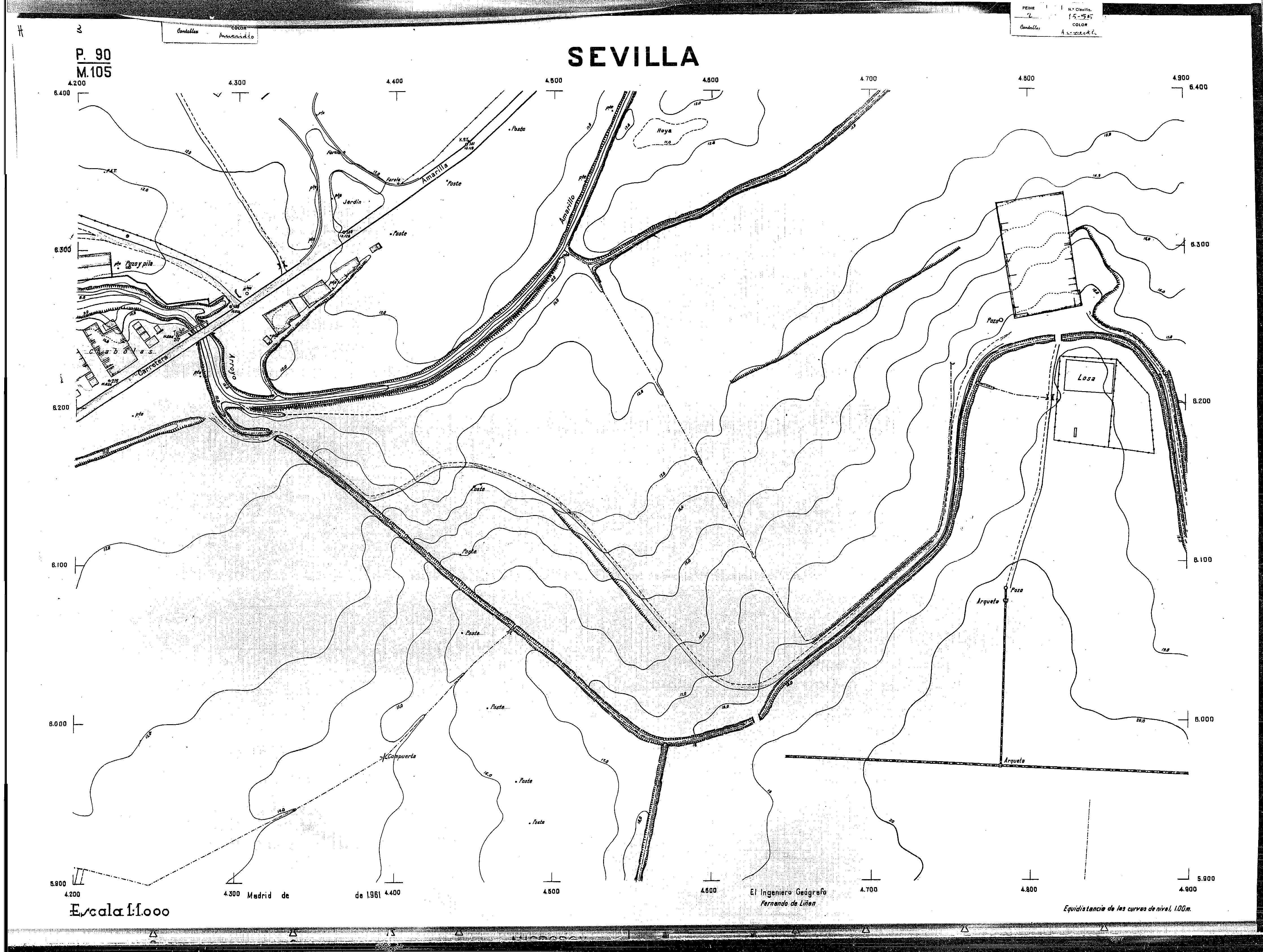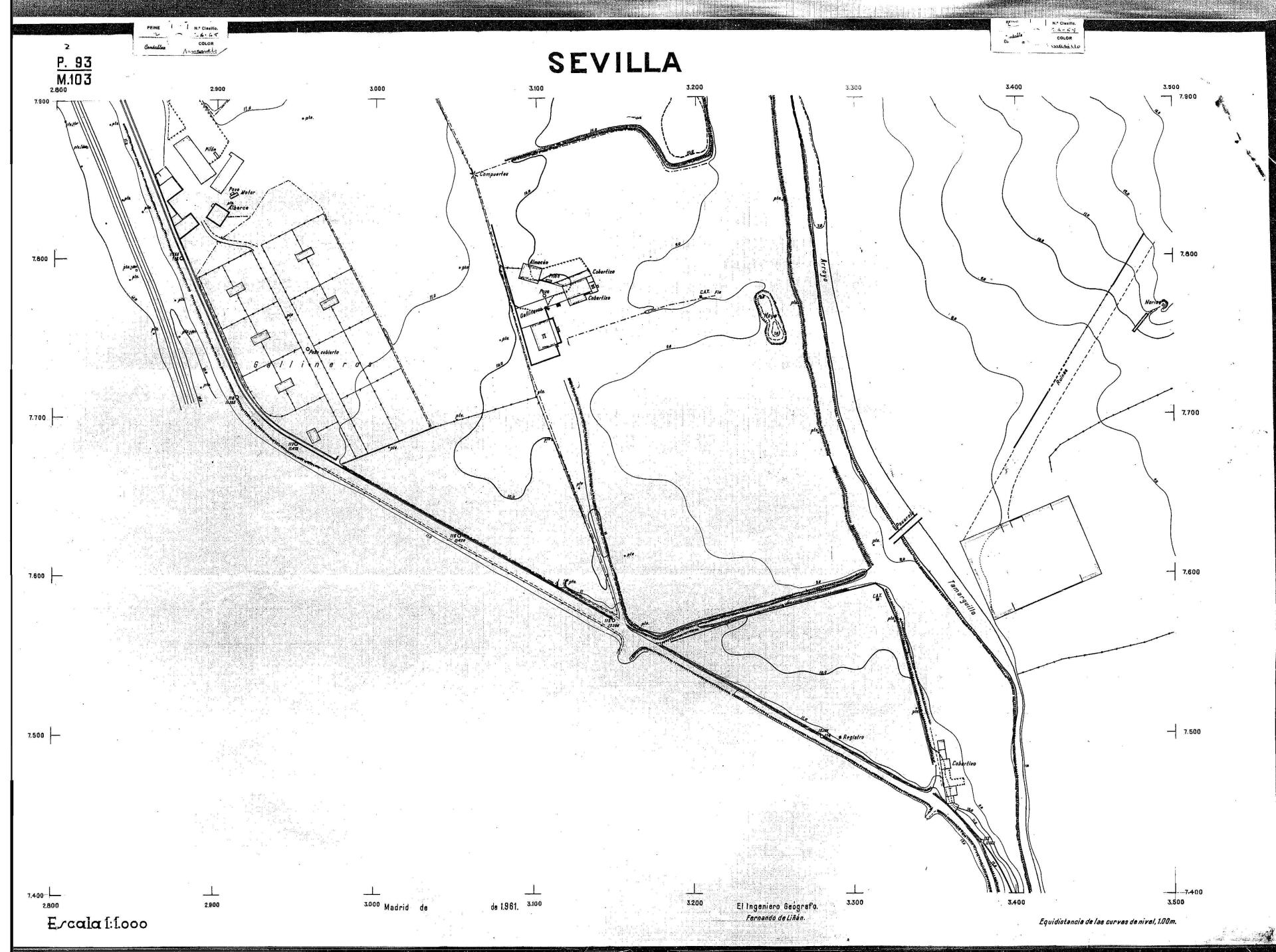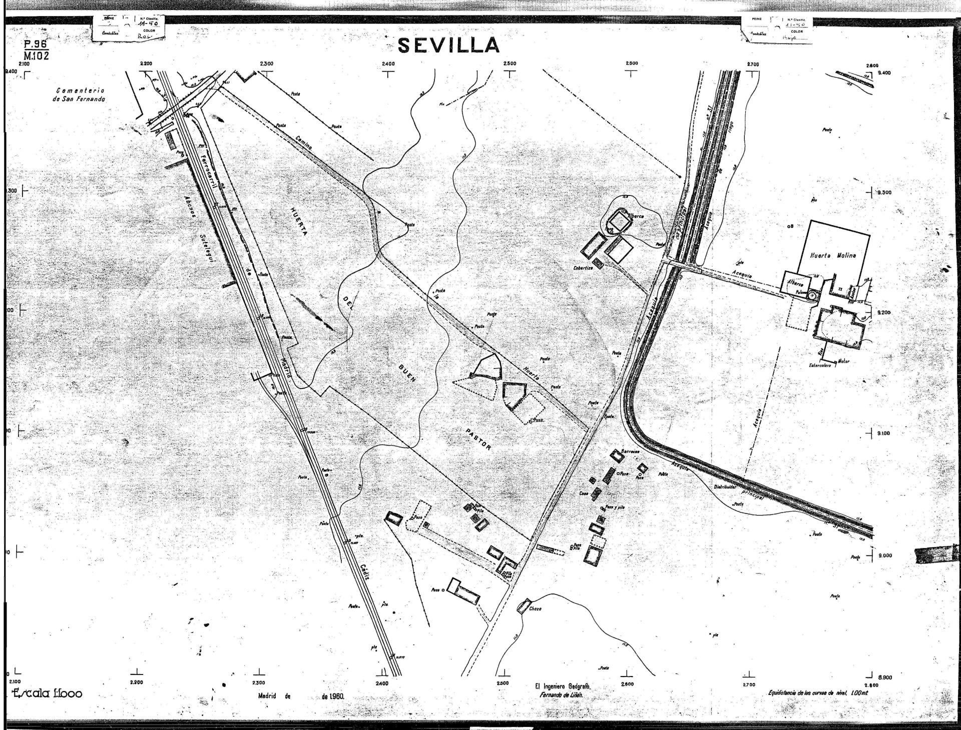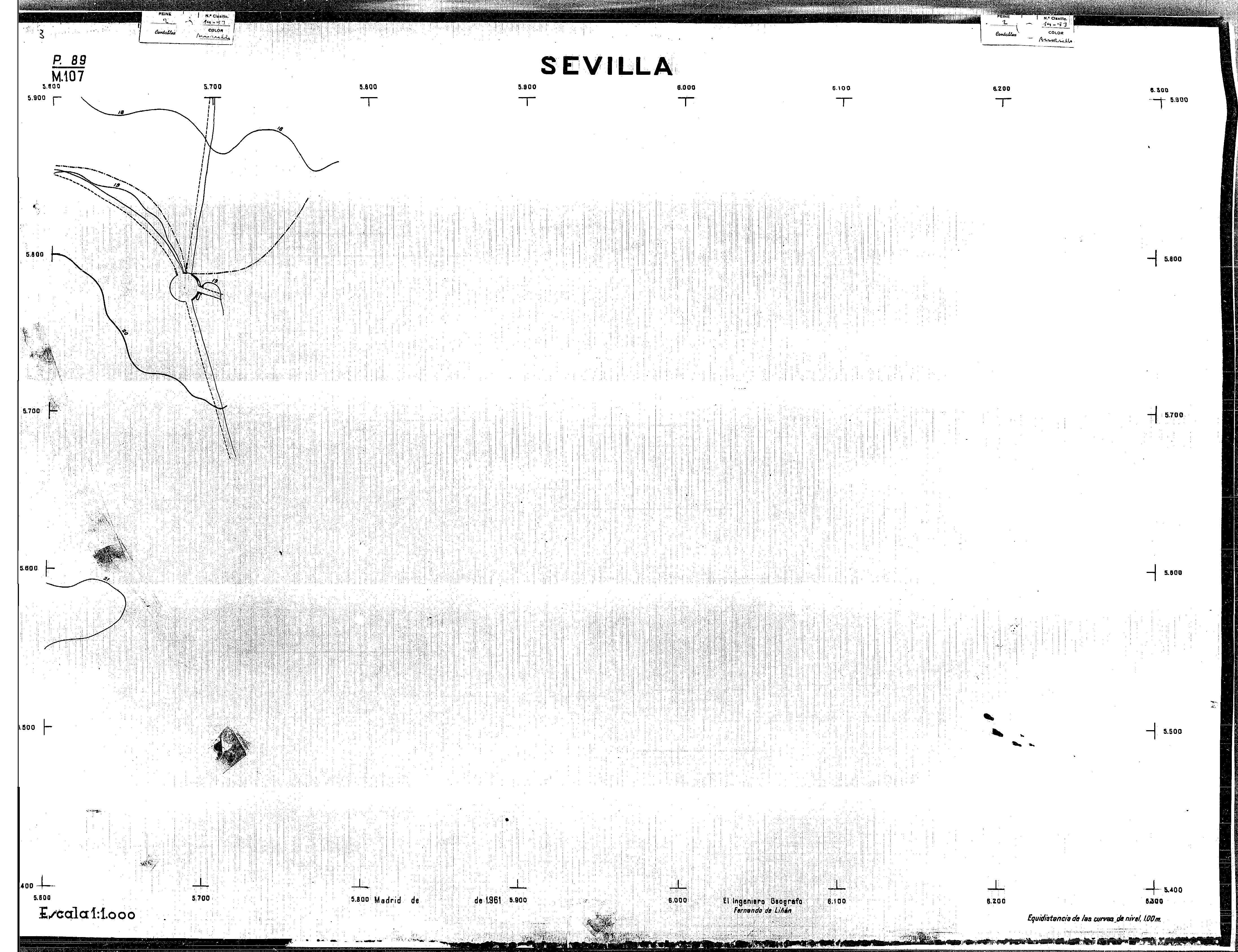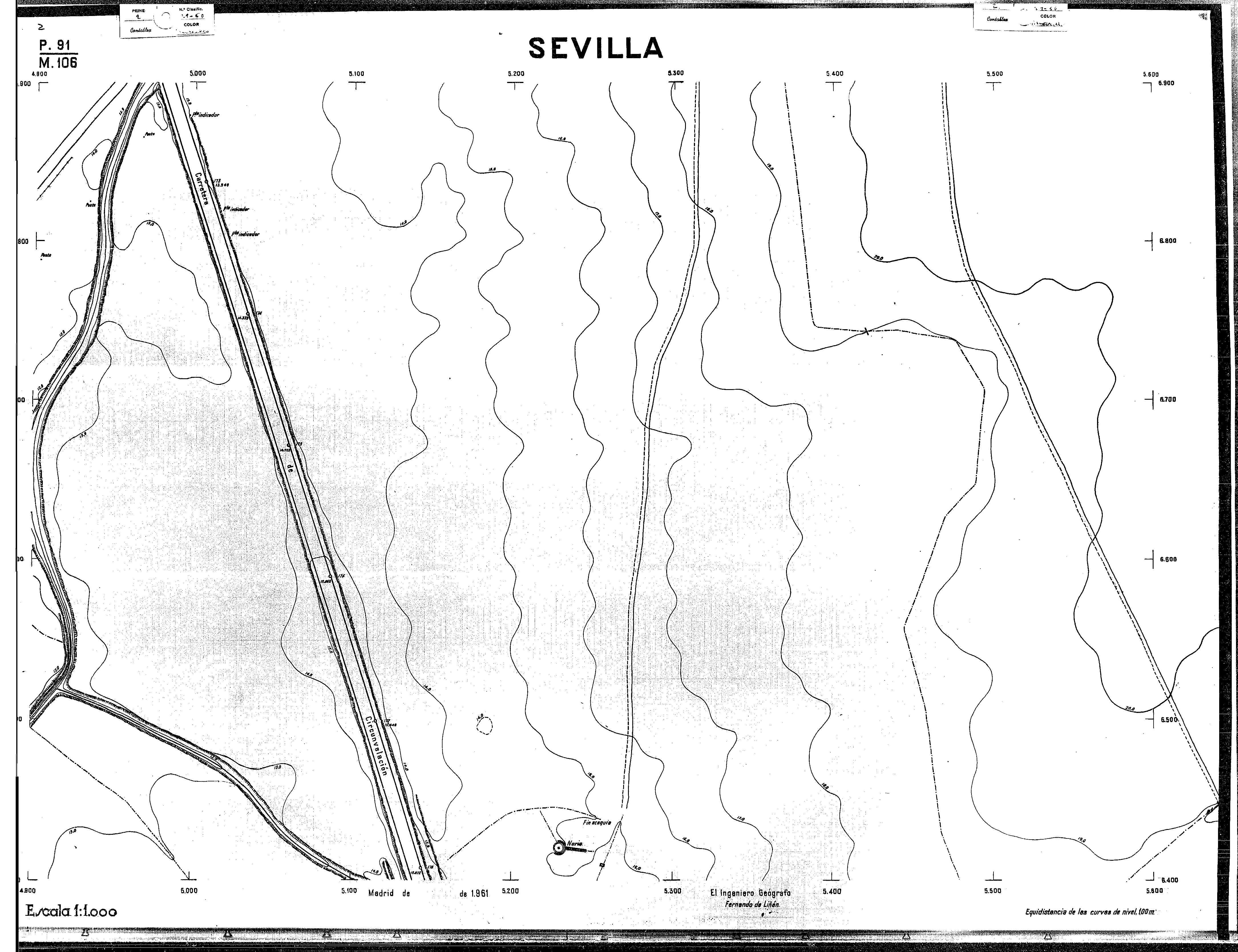 | 500 | ## | $aPlano de la zona Este de Sevilla compuesto por 70 hojas, incluyendo la hoja de composición del plano a escala 1:25000; recoge el viario identificando las calles; cada hoja indica la referencia de la cuadricula de la hoja de composición y señala en una nota "Equidistancia de las curvas de nivel, 1.00 m. | 500 | ## | $aHoja P.82/M.102, sector limitado por el muro de contención la línea del ferrocarril Madrid-Cádiz y la carretera de Su Eminencia; Hoja P.82/M.103, sector limitado por el muro de contención y la carretera de Su Eminencia; Hoja P.82/M104, recoge parte de la carretera de Su Eminencia; Hoja P.83/M.102, recoge parte del muro de contención y el arroyo Tamarguillo; Hoja P.83/M.103, recoge el arroyo del Tamarguillo y terrenos colindantes; Hoja P.83/M.104, recoge la carretera de Su Eminencia, la línea del ferrocarril Sevilla-Carmona y la autopista de la Universidad Laboral; Hoja P.84/M.102, recoge parte del arroyo del Tamarguillo y el muro de contención; Hoja P.84/M.103, recoge la línea del ferrocarril Sevilla-Alcalá de Guadaira y Carmona y la autopista de la Universidad Laboral; Hoja P.84/M.104, sector limitado por la autopista de la Universidad Laboral, la carretera de Su Eminencia y el complejo industrial de HYTASA; Hoja P.85/M.102, recoge el arroyo del Tamarguillo, el barrio del Tiro de Línea y el muro de contención; Hoja P.85/M.103, recoge el arroyo del Tamarguillo, la autopista de la Universidad Laboral y la línea del ferrocarril Sevilla-Carmona; P.85/M.104, recoge la zona industrial de HYTASA y el Cerro del Aguila; Hoja P.85/M.105, sector limitado por las calles Maqueda, Bucarelli, José Sarabia y Corte; Hoja P.86/M103, recoge el matadero municipal y las calles Juan de Herrera y Santuario de la Cabeza; Hoja P.86/M.104, recoge el arroyo del Tamarguillo y el barrio del Cerro del Aguila; Hoja P.86/M.105, recoge la carretera de Su Eminencia, un canal y unas viviendas; Hoja P.86/M.106, recoge la carretera de Su Eminencia; Hoja P.87/M.104, recoge el arroyo del Tamarguillo, los barrios Santa Teresa y Amate, y la emisora de Radio Nacional de España; Hoja P.87/M.105, recoge el cine Candelaria, un arroyo, dos canales y un camino; Hoja P.87/M.106, recoge parte de la carretera Sevilla-Dos Hermanas; Hoja P.88/M.104, recoge el arroyo el Tamarguillo, los barrios de Nuestra Señora de la Candelaria y de los Pájaros; Hoja P.88/M.105, recoge el barrio de Los Pájaros, un cortijo, una fábrica y un canal; Hoja P.88/106, recoge la carretera de Su Eminencia y el barrio de Jesús, María y José; Hoja P.89/M.104, recoge el arroyo del Tamarguillo, el barrio de Los Pájaros, la carretera Sevilla-Carmona y los restos del acueducto romano; Hoja P.89/M.105, los barrios de La Candelaria y Santa Aurelia, el cuartel de San Fernando y la carretera Sevilla-Carmona; Hoja P.89/M.106, recoge el barrio de Santa Aurelia, la ronda de circunvalación, la carretera Sevilla-Carmona, el cuartel de San Fernando y un canal; Hoja P.89/M.107, recoge parte de un viario; Hoja P.90/M.104, sector limitado por el arroyo del Tamarguillo y la carretera Amarilla; Hoja P.90/M.105, la carretera Amarilla y los terrenos adyacentes; Hoja P.90/M.106, recoge la carretera de circunvalación y un canal; Hoja P.90/M.107, recoge el arroyo de los Marañones y un canal; Hoja P.91/M.104, recoge el arroyo del Tamarguillo; Hoja P.91/M.105, recoge el barrio de Santa Clara y unas escuelas; Hoja P.91/M.106, recoge la carretera de circunvalación; Hoja P.92/M.103, recoge el arroyo del Tamarguillo; Hoja P.92/M.104, recoge la carretera de Carmona, la avda. del Aeropuerto, el barrio de Santa Clara y la fábrica de Coca-Cola; Hoja P.92/M.105, recoge el barrio de Santa Clara y la carretera de circunvalación; Hoja P.92/M.106, recoge las carreteras Amarilla y de circunvalación, y la hacienda Buena Esperanza; Hoja P.93/M.103, recoge el arroyo del Tamarguillo; Hoja P.93/M.104, recoge el barrio de Santa Clara, la avda. del Aeropuerto, la carretera Sevilla-Córdoba y la fábrica Cervecera Sevillana; Hoja P.93/M.105, recoge el barrio de Santa Clara, la avda. del Aeropuerto y la carretera de circunvalación; Hoja P.93/M.106, recoge los terrenos adyacentes a la carretera de circunvalación; Hoja P.94/M.102, recoge la línea del ferrocarril Sevilla-Cádiz, la avda. Pino Montano y el barrio de Pino Montano; Hoja P.95/M.103, recoge el arroyo del Tamarguillo, el hospital psiquiátrico y la carretera que le da acceso; Hoja P.94/M.104, recoge los terrenos adyacentes al hospital psiquiátrico; Hoja P.94/M.105, recoge un canal y el consultorio de la Gota de Leche; Hoja P.94/M.106, recoge la línea del ferrocarril Madrid-Cádiz y el barrio de los Carteros; Hoja P.95/M.103, recoge el arroyo del Tamarguillo, la avda. de Pino Montano, el barrio de Pino Montano y la carretera del hospital psiquiátrico; Hoja P.95/M.104, recoge la carretera del hospital psiquiátrico, el cortijo de Miraflores y un canal; Hoja P.95/M.105, recoge los terrenos próximos al cortijo de Miraflores; Hoja P.96/M. 102, recoge la línea del ferrocarril Madrid-Cádiz, el cementerio de San Fernando, las huertas del Buen Pastor y Molina, y una acequia; Hoja P.96/M.103, recoge la avda. de Pino Montano y las huertas de Molina y del Rosal Chico y del Pasillo de los Toros; Hoja P.96/M.104, recoge el arroyo del Tamarguillo y la avda. de Pino Montano; Hoja P.97/M.100, recoge el río Guadalquivir y el cementerio de los Ingleses; Hoja P.97/M.101, recoge el barrio de San Jerónimo, el cementerio de San Fernando, una fábrica de abonos, la carretera Sevilla-La Algaba y la línea del ferrocarril Madrid-Sevilla; Hoja P.97/M.102, recoge la línea del ferrocarril Madrid-Cádiz, la carretera de Brenes, el cementerio de San Fernando y la fábrica Viguetas Castilla; Hoja P.97/M.103, recoge los terrenos próximos a la línea del ferrocarril Madrid-Cádiz; Hoja P.97/M.104, recoge el arroyo del Tamarguillo, la avda. de Pino Montano y la hacienda Casillas de San Jerónimo de Buena Vista; Hoja P