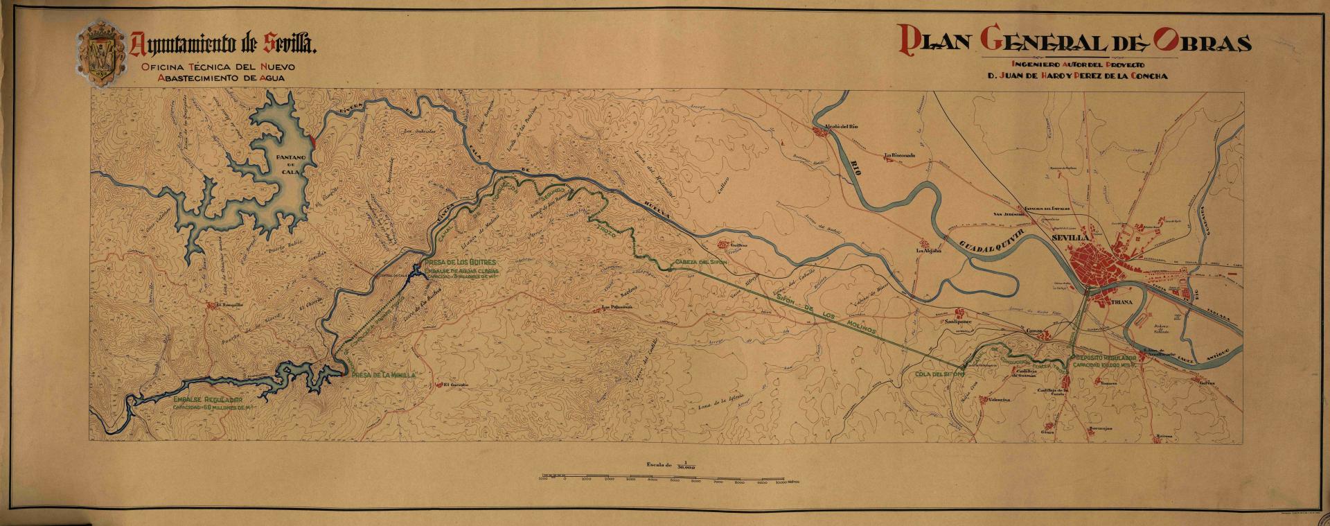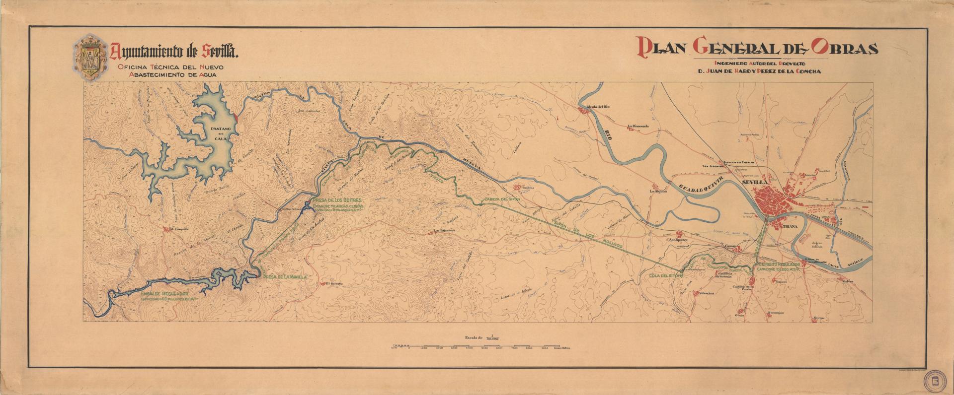 | 500 | ## | $aRecoge los ríos Guadalquivir, Rivera de Cala, Rivera de Huelva y Guadaira, diversos arroyos, el emplazamiento de los núcleos urbanos de Sevilla, Gelves, Mairena del Aljarafe, Tomares, Bormujos, Gines, San Juan de Aznalfarache, Castilleja de la Cuesta, Valencina, Castilleja de Guzmán, Camas, Santiponce, La Algaba, La Rinconada, Alcalá del Río, Guillena, Las Pajanosas, El Ronquillo y El Garrobo, el pantano de Cala, las presas de los Buitres y de la Minilla, el embalse regulador, el trazado del sifón de Los Molinos, la situación de la cabeza y la cola del mismo, el depósito regulador, la tubería forzada, las líneas del ferrocarril Minas de Cala a San Juan de Aznalfarache, Sevilla-Cádiz y Sevilla-Carmona, la estación ferroviaria del Empalme, las carreteras de Castilleja de la Cuesta a Badajoz, de Sevilla a La Puebla del Río, de Alcalá de Guadaira a Huelva, de Sevilla a Carmona, de Sevilla a Castilblanco de los Arroyos, diversos caminos, la fábrica de la Cartuja y numerosas casas y cortijos | 500 | ## | $aContiene el escudo del Ayuntamiento de Sevilla y el sello de la Empresa Municipal de Abastecimiento y Saneamiento de Aguas de Sevilla |