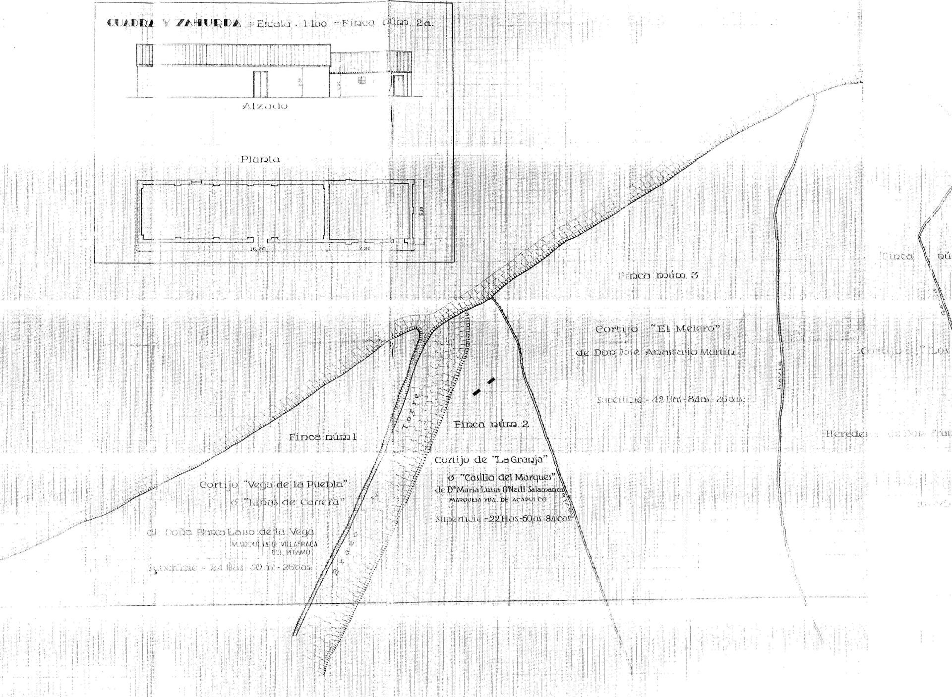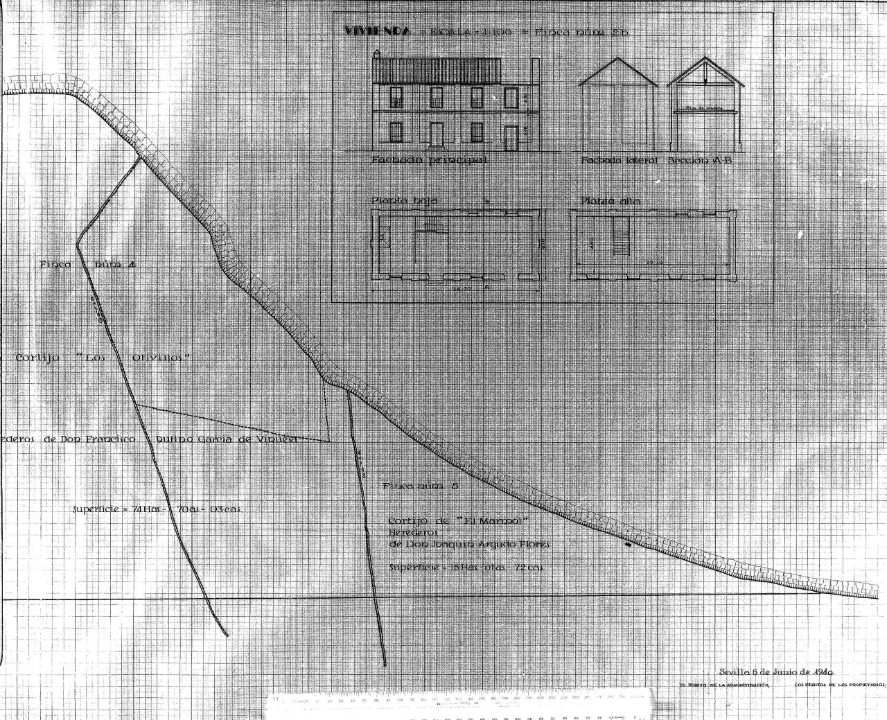 | 500 | ## | $aDebajo de la fecha aparece la antefirma sin rúbrica del perito de la administración y la de los peritos de los propietarios. Los autores se han extraído del 2º ejemplar | 500 | ## | $aRecoge el Brazo de la Torre y el Brazo de Casas Reales; las fincas separadas por gavias están identificadas con nº, nombre de la finca, nombre del titular y superficie, aparecen los siguientes cortijos: de O a E del plano "Vega de La Puebla" o "Niñas de Correra", "La Granja" o "Casilla del Marqués", "El Mesero", "Los Olivillos", y "El Mármol"; una línea roja delimita la zona afectada por la expropiación | 500 | ## | $aEn la parte superior a escala 1:100 se ha representado la planta y el alzado de la cuadra y de la zahurda de la finca 2a y de la vivienda de la finca 2b a escala 1:100 | 500 | ## | $aEn el 2º ejemplar, que tiene una rotura en el extremo y está sellado por la Junta del Puerto de Sevilla, aparecen las firmas manuscritas de los ingenieros. 2 planos, ms., copia, papel, impreso, b. y n., pliego 70 x 177, plano 66 x 173, plegado a 33 x 22 cm |