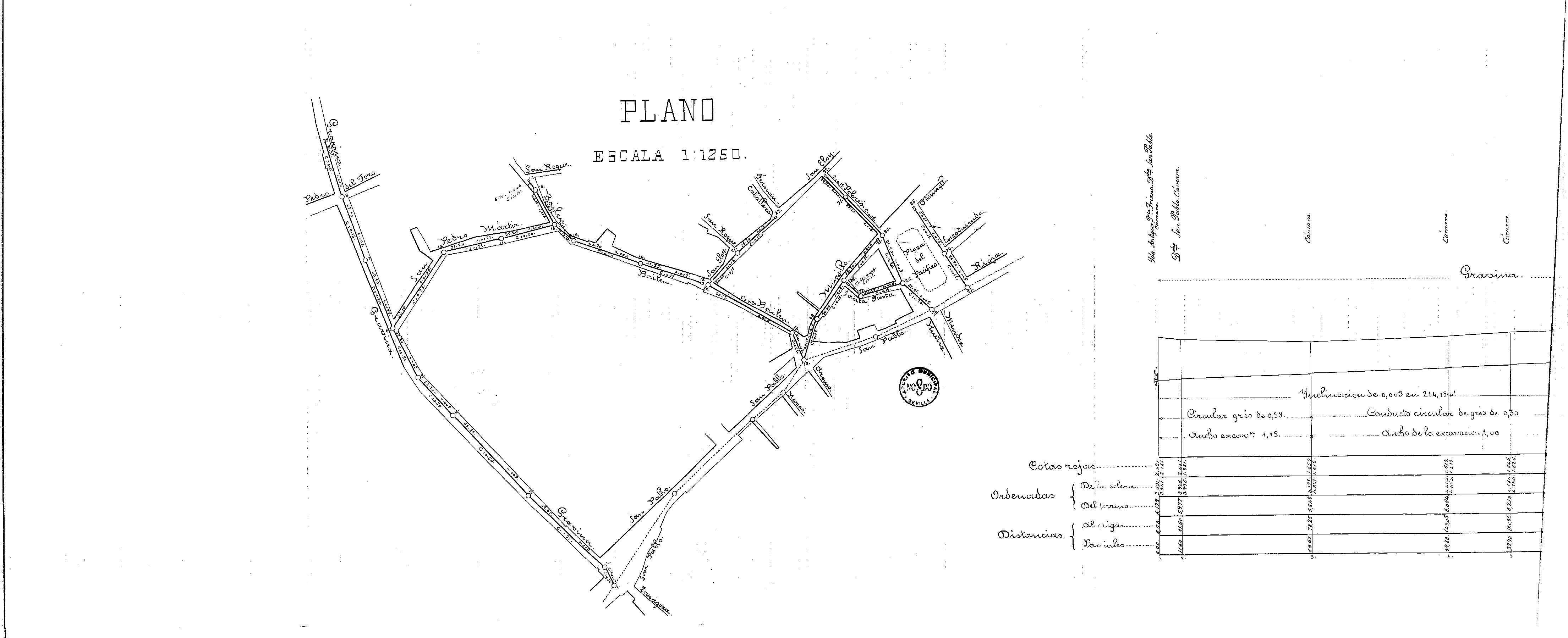 | 500 | ## | $aFirmas manuscritas, una de ellas ilegible y sellado | 500 | ## | $aSin orientar | 500 | ## | $aAl O del plano la calle Gravina; al E Rioja, al S Zaragoza y al N San Roque. En el plano se señala en rojo el recorrido y las medidas del colector por las calles Gravina, San Pedro Mártir, Bailén, San Eloy, Murillo, Santa Justa, Pobres y Plaza del Pacífico. Aparecen denominadas las calles adyacentes | 500 | ## | $aEn el plano hay 8 perfiles longitudinales a escala 1:1000 y escala vertical 1:100 | 500 | ## | $aGrapado a un pliego del que se toma parte del título |