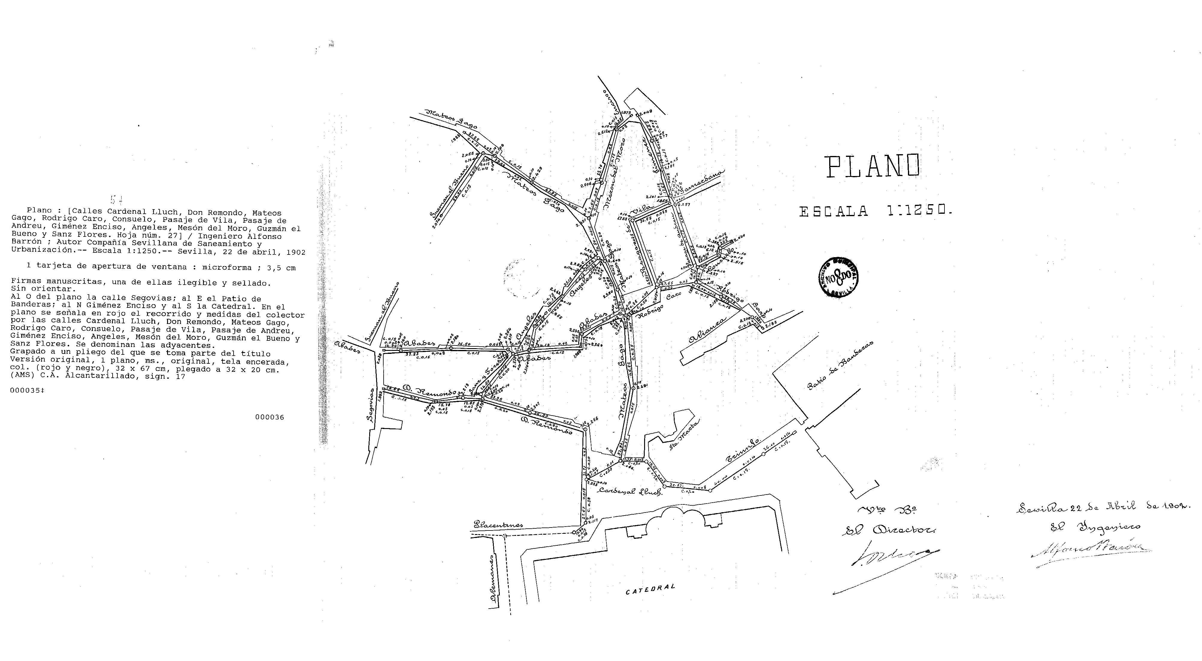 | 500 | ## | $aFirmas manuscritas, una de ellas ilegible y sellado | 500 | ## | $aSin orientar | 500 | ## | $aAl O del plano la calle Segovias; al E el Patio de Banderas; al N Giménez Enciso y al S la Catedral. En el plano se señala en rojo el recorrido y medidas del colector por las calles Cardenal Lluch, Don Remondo, Mateos Gago, Rodrigo Caro, Consuelo, Pasaje de Vila, Pasaje de Andreu, Giménez Enciso, Angeles, Mesón del Moro, Guzmán el Bueno y Sanz Flores. Se denominan las adyacentes | 500 | ## | $aGrapado a un pliego del que se toma parte del título |