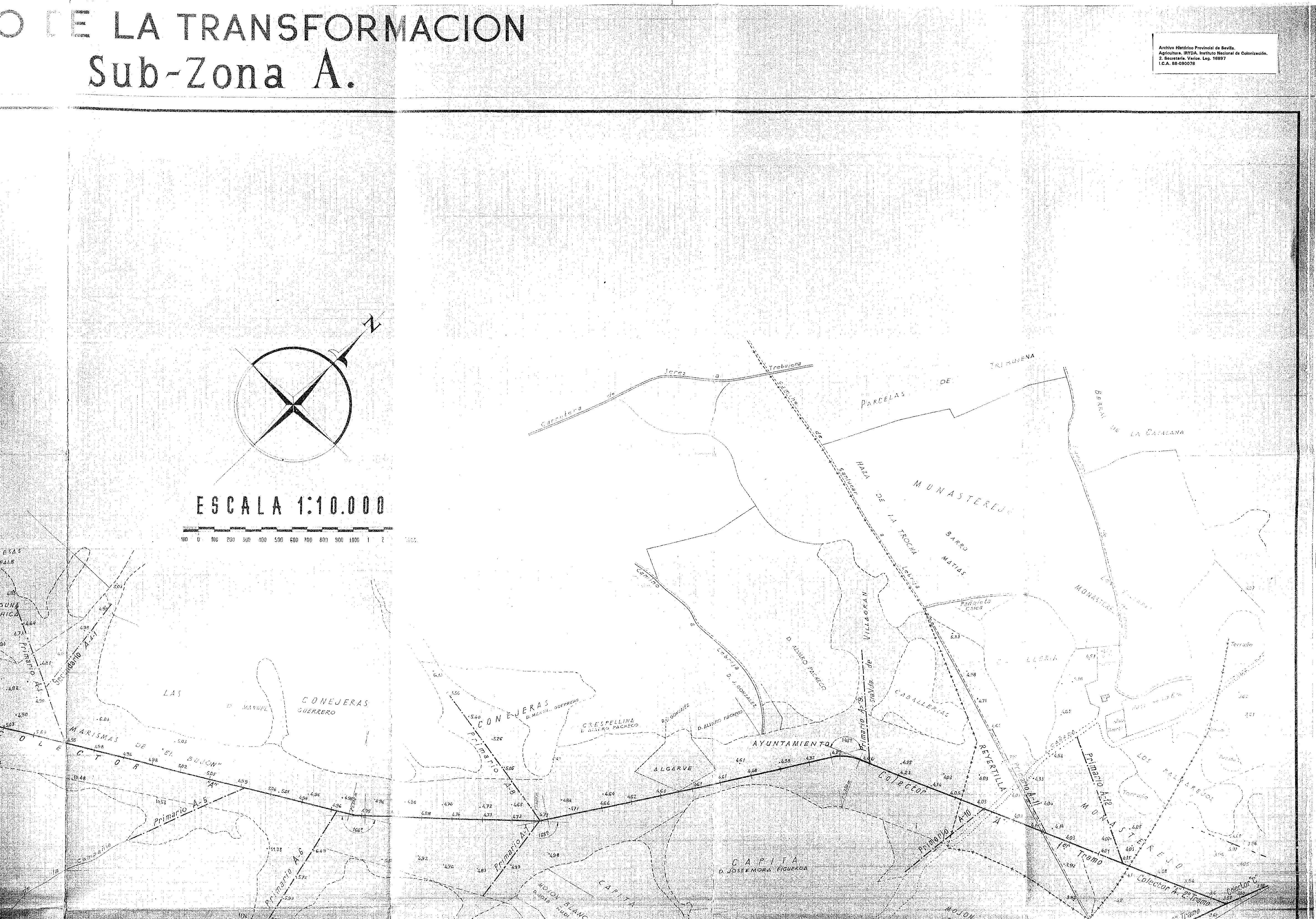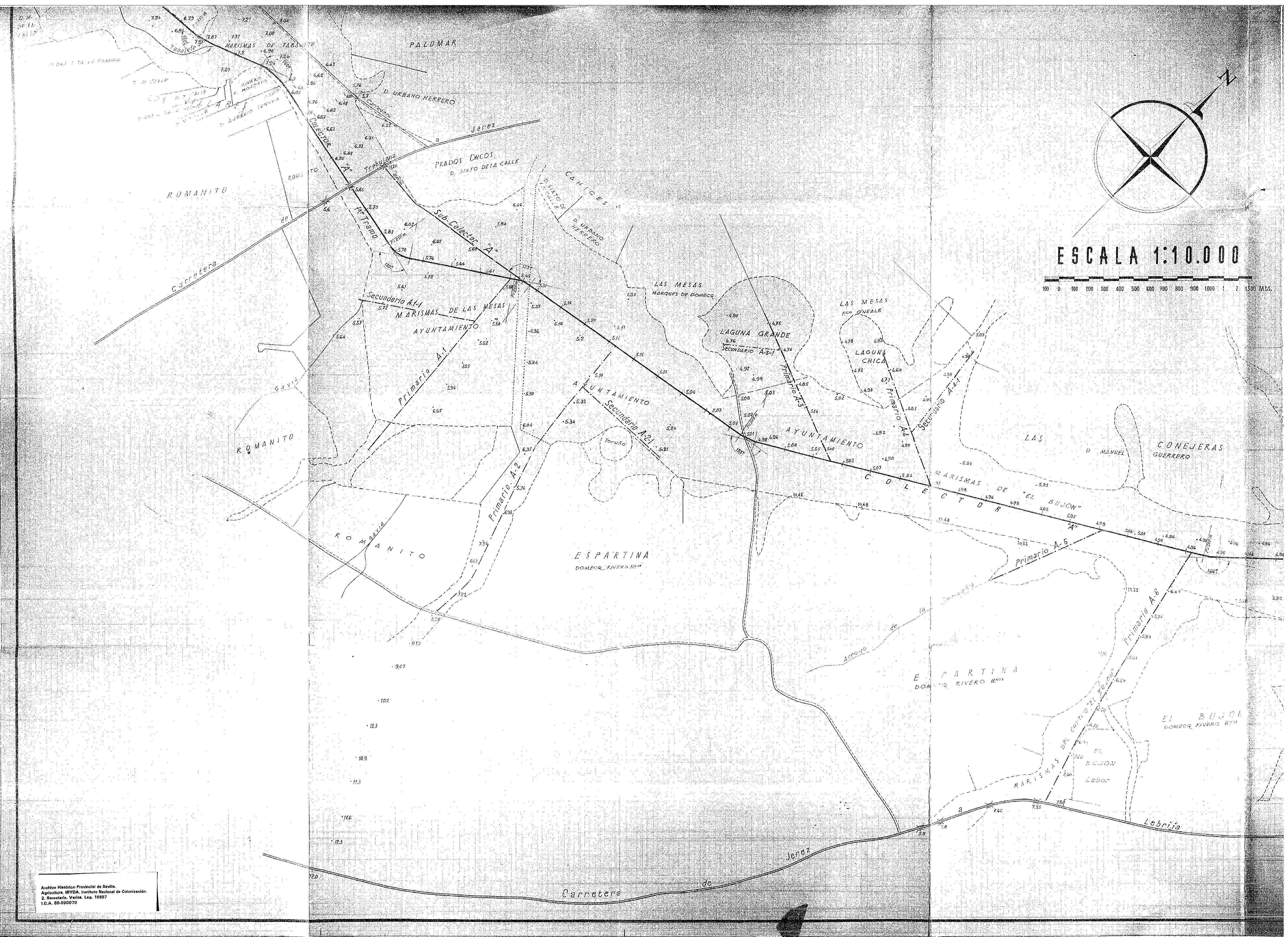 | 500 | ## | $aSecano. Marismas de Sanlúcar. Cádiz | 500 | ## | $aOrientado con el N al NE y escala gráfica | 500 | ## | $aIng. Agrónomo sin firmar | 500 | ## | $aAparece representada la zona desde el camino de Pozuelos en el cruce con la Cañada de Tabajete hasta Monasterejo, indicándose toponimia y las propiedades que son del Ayuntamiento. También red viaria y red hidrográfica bastante completa, zona de marismas, etc y sobre ésta, el colector principal y secundario con sus tramos y sectores y derivaciones con las numeraciones técnicas pertinentes |