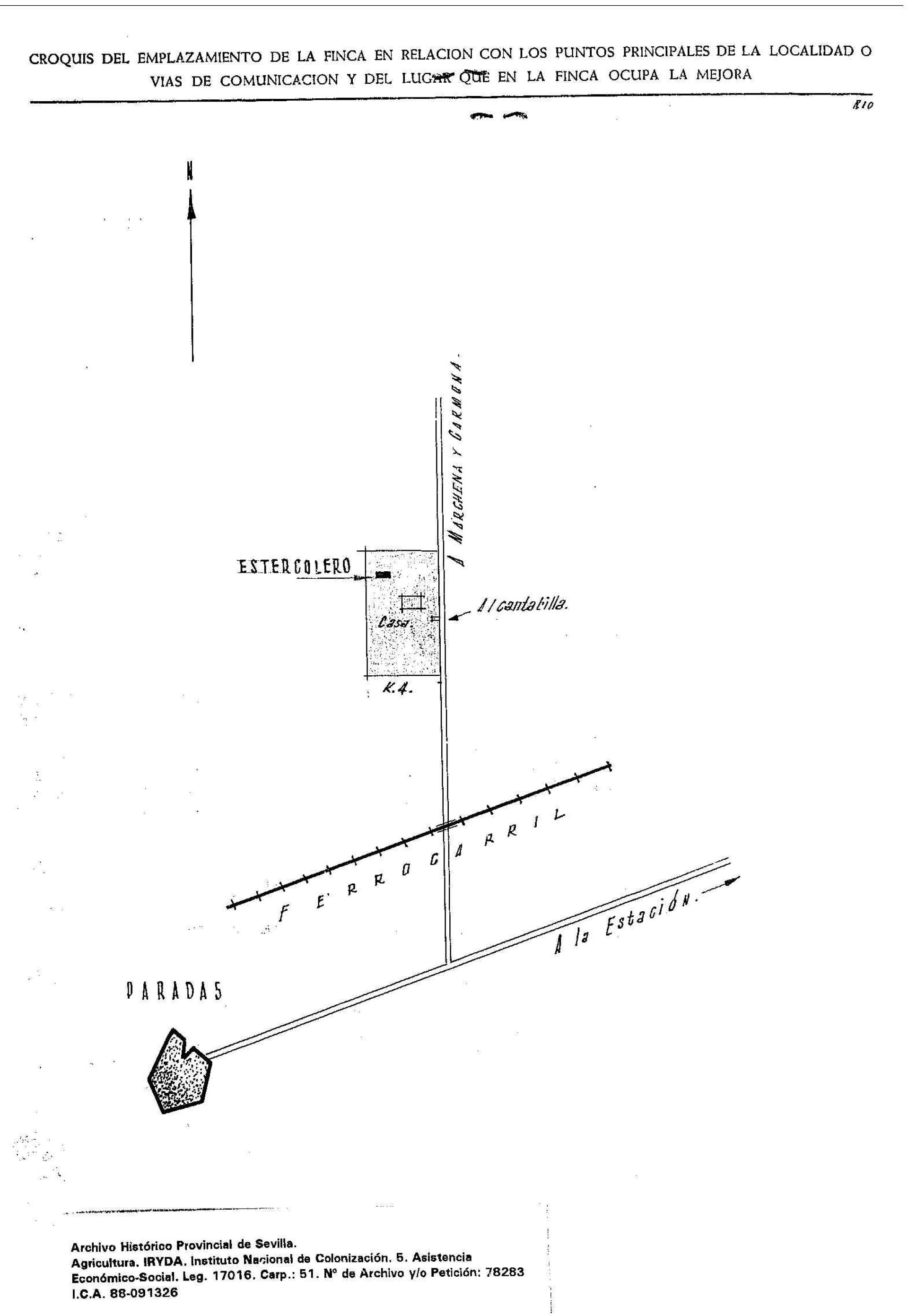 | 500 | ## | $aEn hoja del Informe del Inspector: Instituto Nacional de Colonización...Clase de mejora: Estercolero...Ing. Agrónomo D. Ricardo Bellas Rivera. Prto. Agrícola D. Francisco Guerra Delgado... | 500 | ## | $aOrientado con el N al N | 500 | ## | $aAparece localizada la finca en la ctra. a Marchena y Carmona a la que se accede por Cº a la Estación desde el núcleo de Paradas. En la finca se destaca alcantarilla y casa y el estercolero objeto de la mejora. También se indica que está en el pk.4 y línea de f.c. próxima |