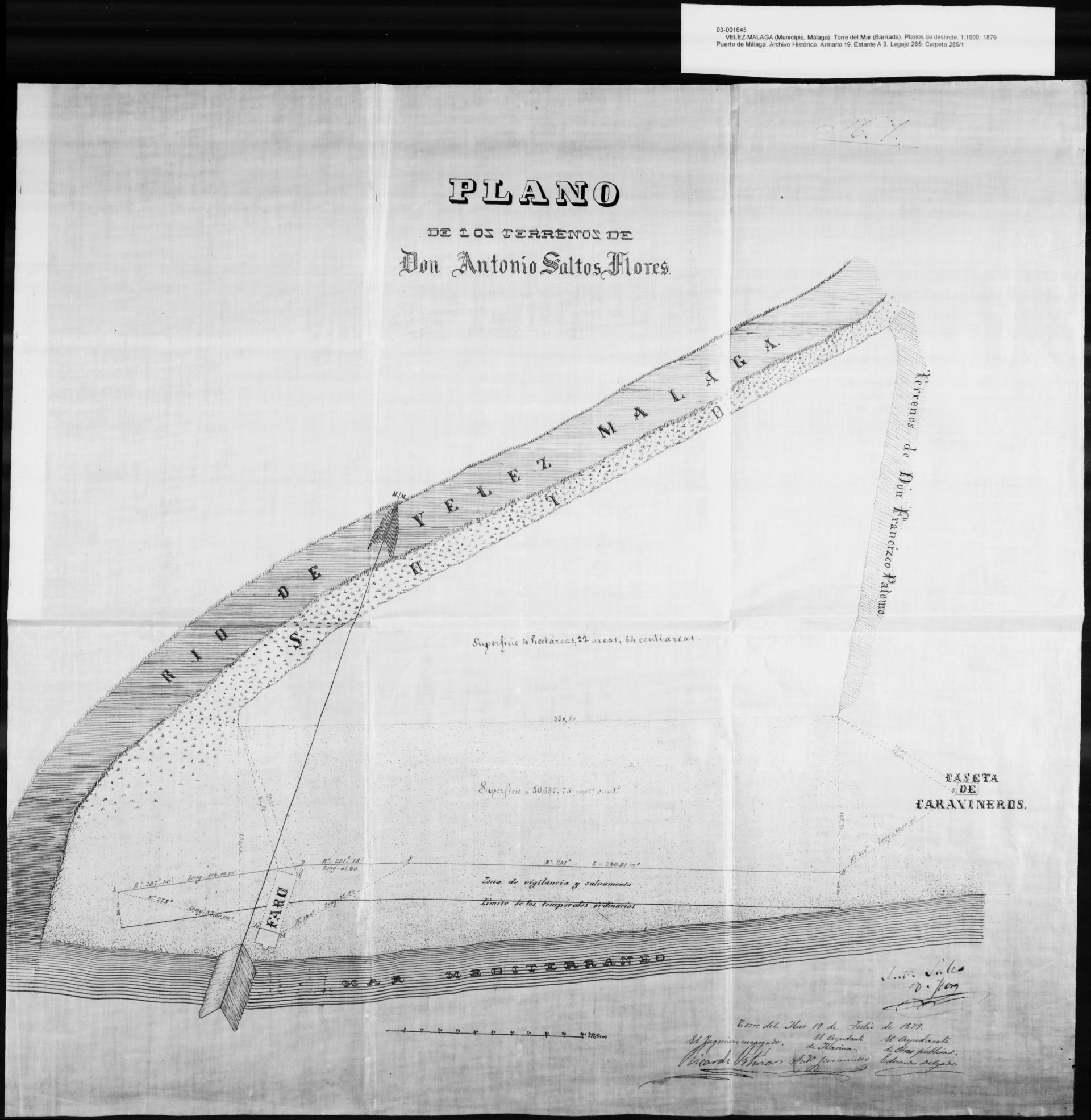 | 500 | ## | $aPlano de deslinde de una parte de los terrenos abandonados por D. Antonio Saltos Flores en la zona marítina de Torre del Mar, en el término municipal de Vélez-Málaga | 500 | ## | $aDescribe los límites de una parte de los citados terrenos y señala las longitudes y rumbos de una serie de visuales -referidas al faro y la caseta de carabineros de la localidad- y su superficie total, además de los límites de la zona de vigilancia y salvamento y de los temporales ordinarios | 500 | ## | $aDibuja, además, el cauce del río de Vélez-Málaga, en uno de cuyos márgenes se ha especificado la existencia de un soto | 500 | ## | $aFirmado por un ingeniero, encargado del deslinde, por dos ayudantes, uno de Marina y de la Jefatura de Obras Públicas provincial el otro, y por el titular de los terrenos abandonados | 500 | ## | $aOrientación Suroeste - Noreste (señala el N.M.) | 500 | ## | $aBuen estado de conservación | 500 | ## | $aPresentación del plano por duplicado |