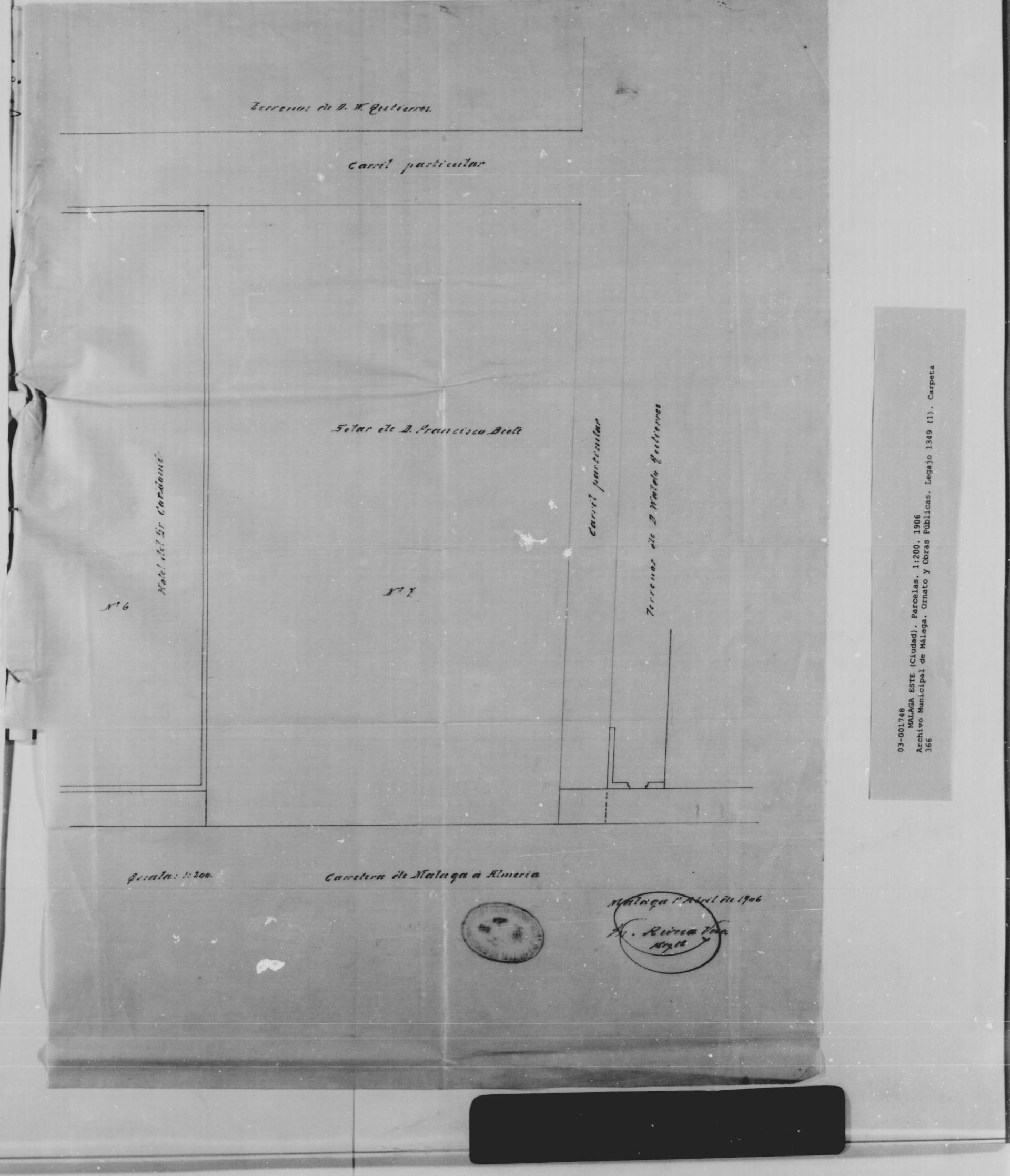 | 500 | ## | $aPlano de alineación de unos terrenos de propiedad particular en Málaga, perteneciente a un expediente para su cercado, de 1906 | 500 | ## | $aDelimita los terrenos que se pretende cercar y señala las propiedades anejas, todas ellas asomadas, como ésta, a la antigua carretera de Málaga a Almería (terrenos de D. Waldo Gutiérrez y hotel de D. Rafael Cordonié) | 500 | ## | $aFirmado y sellado por el Arquitecto Municipal | 500 | ## | $aBuen estado de conservación |