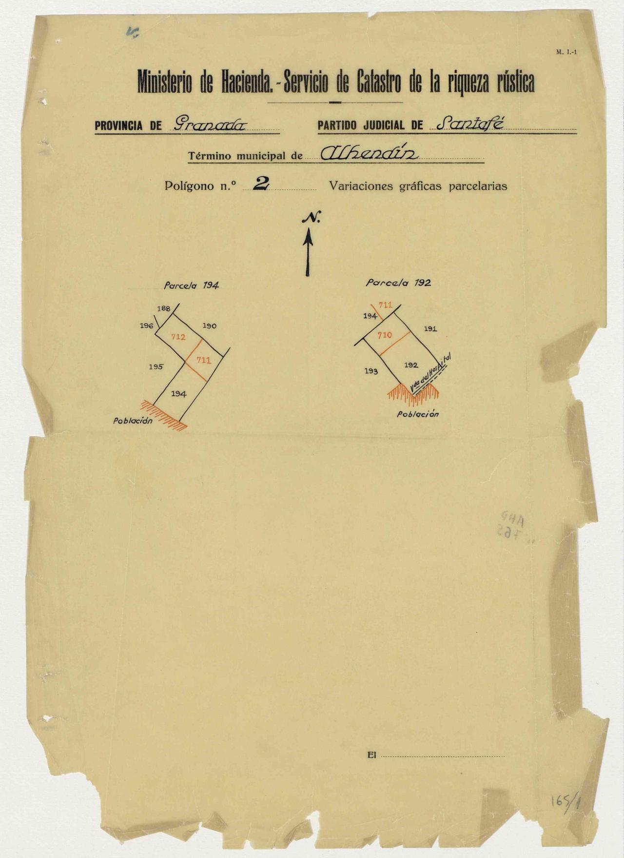 | 245 | ## | $aVariaciones gráficas parcelarias, Provincia de Granada, Partido Judicial de Santa Fe, Término municipal de Alhendín, Polígono nº 2 Parcela nº 194 y 192$cServicio de Catastro de la Riqueza Rústica |