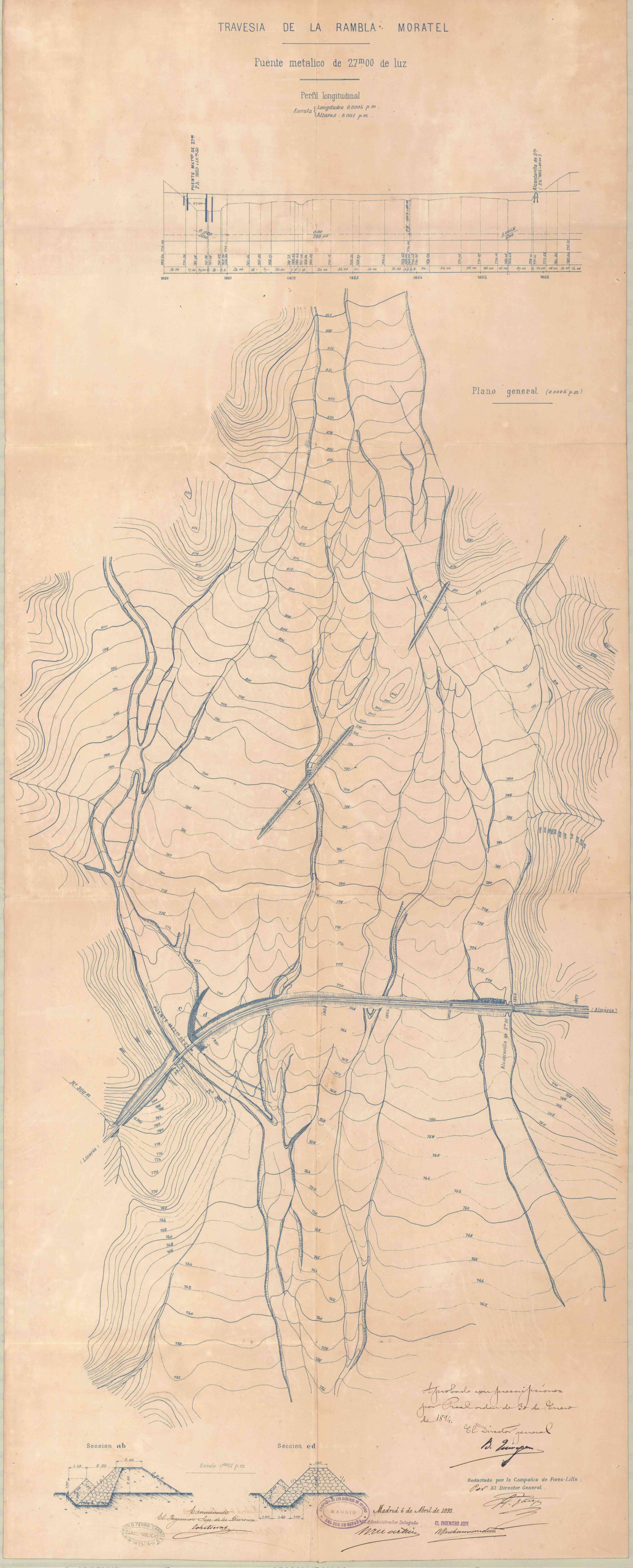 | 500 | ## | $aOrografía por curvas de nivel equidistantes a 2 metros | 500 | ## | $aEl plano general recoge la travesía de la rambla de Moratel, que se encuentra dentro del término municipal de Las Tres Villas, en la provincia de Almería, y en la que se proyecta la construcción de un puente metálico de 27 metros de luz a cruzar por la línea de Linares a Almería | 500 | ## | $aEl perfil longitudinal muestra el trazado de la travesía de la rambla de Moratel | 500 | ## | $aTanto en el plano general como en el perfil longitudinal aparece la localización del tramo de la línea de Linares a Almería que atraviesa la rambla; la rambla de Moratel; el puente metálico proyectado; y una alcantarilla que también atraviesa la línea | 500 | ## | $aSe incluyen también 2 secciones transversales | 500 | ## | $aEn: Compañía de los Caminos de Hierro del Sur de España: "Línea de Linares a Almería, proyecto de cruzamiento de la rambla de Moratel entre los piquetes kilométricos 1860 y 1866 de la línea por medio de un puente metálico de 27 metros de luz y una alcantarilla". 1893. Doc. 2 | 500 | ## | $aParte del título está tomado de la carpetilla que acompaña al plano, perfil longitudinal y secciones en el expediente | 500 | ## | $aEstá firmado por su autor; examinado, firmado y sellado por el Ingeniero Jefe de la Compañía de los Caminos de Hierro del Sur de España Rogelio de Inchaurrandieta Páez, y por el Administrador Delegado M. Martínez; y aprobado y firmado por el Director General, de firma ilegible | 500 | ## | $aEl plano general, perfil longitudinal y secciones transversales fueron aprobados con prescripciones por Real Orden de 30 de enero de 1894 | 500 | ## | $aLa Compañía de los Caminos del Hierro del Sur de España encargó la realización de este proyecto a la sociedad anónima francesa Compagnie de Fives-Lille pour Constructions Mécaniques & Entreprises, fundada en 1868 y desaparecida en 1958 al fusionarse con la sociedad Cail, creándose la Société Fives-Lille-Cail |