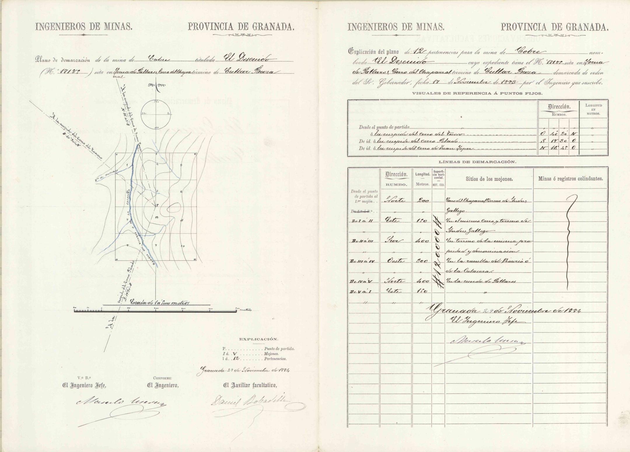 | 500 | ## | $aPlano de Demarcación, pertenencias: 12 | 500 | ## | $aOrientación con una flechas NM señalando al N y limbo de brújula | 500 | ## | $aAparecen pertenencias numeradas, mojones, curvas de configuración del relieve y punto de partida | 500 | ## | $aSitúa la rambla del Vicario de la Calavera | 500 | ## | $aCada una de las visuales de referencia a los distintos puntos fijos viene expresada en rumbos | 500 | ## | $aEn el margen inferior figura: expresión de escala, explicación de los signos convencionales aparecidos en el plano, lugar y fecha, firmas con mención de responsabilidad | 500 | ## | $aEn la mitad derecha de la hoja hay una explicación del plano incluyendo: número de pertenencias, nombre de la mina, situación, fecha de 17 de noviembre de 1883 que fue demarcada por orden del Gobernador, cuadros de visuales de referencia a puntos fijos y de líneas de demarcación con los puntos de partida, rumbos, longitud, superficie, situación de mojones y minas o registros colindantes, con fecha y firma del Ingeniero. | 500 | ## | $aEn el reverso de la hoja aparece el título y situación, número de expediente y Observaciones Facultativas acerca del limbo y declinación de la brújula y punto de partida, firmado por el Ingeniero | 500 | ## | $aDibujado sobre formato impreso |