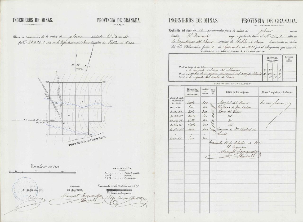 | 500 | ## | $aPlano de Demarcación, pertenencias: 15 | 500 | ## | $aOrientación con dos flechas NM y NV señalando al N, una desviación entre ellas de 15º y 15' | 500 | ## | $aAparecen pertenencias numeradas, mojones, curvas de configuración del relieve y punto de partida | 500 | ## | $aSitúa el límite con la provincia de Almería | 500 | ## | $aCada una de las visuales de referencia a los distintos puntos fijos viene expresada en rumbos | 500 | ## | $aEn el margen inferior figura: expresión de escala, explicación de los signos convencionales aparecidos en el plano, lugar y fecha, firmas con mención de responsabilidad y sello de "Ingenieros de Minas-Provincia de Granada | 500 | ## | $aEn la mitad derecha de la hoja hay una explicación del plano incluyendo: número de pertenencias, nombre de la mina, situación, fecha de 1 de septiembre de 1897 en que fue demarcada por orden del Gobernador, cuadros de visuales de referencia a puntos fijos y de líneas de demarcación con los puntos de partida, rumbos, longitud, superficie, situación de mojones y minas o registros colindantes, con fecha y firma del Ingeniero. | 500 | ## | $aEn el reverso de la hoja aparece el título y situación, número de expediente y Observaciones Facultativas acerca del limbo y declinación de la brújula y punto de partida, firmado por el Ingeniero | 500 | ## | $aDibujado sobre formato impreso | 500 | ## | $aLa mención de responsabilidad de Auxiliar Facultativo está tachada y cambiada por Auxiliar Temporero |