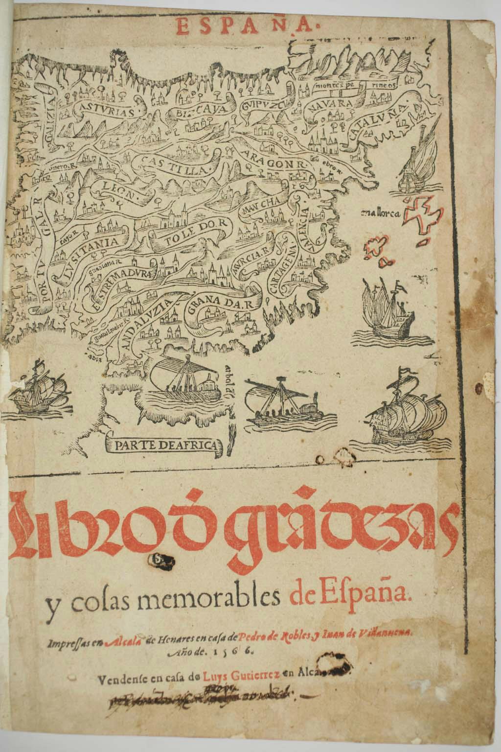 | 500 | ## | $aAparece en la primera página de título, seguida de otra portada con la figura del escudo de la Corona española | 500 | ## | $aVuelve a reproducirse en varias otras ediciones, como en la Alcalá de Henares: Pedro de Robles y Juan de Villanueva, 1566, más frecuente | 500 | ## | $aDe trazado muy sencillo y básico, con filacterias para el título y los distintos reinos y regiones distribuidas en el campo del mapa, presenta el particular interés de estar considerado el primer mapa de la Península Ibérica impreso en España, precisamente en un taller de Andalucía, en la ciudad de Sevilla | 500 | ## | $aEn: Libro de grandezas y cosas memorables de España | 500 | ## | $aMapa de España en xilografía de trazado muy sencillo y básico, con filacterias para el título y los distintos reinos y regiones, aparece como frontispicio del tratado "Libro de grandezas y cosas memorables de España" del erudito y cosmógrafo sevillano Pedro de Medina, impreso en Sevilla por Domenico de Robertis en 1548 y 1549. Presenta el particular interés de estar considerado el primer mapa de la Península Ibérica impreso en España, precisamente en un taller de Andalucía, en Sevilla, insertándose además en un libro de un autor natural de esta ciudad. En la imagen se inscriben los rótulos de "Andaluzia" y reino de Granada. Vuelve a reproducirse en varias ediciones, como la de Alcalá de Henares de Pedro de Robles y Juan de Villanueva, 1566, más frecuente |