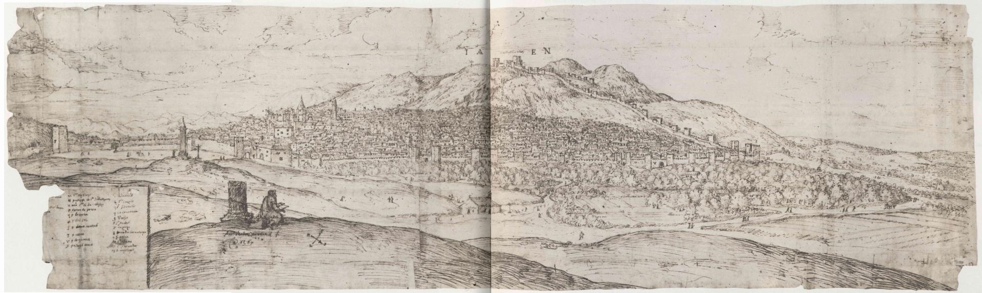 La ciudad se representa en una vista panorámica elevada, desplegada horizontalmente. Wyngaerde opta por una mirada amplia desde las afueras, donde pueden verse con claridad los límites urbanos, las murallas, elementos religiosos, y el entorno montañoso circundante.