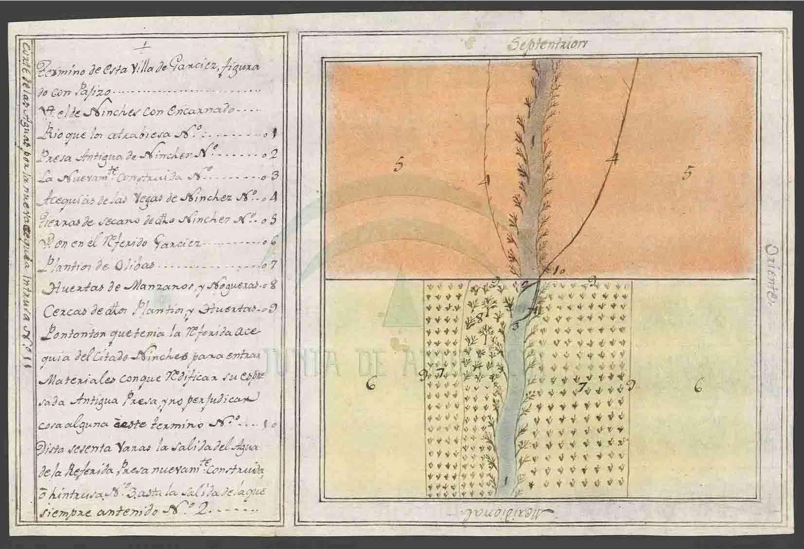 | 500 | ## | $aOrientado | 500 | ## | $aHidrografía | 500 | ## | $aVegetación representada | 500 | ## | $aEn el margen izquierdo tabla numérica para indicar lugares en el mapa | 500 | ## | $aPertenece al pleito ARCHGR 12250-2 "Miguel Jerónimo Ponce de León Mesia Quesada y Toledo, Conde de Garciez, vecino de Baeza, contra Francisco de Armijo Altamirano, curador de Ignacio de Armijo Quesada y Benavides, señor de Ninchez, sobre despojo de aguas del río Garciez y construcción de una presa para el riego del heredamiento de Ninchez" 1753-1806 | 500 | ## | $aColoreado a mano | 500 | ## | $aMención de fecha tomada del pleito |