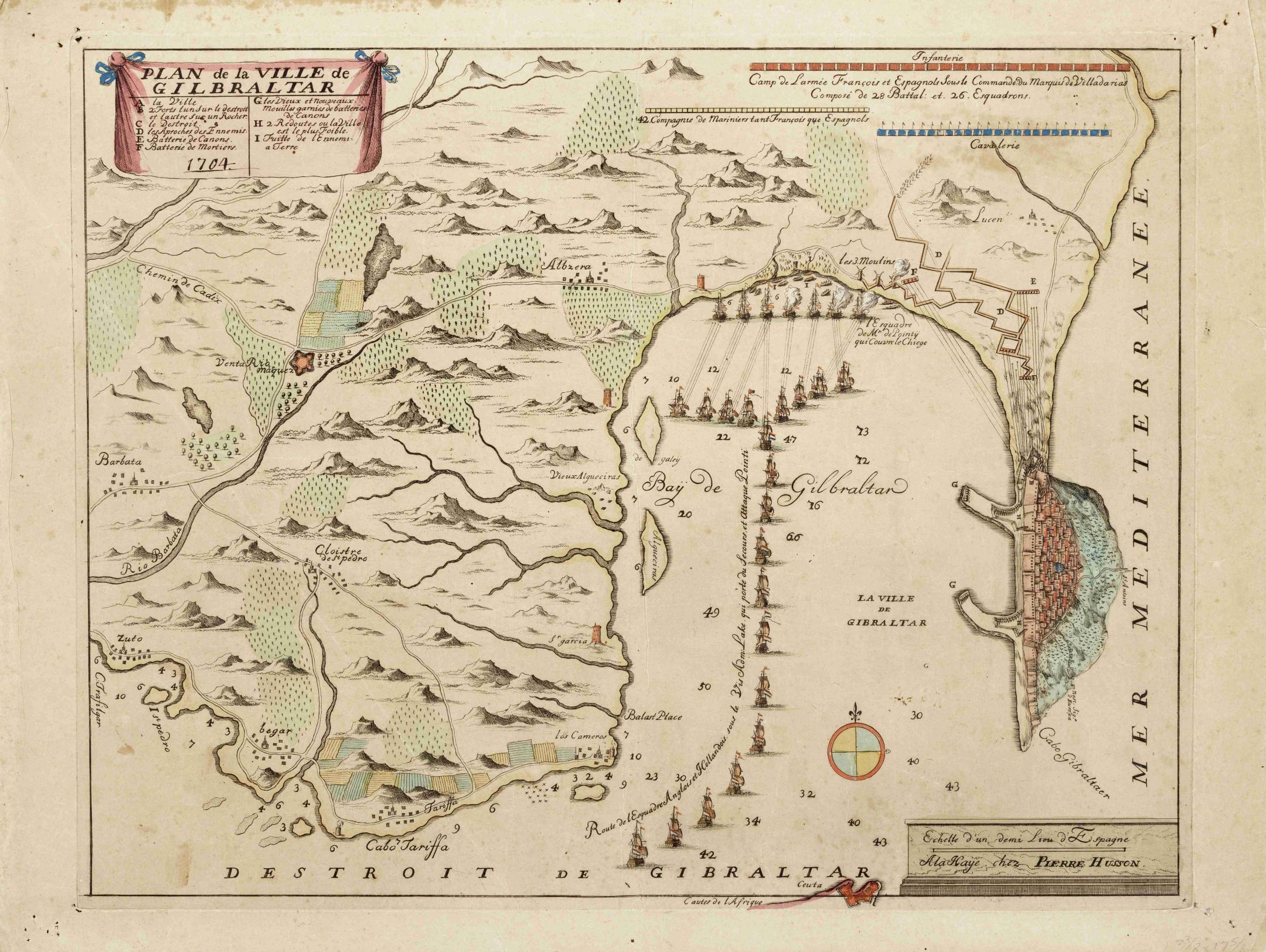 | 500 | ## | $aGrabado calcográfico iluminado con un mapa que comprende el peñón de Gibraltar y la bahía de Algeciras. En la estampa se representan las operaciones emprendidas por las fuerzas navales y terrestres del marqués de Villadarias entre 1704 y 1705 para intentar recuperar Gibraltar para Felipe V después de su ocupación por los ingleses. Se acompaña de una leyenda con 9 referencias de lugares, baterías y puntos de interés. Forma parte de un pliego en el que figuraba asimismo una vista de perfil del Peñón de Gibraltar tomada desde el oeste en la parte superior (Aftekening van Gibraltar), que no figura en este ejemplar, en el que se ha recortado el mapa, dejándolo suelto. Podría pertenecer a alguno de los atlas confeccionados por el editor y comerciante de cartografía holandés establecido en La Haya Pierre o Pieter Husson, como la recopilación titulada Diverses cartes de géographie, où l'on peut voir le Théâtre de la Guerre dans tout le monde., publicada en 1709, circulando asimismo como grabado suelto. En la Colección Antonio Viñas de Roa hay dos ejemplares de esta estampa |