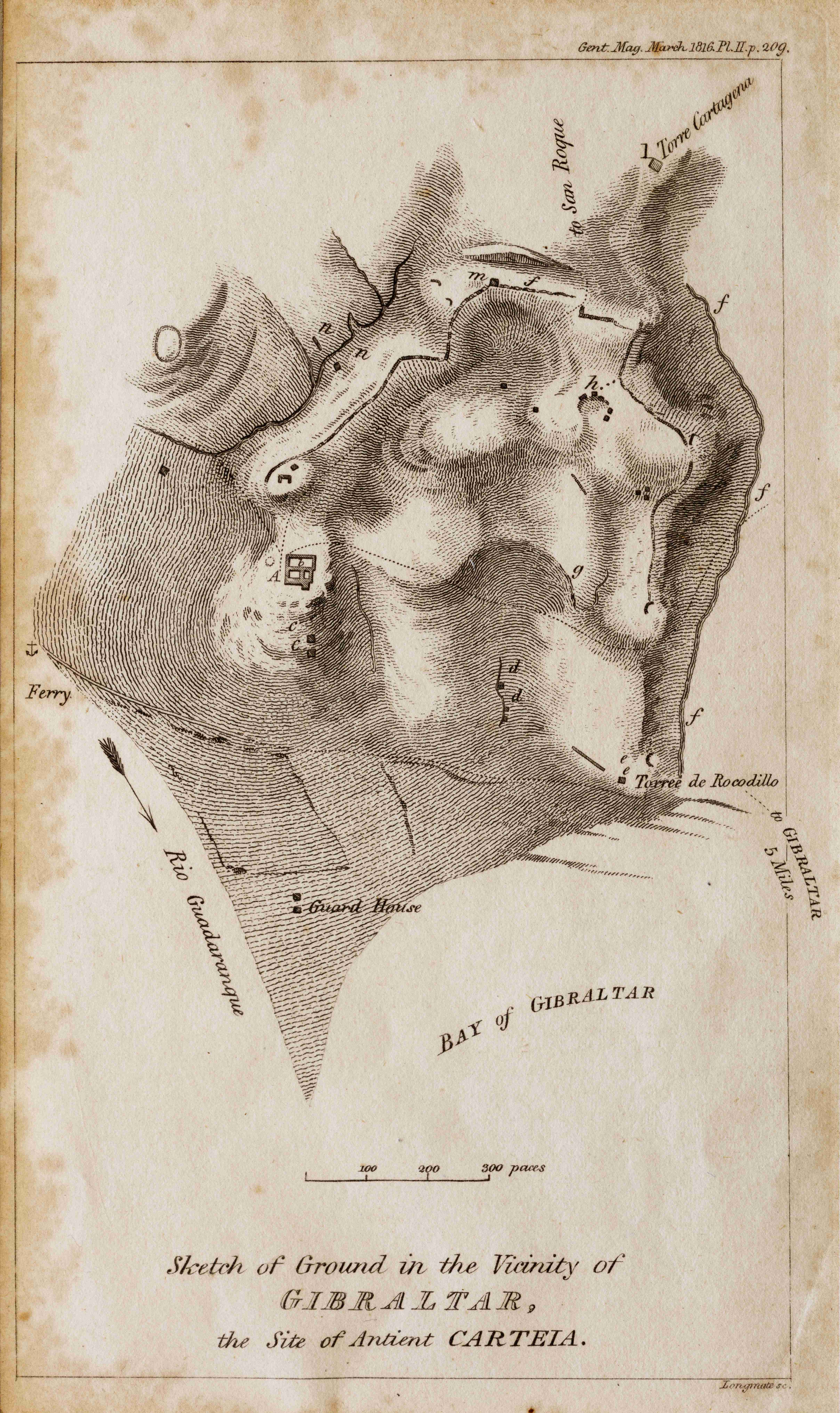 | 500 | ## | $aPequeño esquema cartográfico del yacimiento arqueológico de Carteia y sus alrededores aparecido en el número LXXXVI, parte 1, de 1816 de la publicación periódica londinense The Gentleman's Magazine , para ilustrar un breve artículo titulado Account of antient Carteia, and its Remains, firmado por el seudónimo de Calpensis. Aporta interesante información acerca del solar y el trazado de la muralla de este recinto de la Antigüedad |