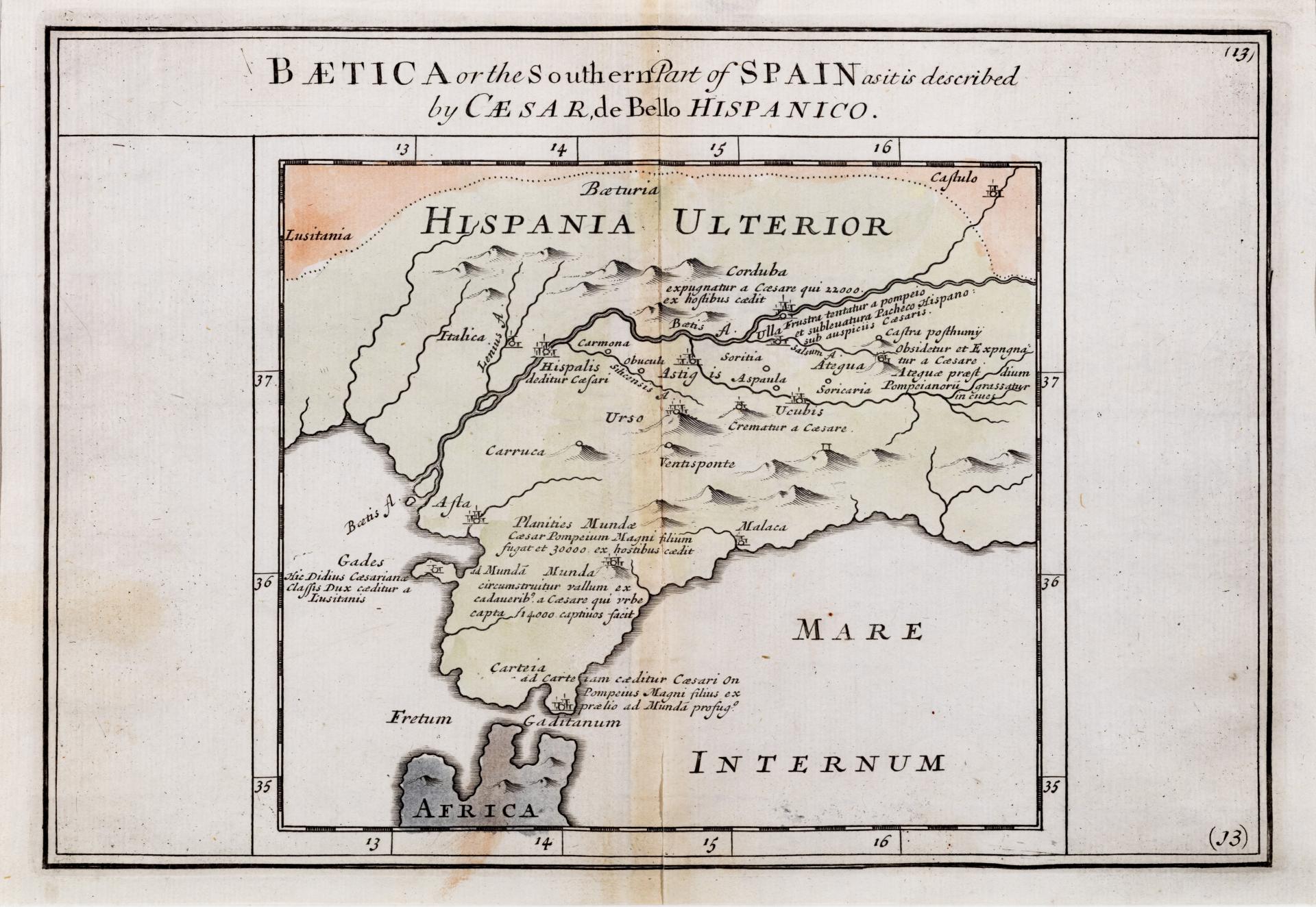 | 500 | ## | $aGrabado calcográfico iluminado de un mapa de reducidas dimensiones de la provincia Bética romana con la localización de las poblaciones y lugares que configuraron el escenario de los enfrentamientos entre César y el partido de Pompeyo a mediados del siglo I a. C., según el relato del libro De Bello Hispanico o Hispaniensi. Pertenece al atlas educativo editado por el holandés afincado en Inglaterra Herman Moll bajo el título Geographia classica: The Geography of the Ancients. in twenty nine maps of the Old World, obra impresa en Londres por Christopher Browne y Benj. Tooke en 1712, con siete reediciones posteriores hasta 1747, una de ellas impresa en Dublín en 1736. El mapa corresponde al número 13 de los 29 que contenía el atlas. De sencilla y escueta factura, entre las poblaciones que reseña se encuentra Itálica. De escasa originalidad, el mapa es copia literal del que publico´ en Pari´s a partir de 1656 el geo´grafo france´s Pierre Duval, en sus repertorios cartográficos, como Diverses cartes et tables pour la geographie ancienne |