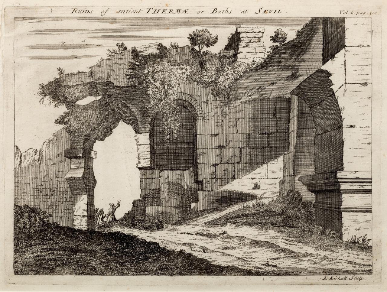 | 500 | ## | $aVista en grabado calcográfico de un paraje de difícil ubicación de Sevilla, que según la leyenda que acompaña a la imagen y ciertas referencias en la obra de la que procede correspondería a las ruinas de unas termas o baños ubicados en las cercanías de la iglesia parroquial de San Ildefonso, en el centro del casco antiguo de Sevilla. Según A. Canto, podría tratarse también de los vestigios de construcciones soterradas en las proximidades de la iglesia de San Nicolás y las columnas de la calle Mármoles, también en el área central y de mayor potencia arqueológica del casco histórico de la capital hispalense. En todo caso, se trataría de unos restos que quedarían por completo arruinados con posterioridad, a raíz de los graves daños del terremoto de 1755 | 500 | ## | $aEste grabado de fina ejecución pertenece al volumen II de la obra del erudito inglés John Durant Breval Remarks on Several Parts of Europe, compendio histórico-geográfico publicado en Londres en 1726 con grabados al aguafuerte, como este, varios de ellos debidos al prolífico y experimentado grabador inglés Elisha Kirkall. Activo viajero que visitó varias veces el sur de la Península en las primeras décadas del Setecientos, Breval habría sido probablemente el autor de los apuntes que habrían servido para la incisión de esta estampa. |