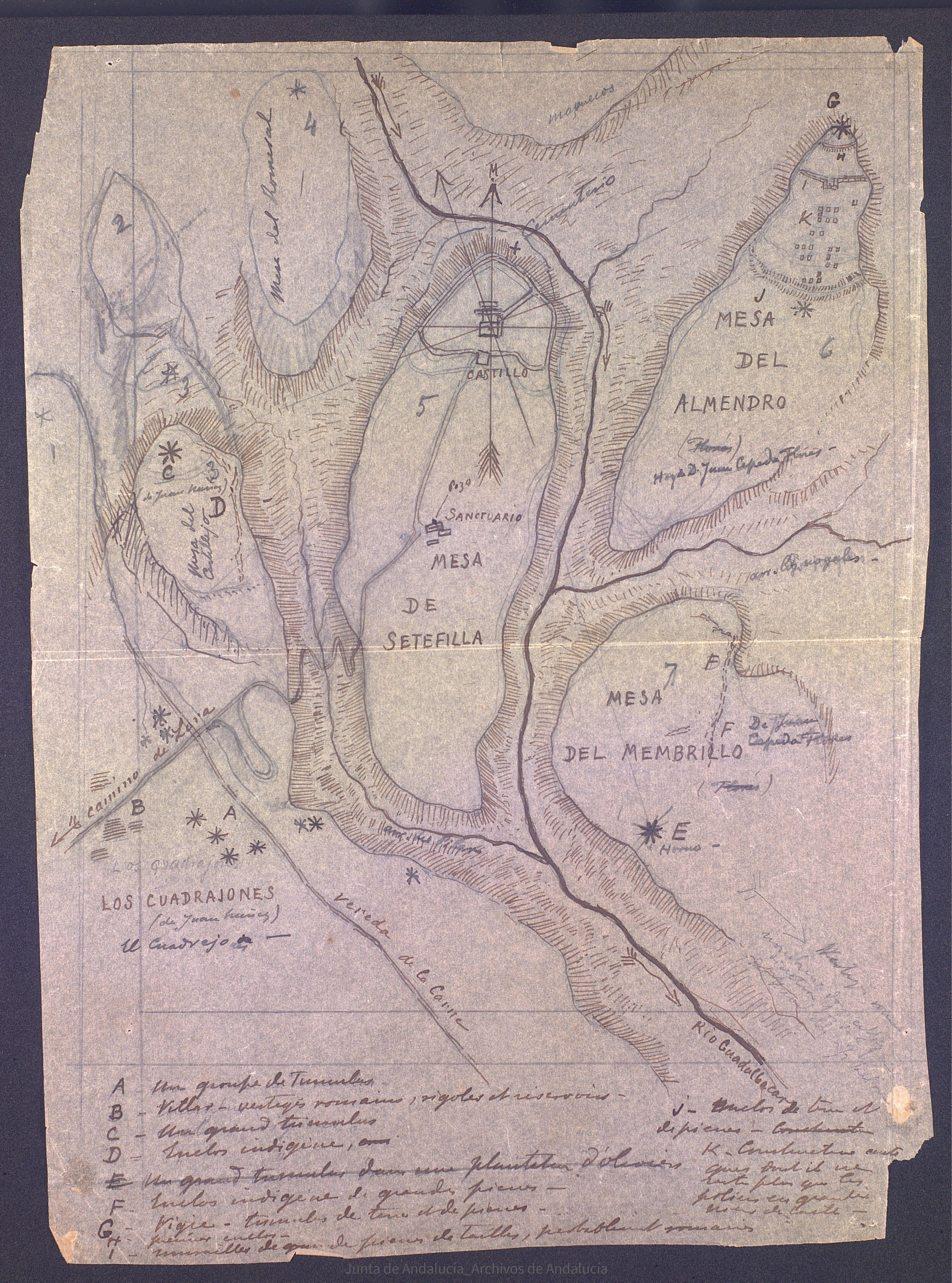 Mesas: El plano muestra diferentes áreas elevadas o mesas, como "Mesa de Setefilla," "Mesa del Almendro" y "Mesa del Membrillo." Estas mesas son elevaciones naturales o artificiales del terreno donde se desarrollaron actividades importantes.