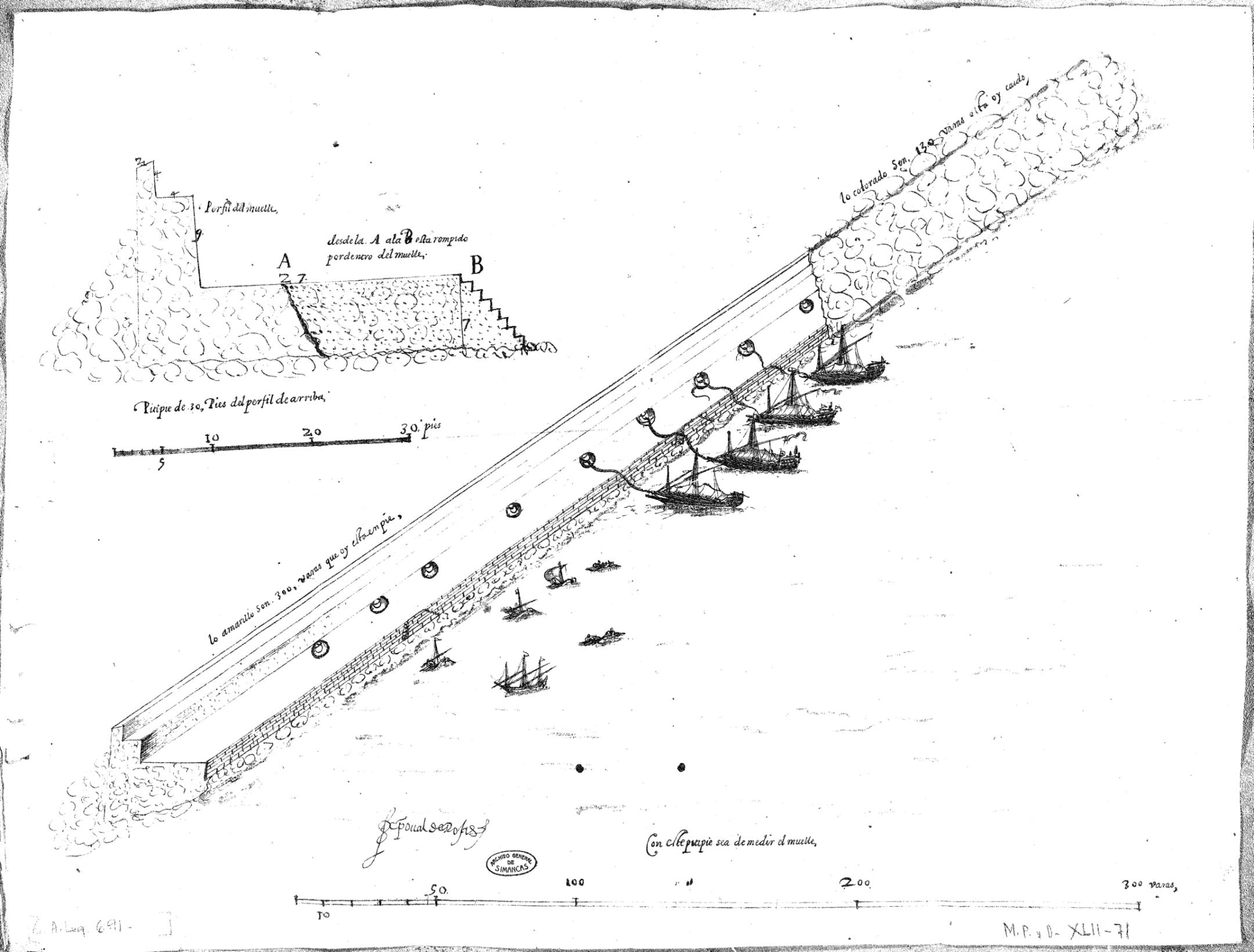 | 500 | ## | $aConsta de una perspectiva escala [ca. 1:451], 300 varas [= 37 cm], y de una sección a escala [ca. 1:64], 30 pies [= 13 cm] | 500 | ## | $aTítulo facticio redactado a partir del contenido del documento | 500 | ## | $aManuscrito firmado y rubricado por el autor | 500 | ## | $aFechado en Sanlucar el 30 de junio de 1608. Dato tomado del "Catálogo de mapas, planos y dibujos", vol. II, del AGS | 500 | ## | $aIntercala breves explicaciones | 500 | ## | $aEn el verso. "Planta del muelle de Gibraltar con carta delyngeniero xpobalde Roxas de 30 de Junio de 1608 | 500 | ## | $aRealizado a tinta sepia e iluminado en azul, rojo y amarillo |