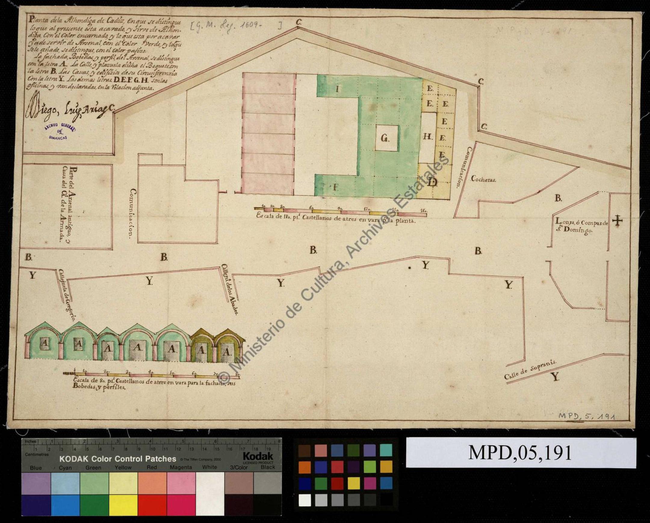 | 500 | ## | $aComprende además todas las calles adyacentes | 500 | ## | $aFecha tomado del "Catálogo de Mapas, Planos y Dibujos". AGS V.I, pag. 204 | 500 | ## | $aManuscrito firmado y rubricado por el autor | 500 | ## | $aEscala gráfica de 180 toesas [= 13,5 cm] | 500 | ## | $aRelación de las edificaciones que rodean la Alhóndiga identificadas por clave alfabética | 500 | ## | $aDibujado a tinta y coloreado con acuarela verde, rosa, amarilla y marrón | 500 | ## | $aFachada, bóvedas y perfiles: Escala [ca. 1:489], 80 pies castellanos [= 13,7 cm] |