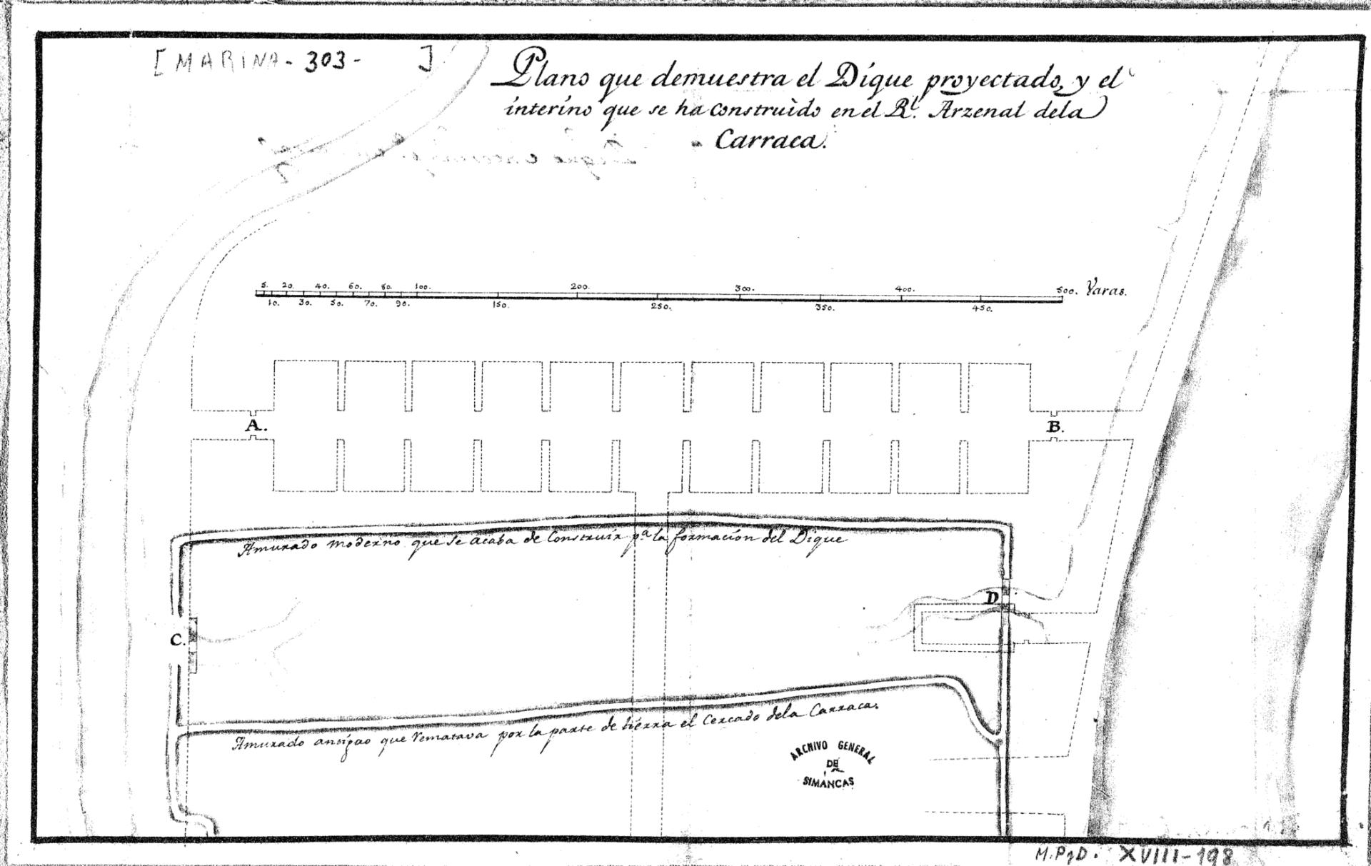 | 500 | ## | $aFechado en la Carraca, 6 de abril de 1732. Dato tomado del "Catálogo de Mapas, Planos y Dibujos" AGS V.I,pag. 269 | 500 | ## | $aEscala gráfica de 500 varas [= 22,1 cm] | 500 | ## | $aDibujado a tinta y coloreado con acuarela verde, amarilla y gris | 500 | ## | $aEn verso: "Dique Ynterinopa. Madera |