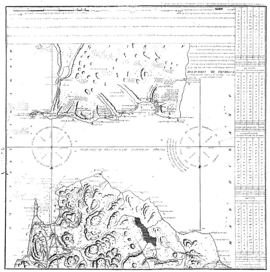 | 500 | ## | $aEscala gráfica de 5 leguas de una hora de camino o a 6000 varas cada una [= 11´4 cm] | 500 | ## | $aOrientado con dos rosas de los vientos y lises. La de la derecha muestra el nombre de los ocho vientos que usan los marineros del mar Mediterráneo, la de la izquierda representa el nombre de los ocho vientos que usan los marineros del océano | 500 | ## | $aOrografí0a por sombreado. Se indican veriles y fondeaderos | 500 | ## | $aConstan varias leyendas con la explicación de algunos hechos históricos | 500 | ## | $aEn el lateral izquierdo 4 tablas que reflejan datos sobre las mareas | 500 | ## | $aEn la parte inferior del documento se indica "Se hallará en la calle del Ave Maria, casa de los Naturales, quarto segundo y frente de S. Bernardo | 500 | ## | $aDescripción Cartográfica: Comprende la costa de Cádiz desde Conil hasta el río Guadiano, el norte de Marruecos y el estrecho de Gibraltar. El margen izquierdo está ocupado por diversas tablas de mareas y en el inferior una sola nota sobre las mareas, los signos convencionales y la escala gráfica en varas. Encima, y a la izquierda, el título y autor de la carta, además de una nota explicativa sobre la utilidad de las tablas de marea y sobre la información del mapa. Relieve representado por normales y cotas batimétricas. Planimetría con ciudades representadas por agrupación de edificios, red de comunicaciones, tierras de labor y masas de arbolado. La hidrografía representa la desembocadura de los ríos de la zona, con denominación de algunos de ellos. La costa aparece realzada con normales, bajíos y fondeaderos. En el mar, dos rosas náuticas con veinticuatro vientos, con su denominación, y flor de lis indicando el N.. Figura una serie de flechas indicando el sentido de la corriente en la zona norte del Estrecho. En la zona del norte de África aparecen tres apuntes históricos. Datado durante el reinado de Carlos III (1759-1788) |